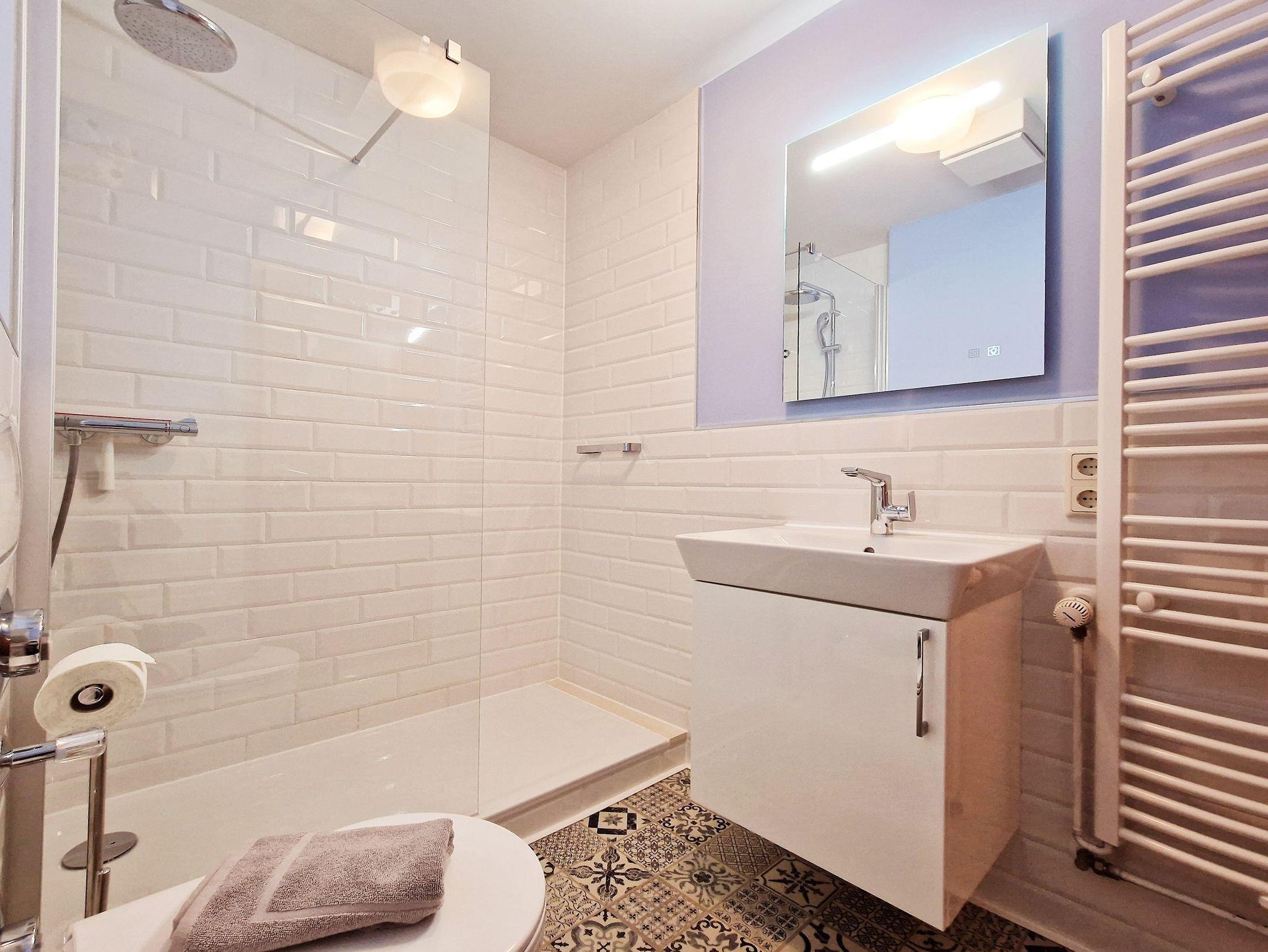 Das Bad ist modern mit Dusche, WC und einer Waschmaschine ausgestattet.