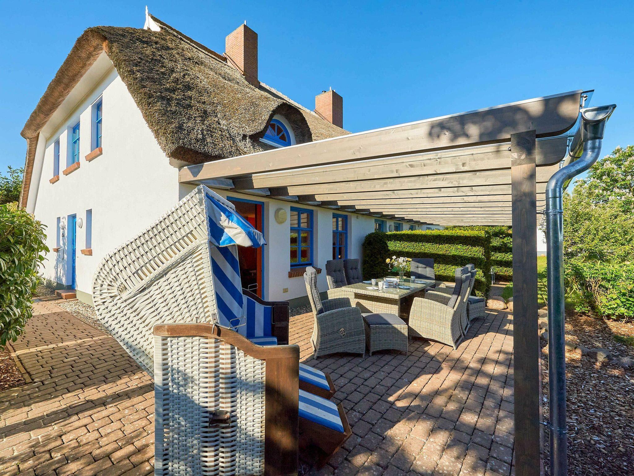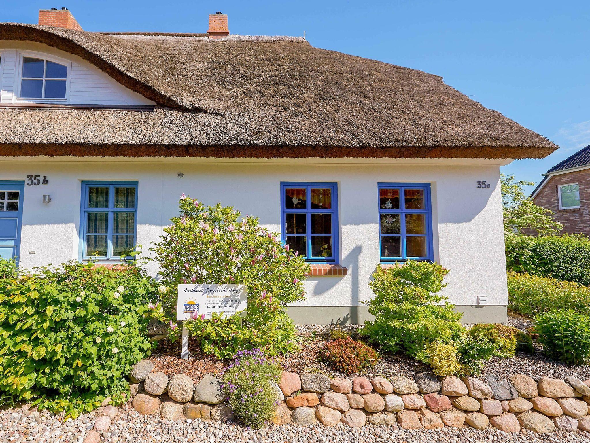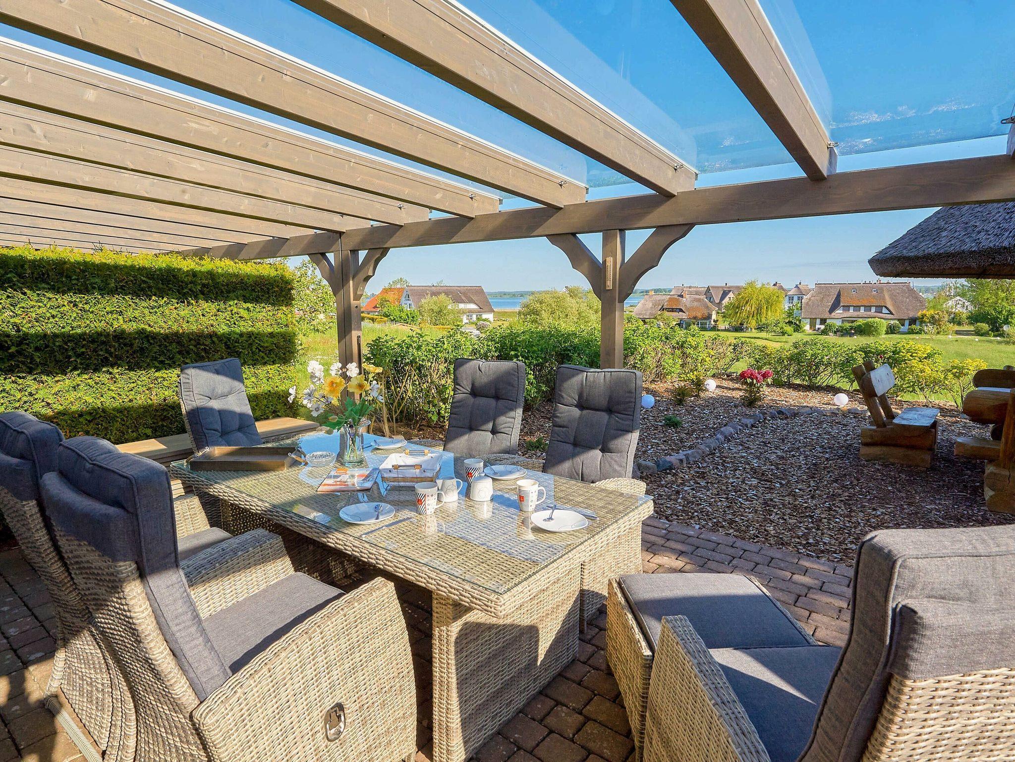 Zu den besonderen Highlights Ihres Urlaubsdomizils zählt ganz sicher die gemütliche möblierte, ca. 37 m² große und teilweise überdachte Terrasse zur Nord-West-Seite. Hier auf der Terrasse, im kuscheligen Strandkorb oder auf dem angrenzenden rustikalen Freisitz unterm Reetschirm lässt es sich wunderbar entspannen und den herrlichen Blick auf den nahen Bodden genießen.