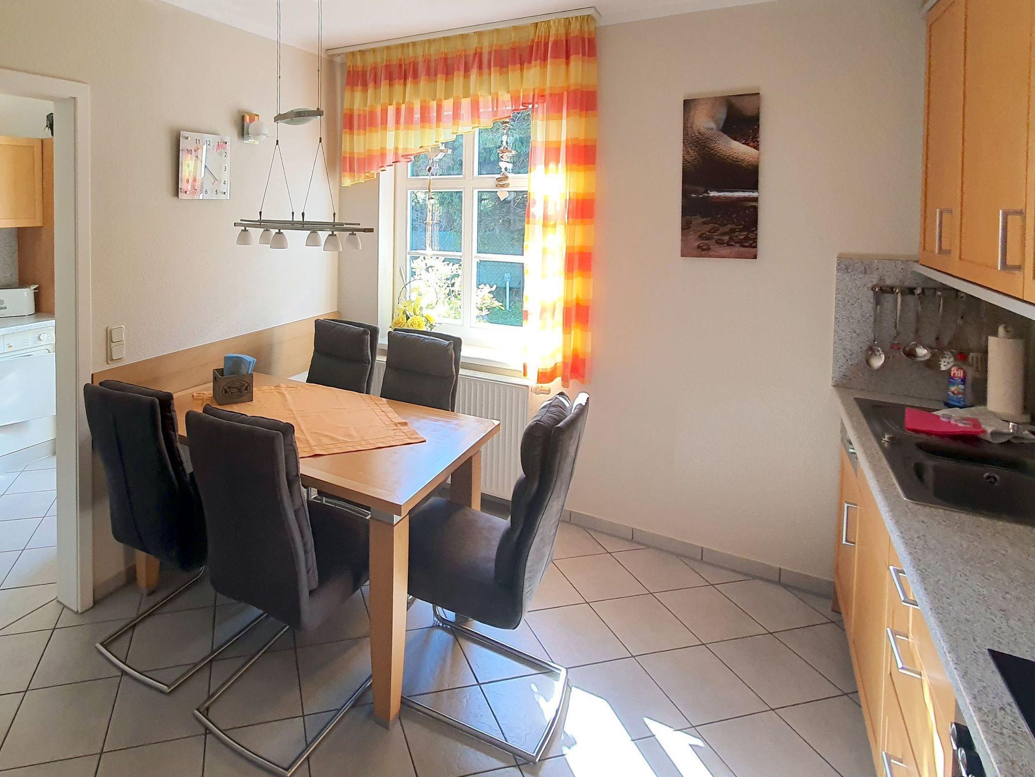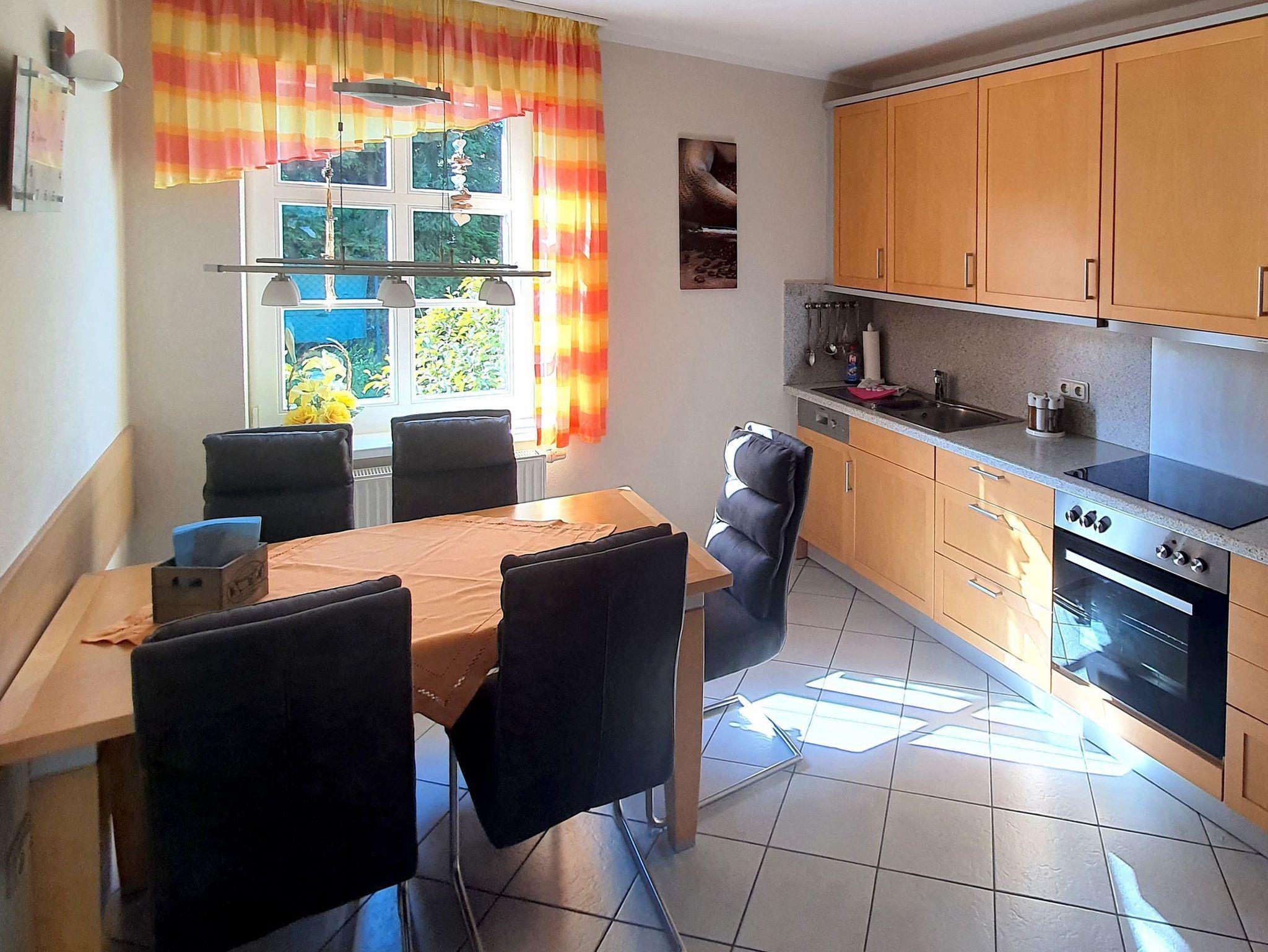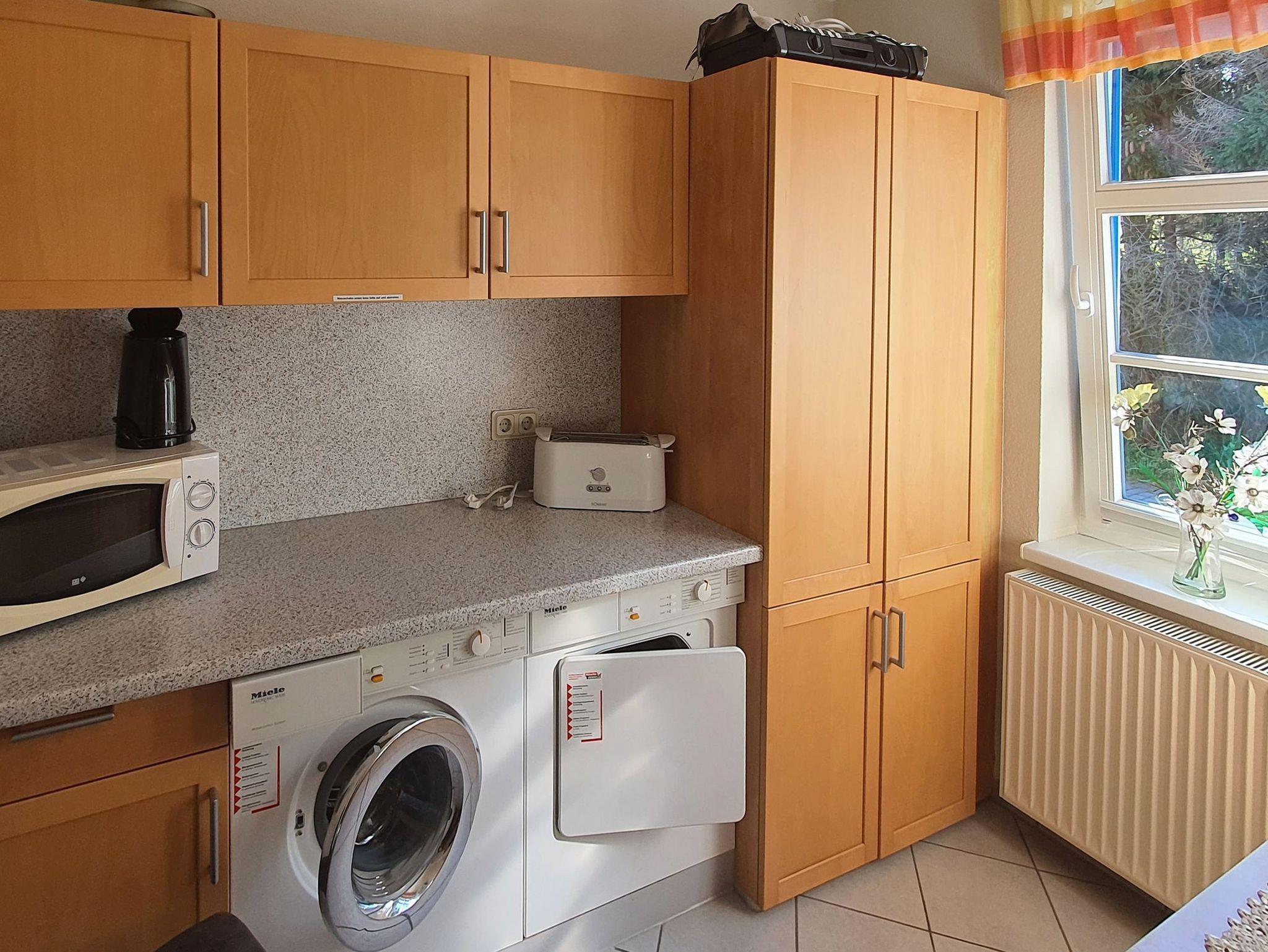 Die separate Küche mit Esstisch ist komplett mit einer modernen Küchenzeile ausgestattet. Sie enthält unter anderem einen Kühlschrank, Tiefkühlschrank, ein 4-Platten-Cerankochfeld, Backofen, Geschirrspüler, Kaffeemaschine, Toaster, Wasserkocher, Mikrowelle und jede Menge Kleininventar. Neben der Küche befindet sich ein Hauswirtschaftsraum mit Waschmaschine und Trockner zur kostenfreien Nutzung.