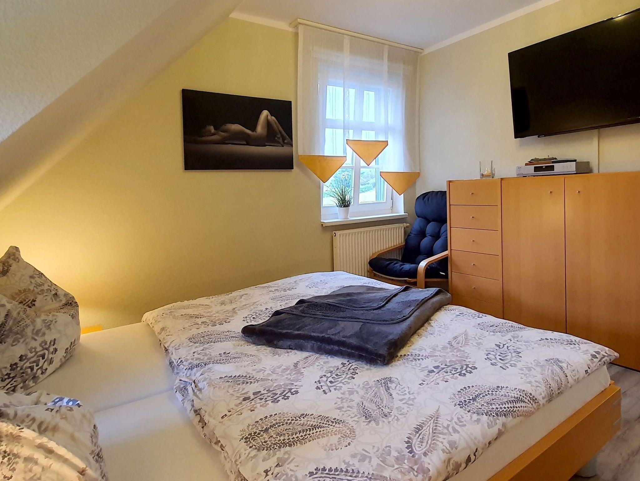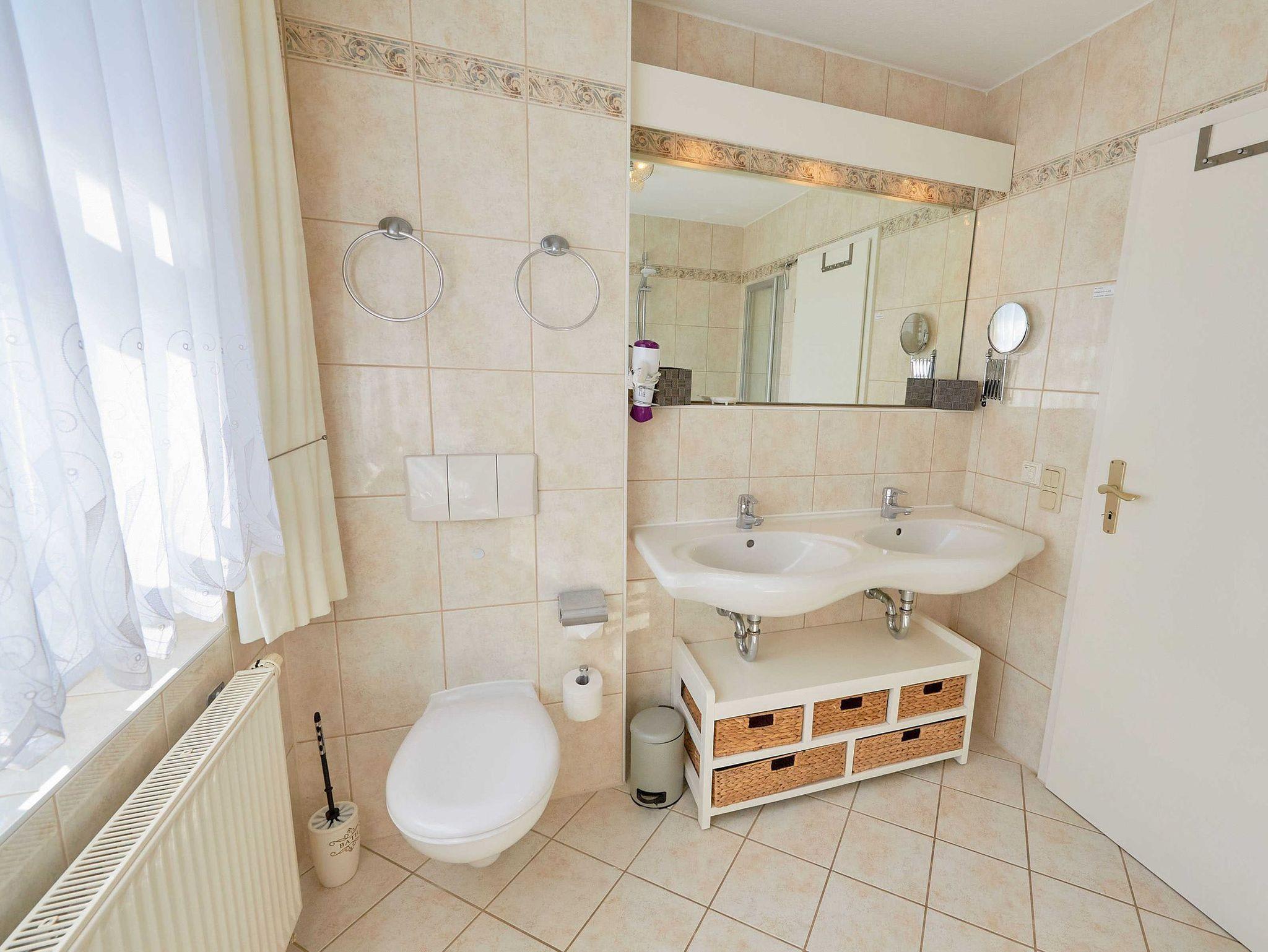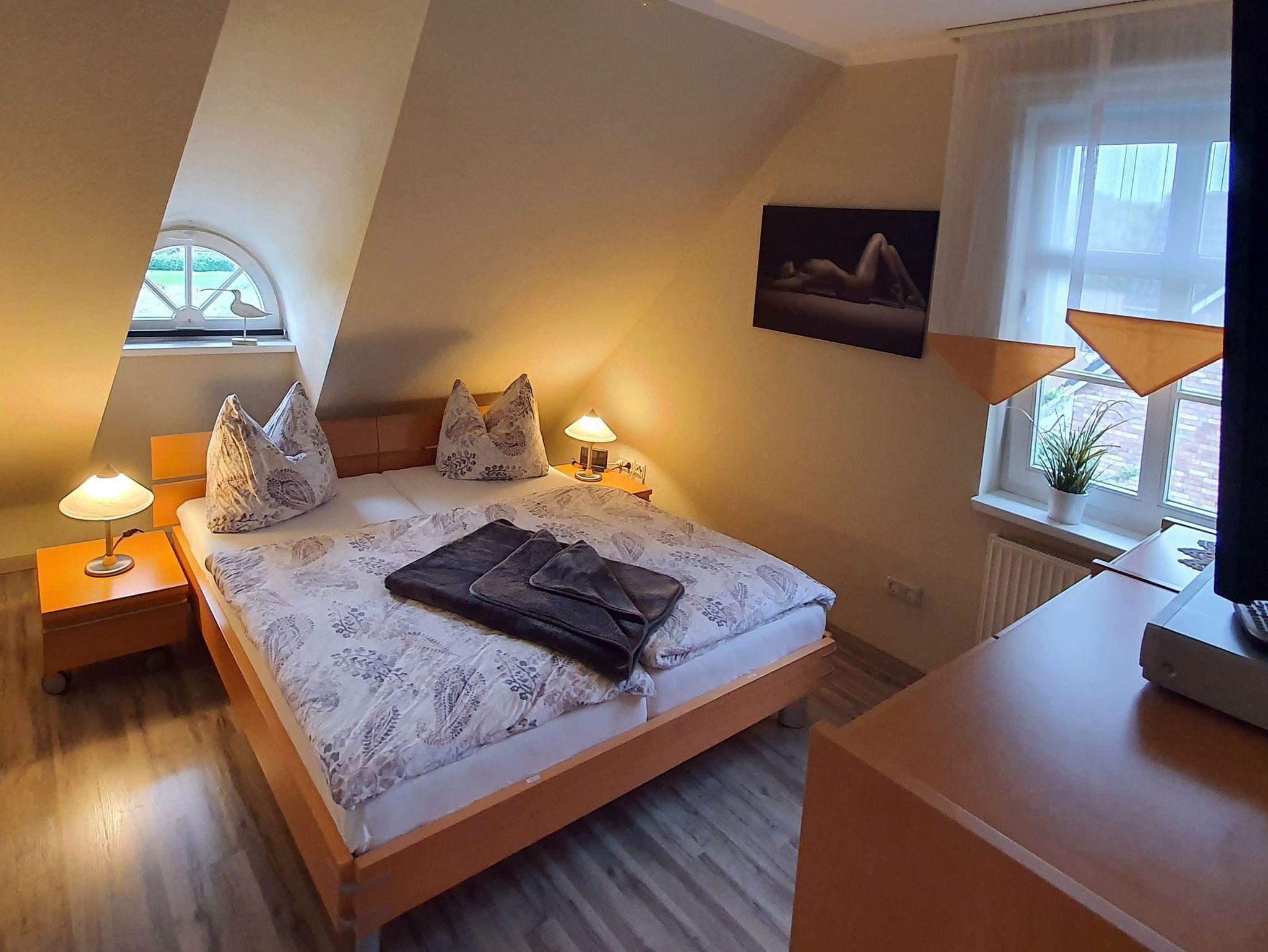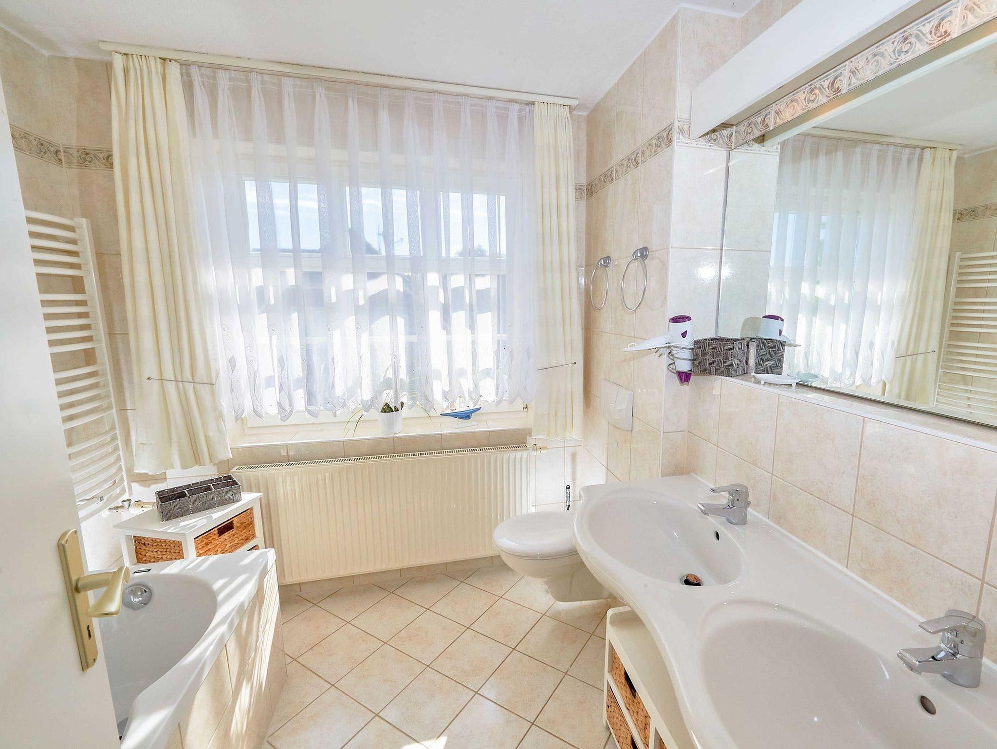Im Obergeschoss finden Sie ein zweites Badezimmer, ausgestattet mit einer Bade-/Duschwanne, WC, Doppelwaschbecken und Haartrockner sowie zwei Schlafzimmer. Eines der Schlafzimmer unter gemütlichen Dachschrägen gewährt Ihnen einen direkten Blick auf den Bodden und ist mit einem komfortablen Doppelbett, einem Flachbild-TV mit DVD-Player incl. einer Auswahl an DVDs sowie einem großzügigen begehbaren Kleiderschrank nebst Safe für Ihre Wersachen ausgestattet.