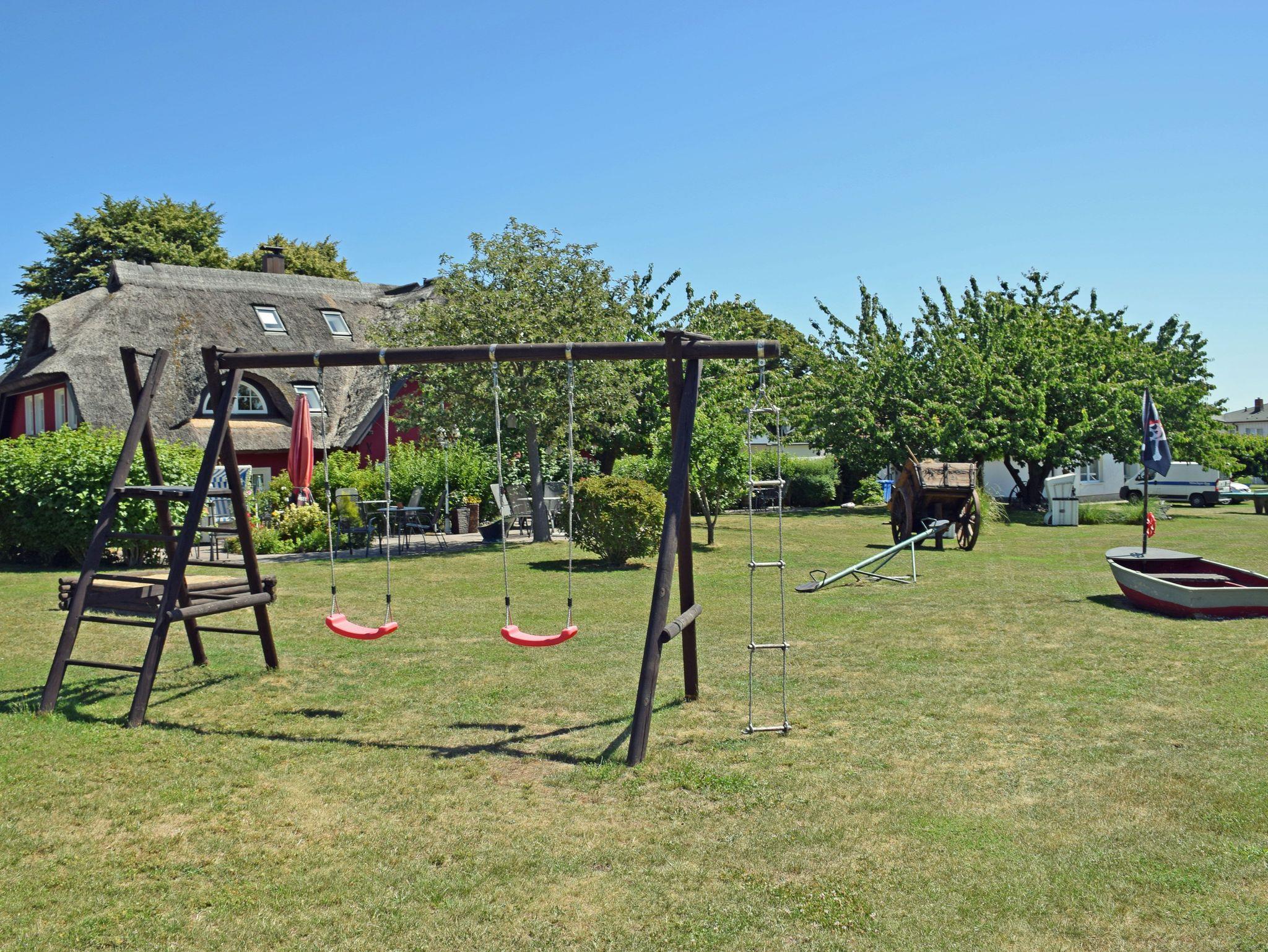 Das gesamte großflächige Grundstück steht dem Urlauber zur Verfügung und wurde von uns bis ins Detail liebevoll gestaltet. Auch für Familien mit Kindern gibt es viele Angebote: Piratenboot, Wippe, Tischtennisplatte, Fußball und vieles mehr. Die Appartements im Untergeschoß verfügen über eine eigene Terrasse mit Tisch und Stühlen, zu der man durch die Verandatür gelangt. Für die Gäste aus dem oberen Stockwerk sind ausreichend gemütliche Sitzecken im Garten eingerichtet. Ist man einmal strandmüde, stehen hier auf dem Rasen eigene Strandkörbe für das Sonnenbad am Landhus zur Verfügung. Hier können Sie in einer ruhigen Ecke des Grundstücks, mit Blick auf den Bodden und die Hügelkette des Großen Zicker, gut entspannen.