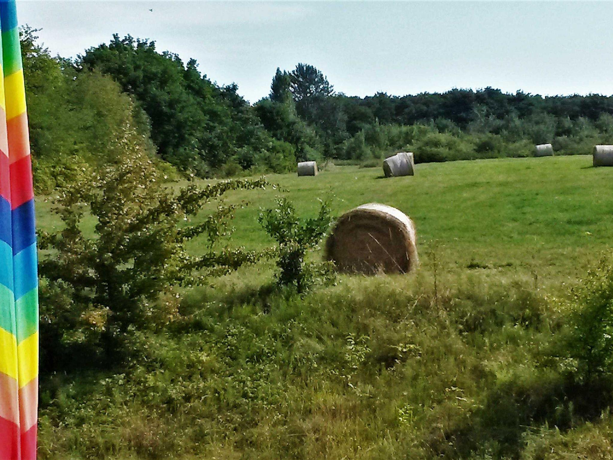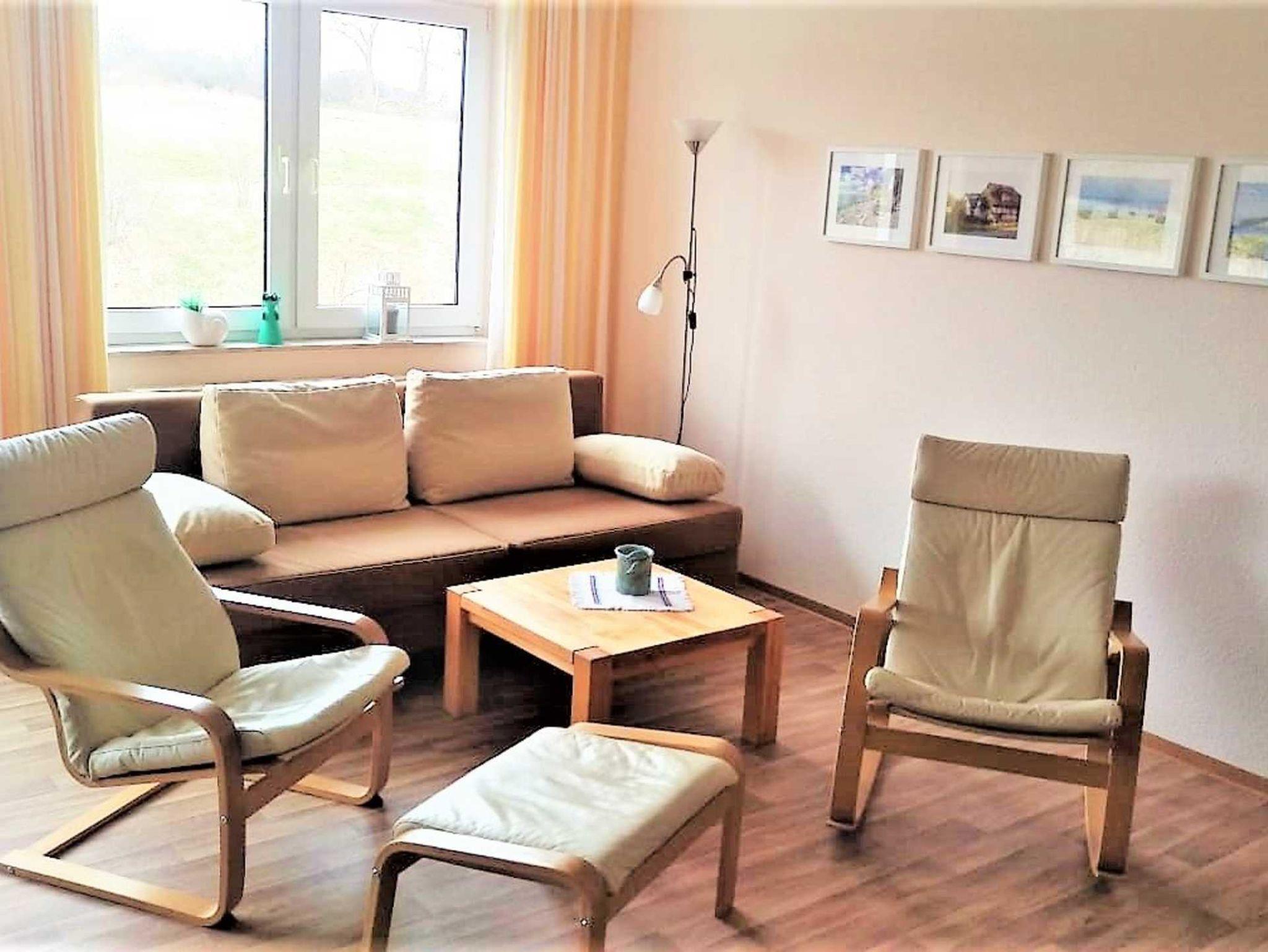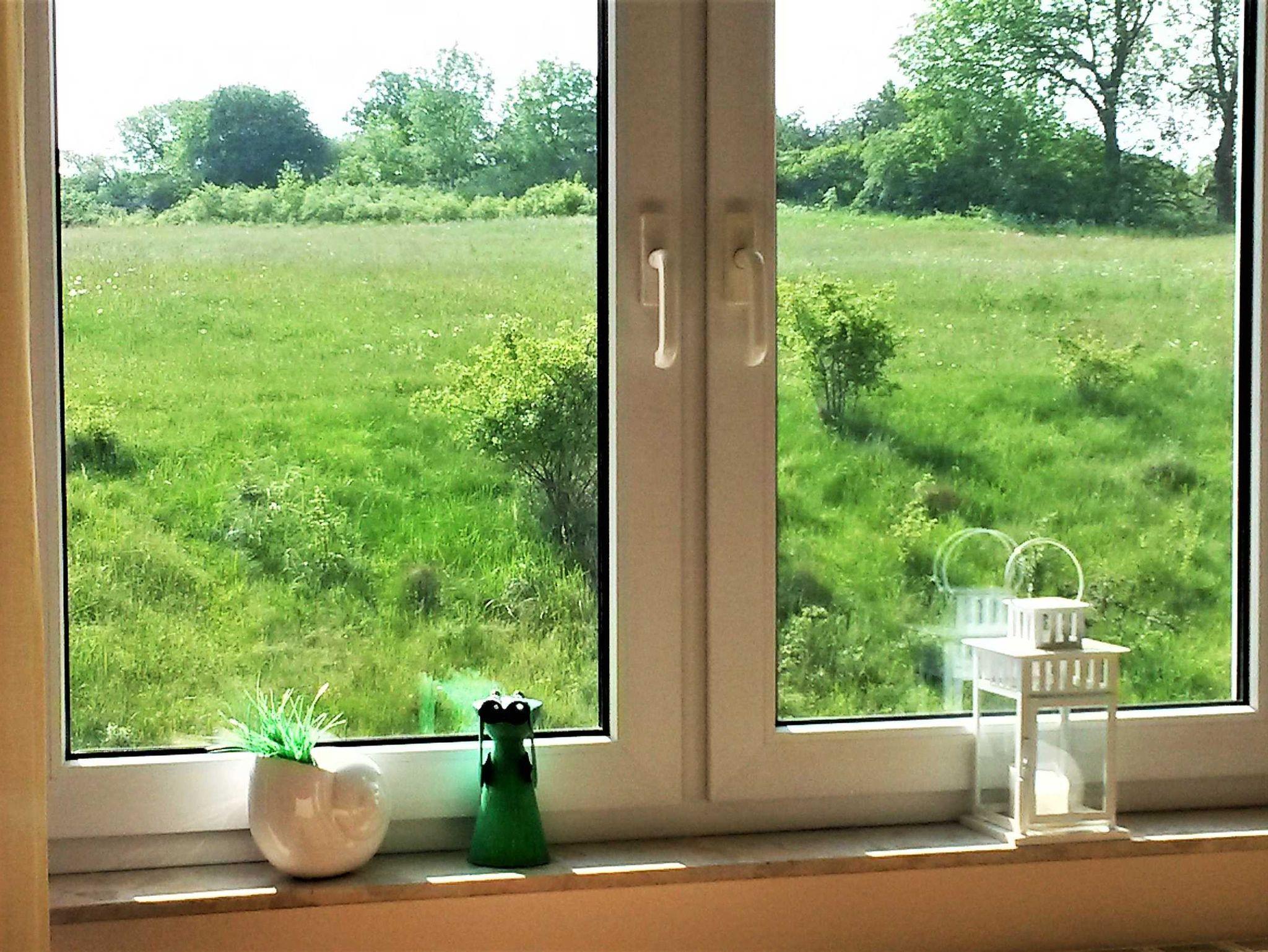 Die großen Fensterflächen im Wohnzimmer lassen Licht und Sonne ein und man genießt den Blick auf eine große Wiese und die unter Naturschutz stehende Baum- und Strauchkante des Hochufers.