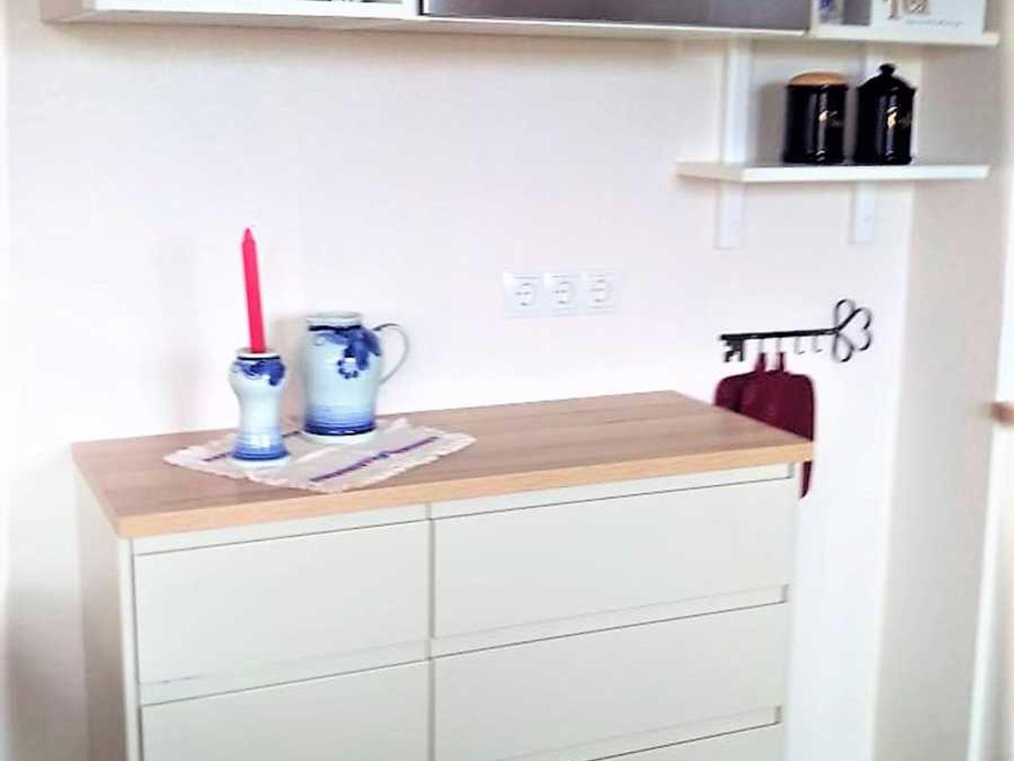 - einer zum Wohnzimmer offenen Küche mit Essplatz, Spüle, Kühlschrank mit Gefrierfach,
