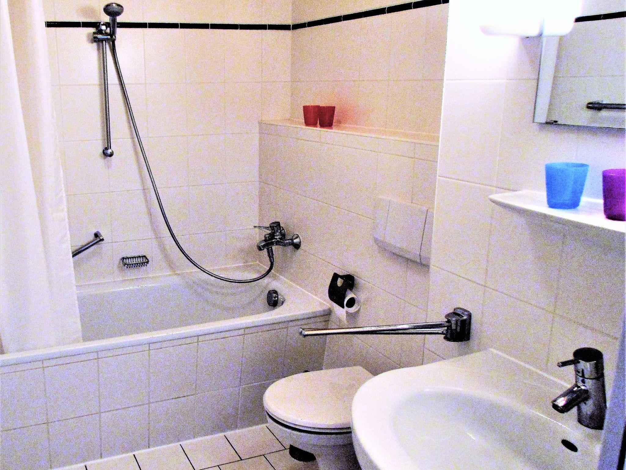 - einem Wannenduschbad mit WC, Waschbecken, Fön, Wandwäschetrockner und