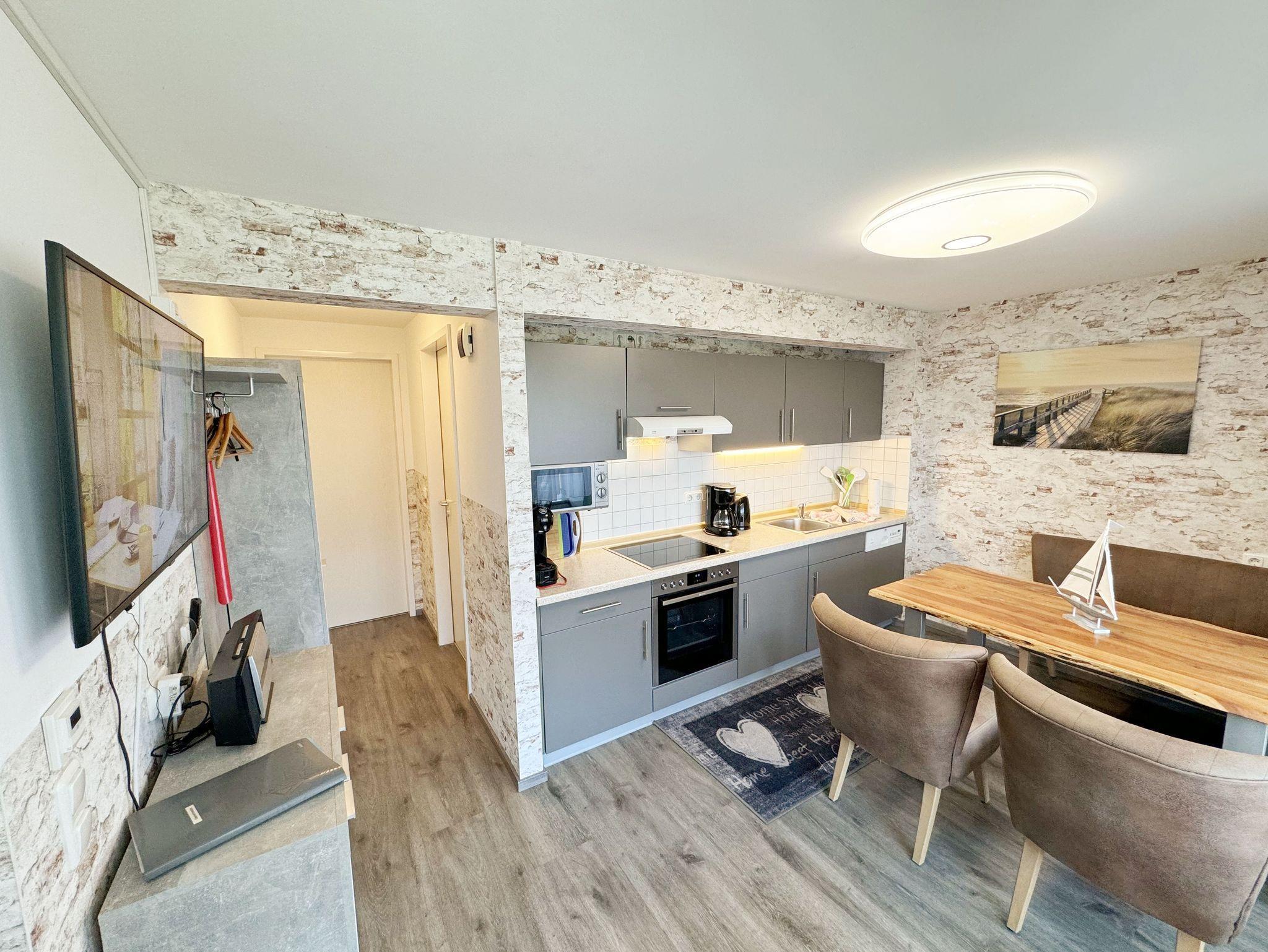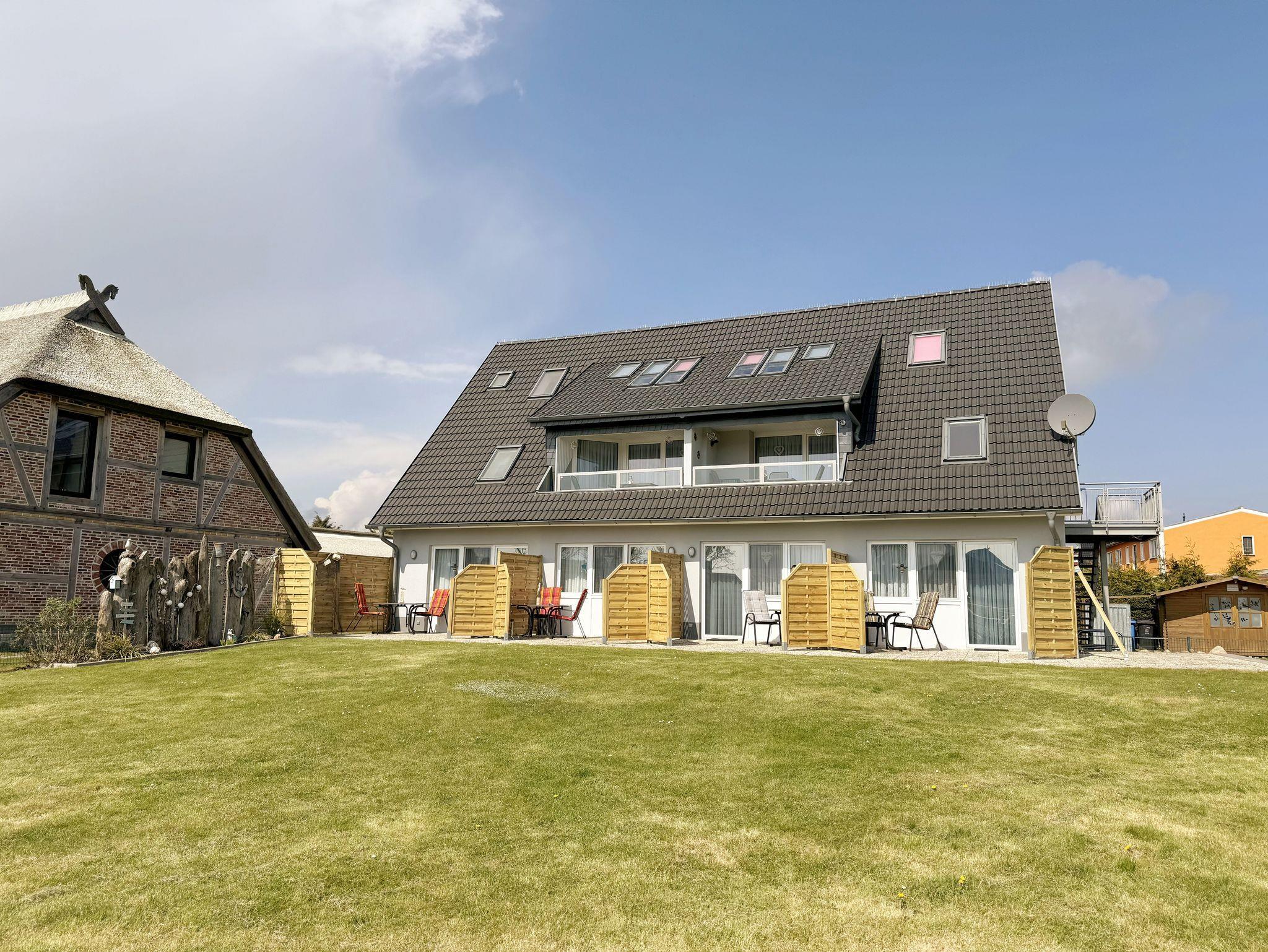 Die gut geschnittene Nichtraucherwohnung Nr.06 befindet sich im Obergeschoß des Hauses. Mit Ihren ca. 50 m² Wohnfläche mit Balkon und direktem Blick über die großzügige hauseigene Freifläche auf den Bodden, bietet sie ausreichend Platz für max. 2 bis 4 Erwachsene + 1 Kleinkind bis 3 Jahre im Kinderreisebett. Die Wohnung wurde komplett renoviert und mit einem hochwertigen PVC freiem Vinyl verlegt. Die offene und vollausgestattete Küchenzeile mit einem 4 Zonencerankochfeld, Geschirrspüler, Backofen, Kühlschrank mit Gefrierfach, Mikrowelle, Toaster, Wasserkocher, Kaffeemaschine, Dolce Gusto Maschine sowie kleinen Küchenhelfern wird mit einem gemütlichen Essplatz komplettiert. Vom Küchenbereich gelangen Sie auf den überdachten und bestuhlten Balkon (Süd/Ost). Bei schönem Wetter können Sie auch hier Ihre Mahlzeiten, mit einem wundervollen Natur- und Boddenblick genießen. Im ersten Schlafzimmer erwartet Sie ein großes Doppelbett mit Einzelmatratzen (1,80m x 2,00m), Nachttischablagen mit Leselampen, Smart-TV, einen geräumigen Kleiderschrank und Safe für Ihre Wertsachen und ein Sideboard für Ihre Wäsche sowie Ablage. Für einen erholsamen Schlaf sorgen Verdunklungsgardinen und Insektenschutzgitter. Das zweite Schlafzimmer verfügt ebenfalls über ein Doppelbett mit Einzelmatratzen (1,80m x 2,00 m), Leselampe und 17 Zoll LED-TV. Eine Hifi Microanlage mit CD-Player, MP3, UKW-Funktion, USB und Bluetooth mit NFC, ein DAB-Radio sowie ein inklusiver WLAN-Anschluss runden den technischen Bereich ab. Das große Tageslicht-Bad ist mit einem WC, einer ebenerdigen Dusche, einem Waschtisch, Fön, Kosmetikspiegel, einem großen Wandspiegel, Handtuchheizkörper und einem Ablageregal ausgestattet. Ein Haustier ist gegen eine Gebühr ein gern gesehener Gast. Da Haustiere erfahrungsgemäß Ihre eigenen Sachen lieben, bringen Sie hier bitte Schlafkörbchen, Wasser- und Fressnapf mit. Sollte Ihnen doch einmal Strandsand ins Haus geraten oder etwas runterfallen, ist jede Wohnung mit einem Staubsauger und anderen Reinigungsgeräten ausgestattet. Für Ihre Fahrräder finden Sie am Giebel des Hauses (unter Whg 5) einen Fahrradständer zum Anschließen. Die Grünfläche des Hauses lädt zu geselligen Abenden mit weiteren Hausgästen ein. Ein Standgrill steht für unsere Gäste im Gartenhaus zur Verfügung. Bitte beachten Sie jedoch, dass das Grillen auf den Holzterrassen aus brandschutztechnischen Gründen nicht erlaubt ist. Hier finden Sie aber ausreichend Platz auf dem Außengelände, welches auch über einen kleinen Kinderspielplatz, Sandkiste und einer Tischtennisplatte verfügt. Ein PKW-Stellplatz (Nr.06) steht Ihnen inklusive am Haus zur Verfügung. Die Erstausstattung eines Wäschepaketes (komplette Bettwäsche, 1 Duschhandtuch, 1 kleines Handtuch, 1 Duschvorleger) können Sie bis 14 Tage vor Anreise gegen einen Aufpreis dazu buchen oder durch eigene ergänzen.1 Geschirrhandtuch gehört zu jedem Aufenthalt dazu.