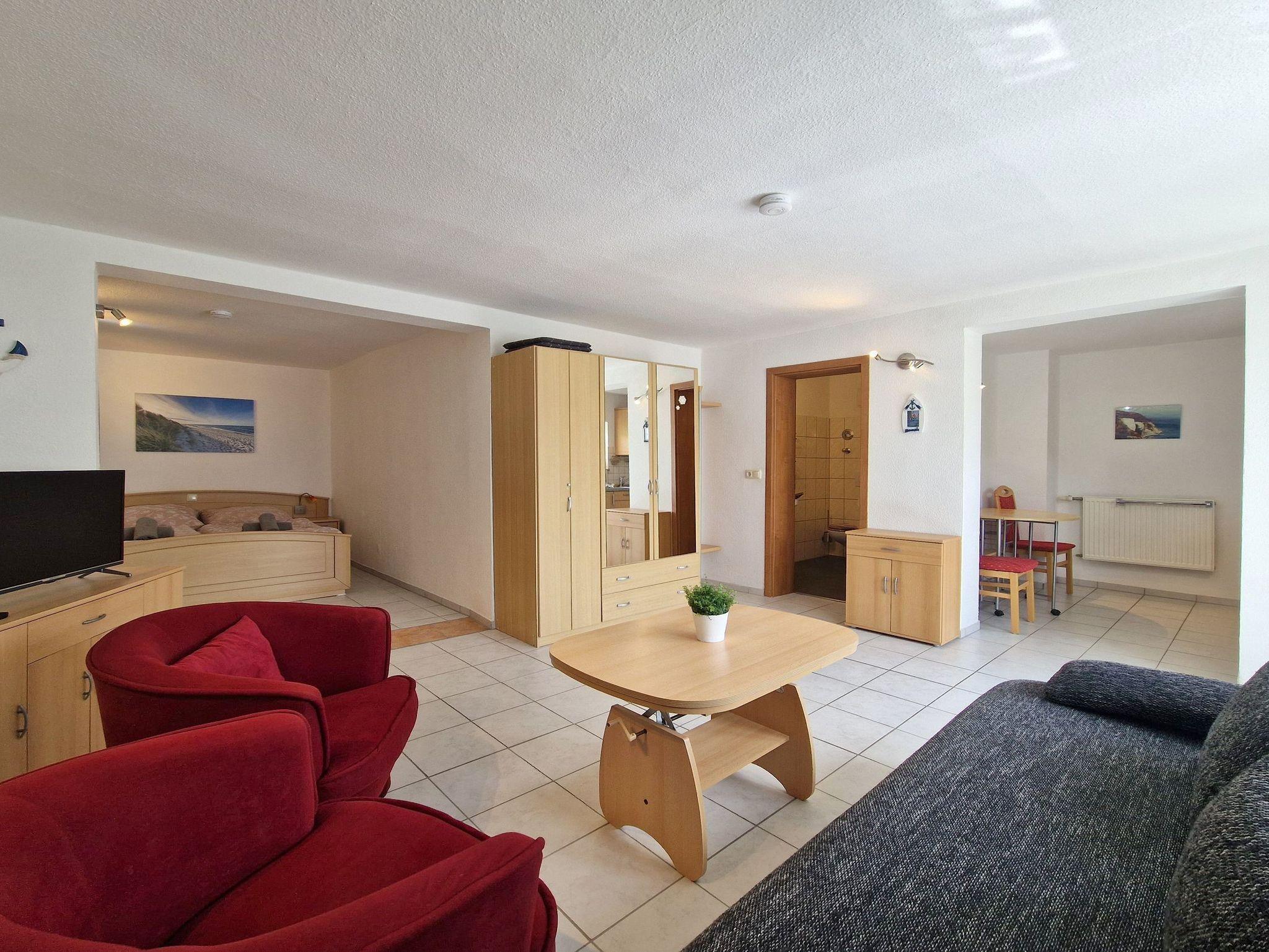 • WOHNEN/SCHLAFEN: Wohnraum mit Doppelbett, Schlafcouch, Flachbild-TV