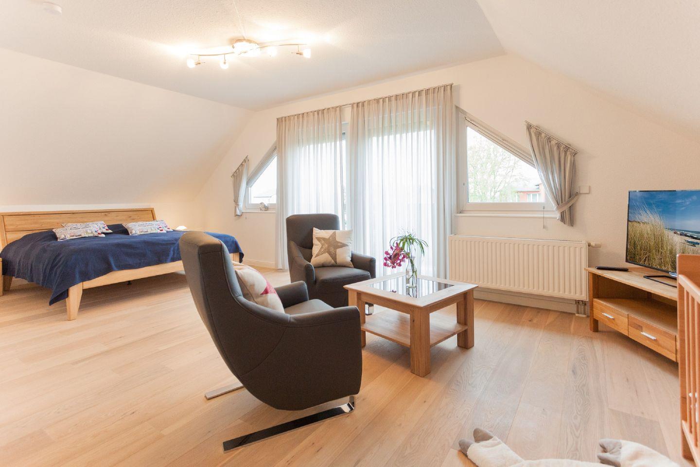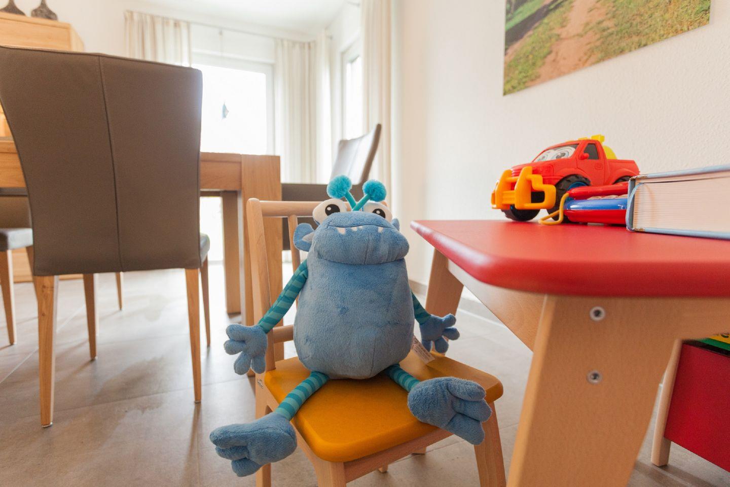 WOHNEN // Wohnraum mit Essbereich, Spielecke für Kinder, Sitzgarnitur mit bequemer Couch, Sessel, Flachbild-TV, Kamin ++