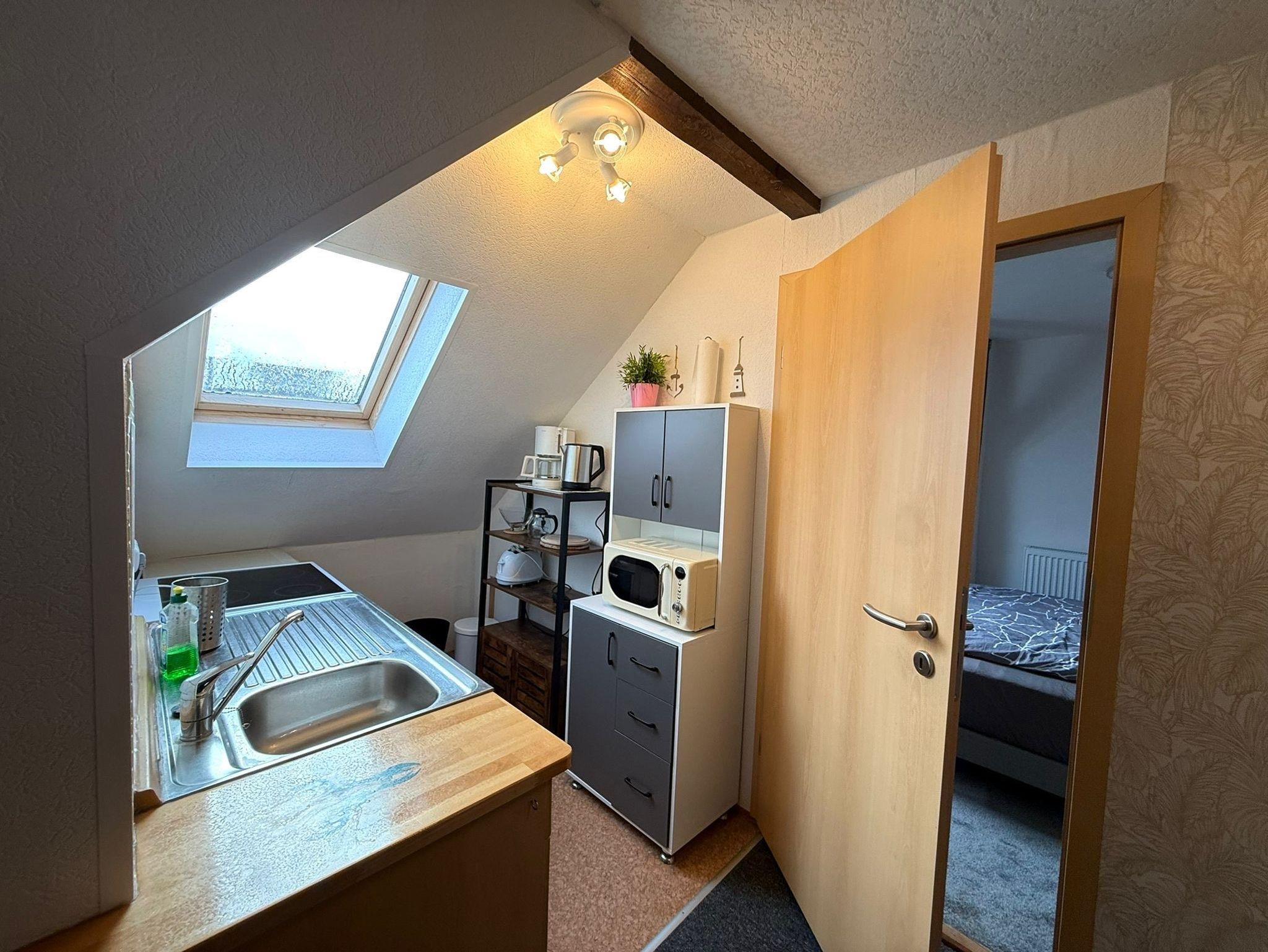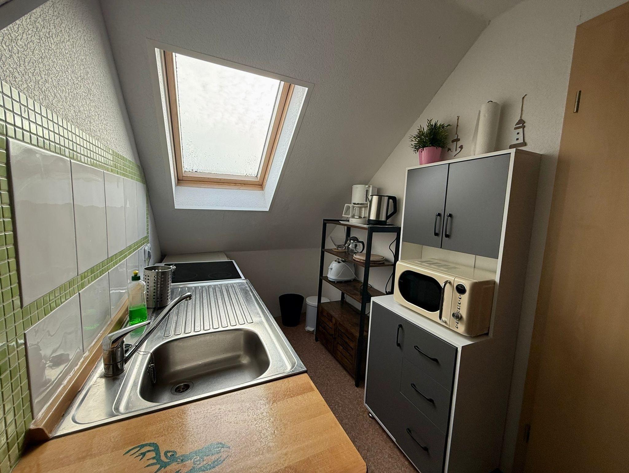 Die Küche ist offen zum Wohnraum (Elektroherd mit Backröhre, Geschirrspüler, Mikrowelle, Kaffeemaschine und Wasserkocher).