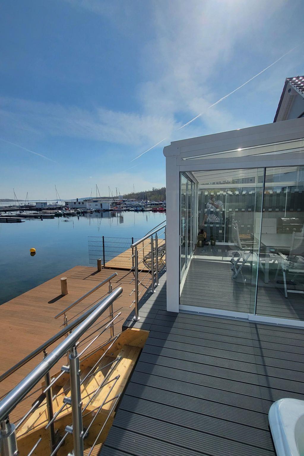 2 free parking spaces in front of the doorThe winter garden is equipped with a table and 6 chairs, the whirlpool and the sauna with lake view invite you to relax and the lower terrace invites you to sunbathe and refresh yourself.