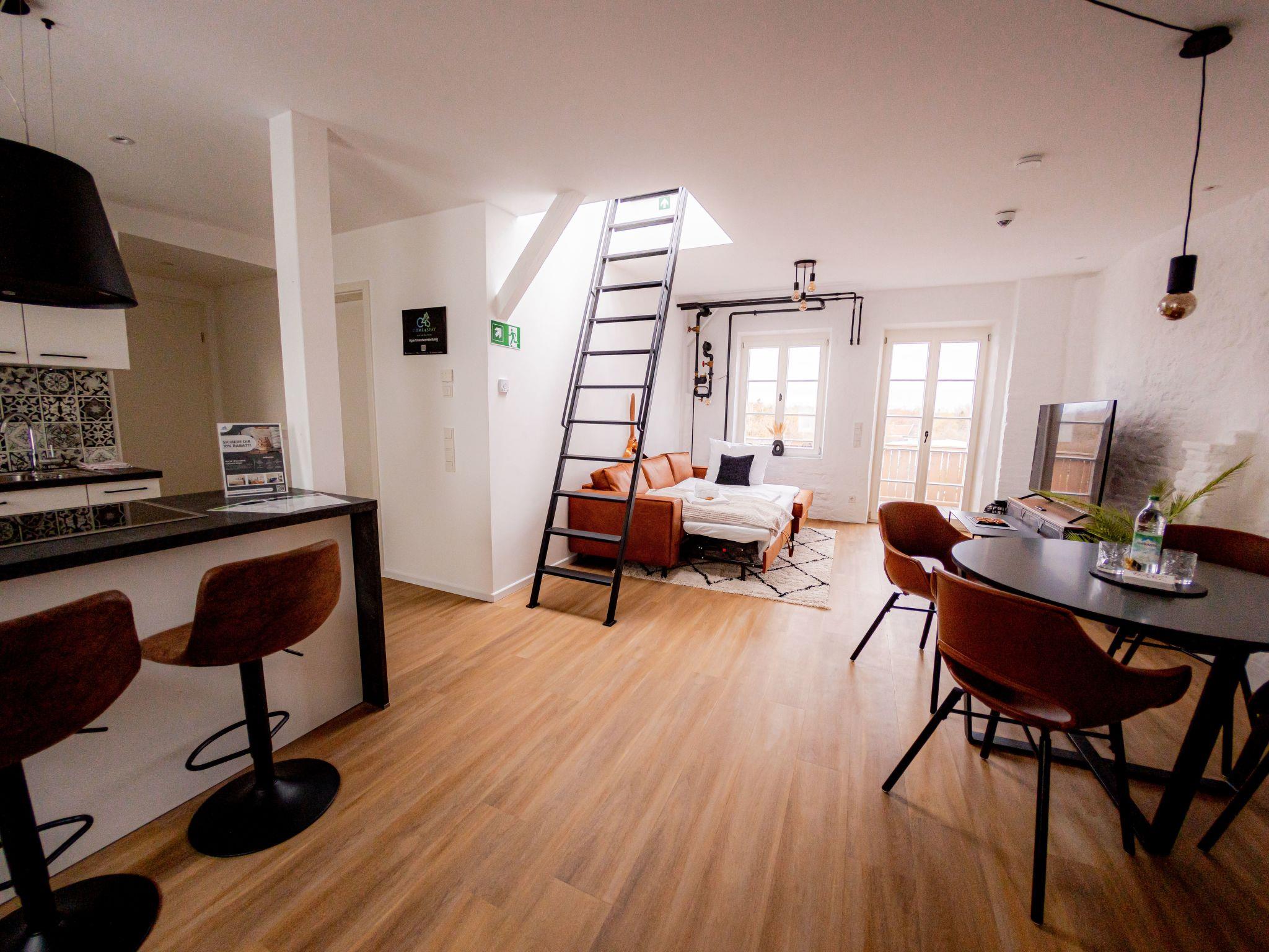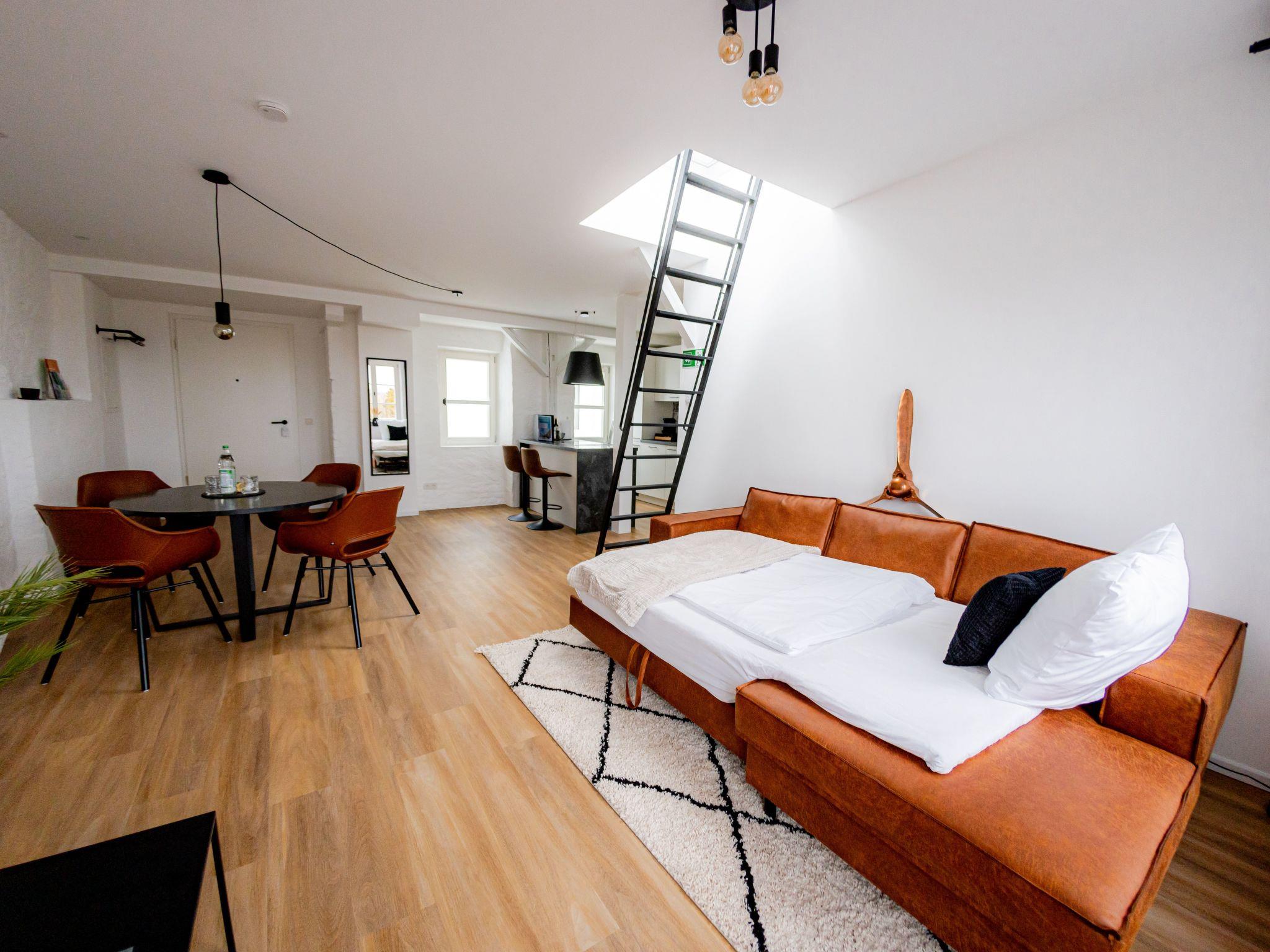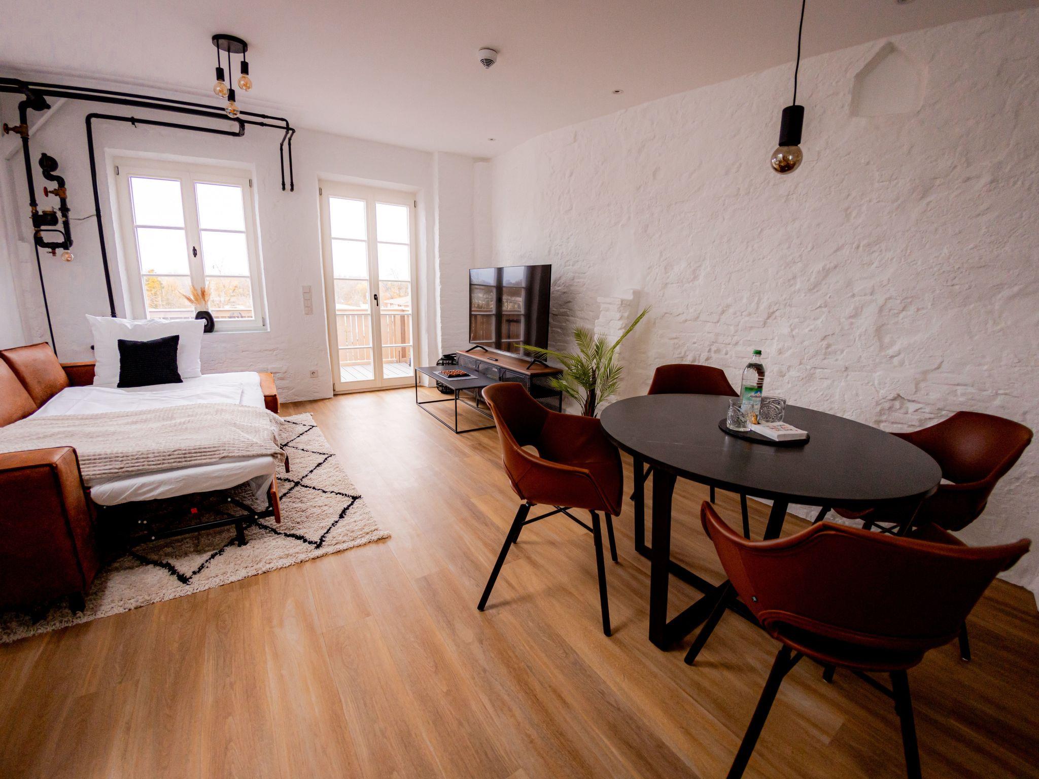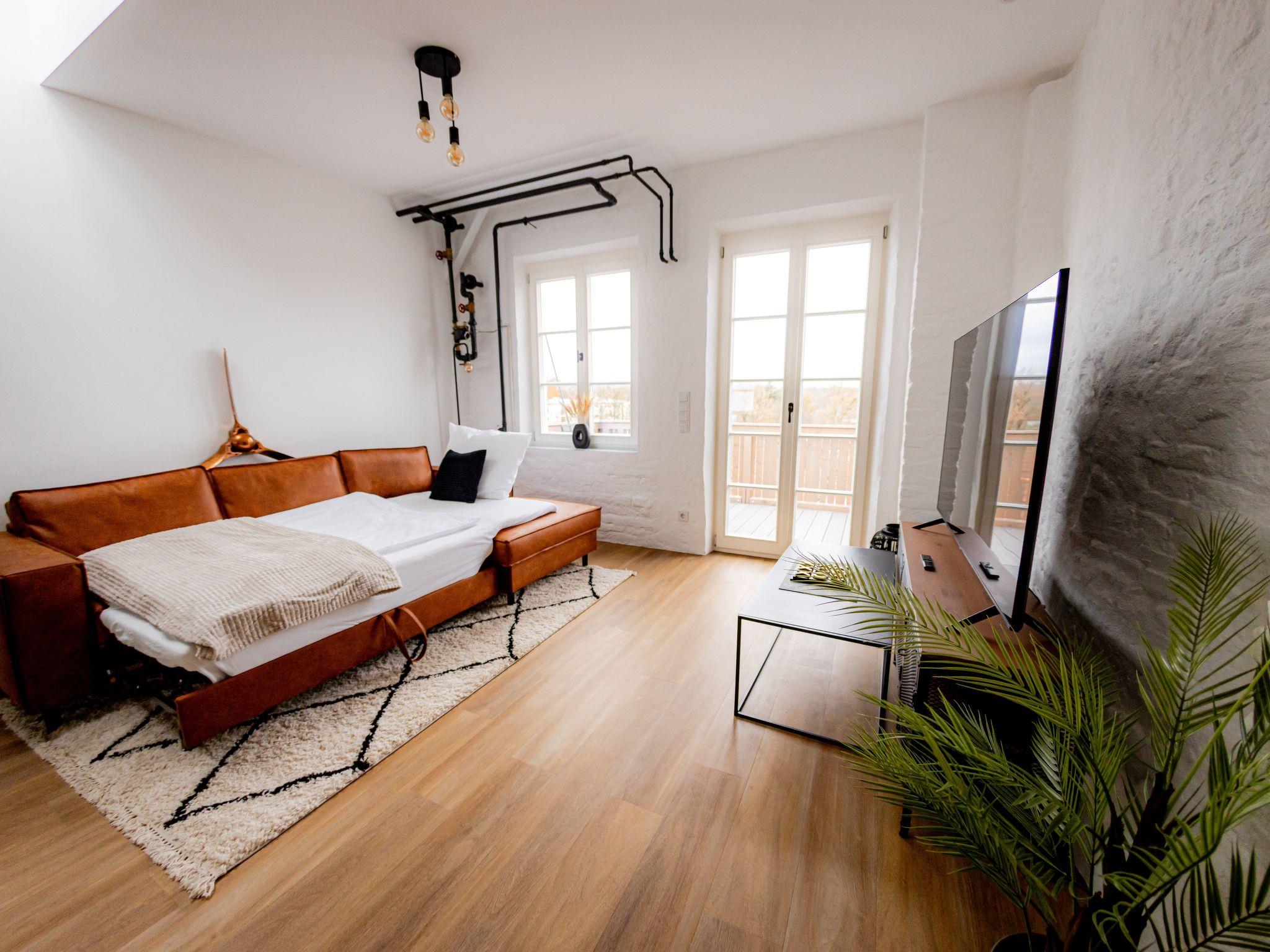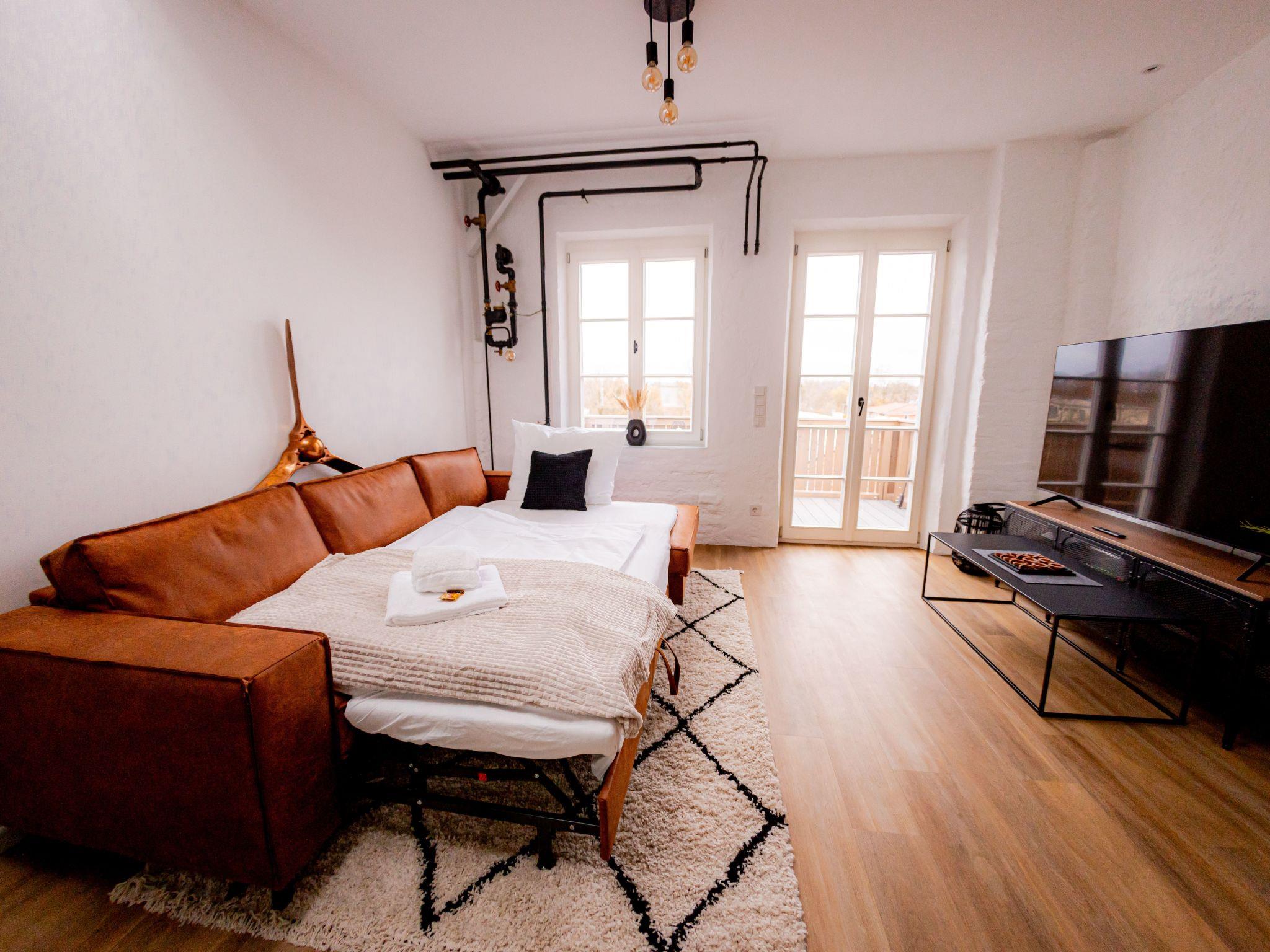 Welcome to our spacious 65 m² holiday flat, perfect for private and business trips. This renovated 2-room flat in an old building offers space for up to 4 people and combines historical charm with modern comfort. The bedroom entices with a luxurious king-size bed, while the living room with open-plan kitchen, balcony and a spacious TV area creates an inviting atmosphere. The sofa bed offers additional space for overnight guests. In the stylish bathroom you will not only find a spacious shower, but also a practical washing machine for your convenience. The flat has been redesigned with modern furniture and stylish details. The flat is located on the 3rd floor right in the centre of Mühldorf. The historic surroundings are complemented by the presence of medical practices in the building, creating a particularly practical location. A free parking space in the garage is also available to ensure your mobility. Enjoy comfort, style and convenience in this charming old building gem.