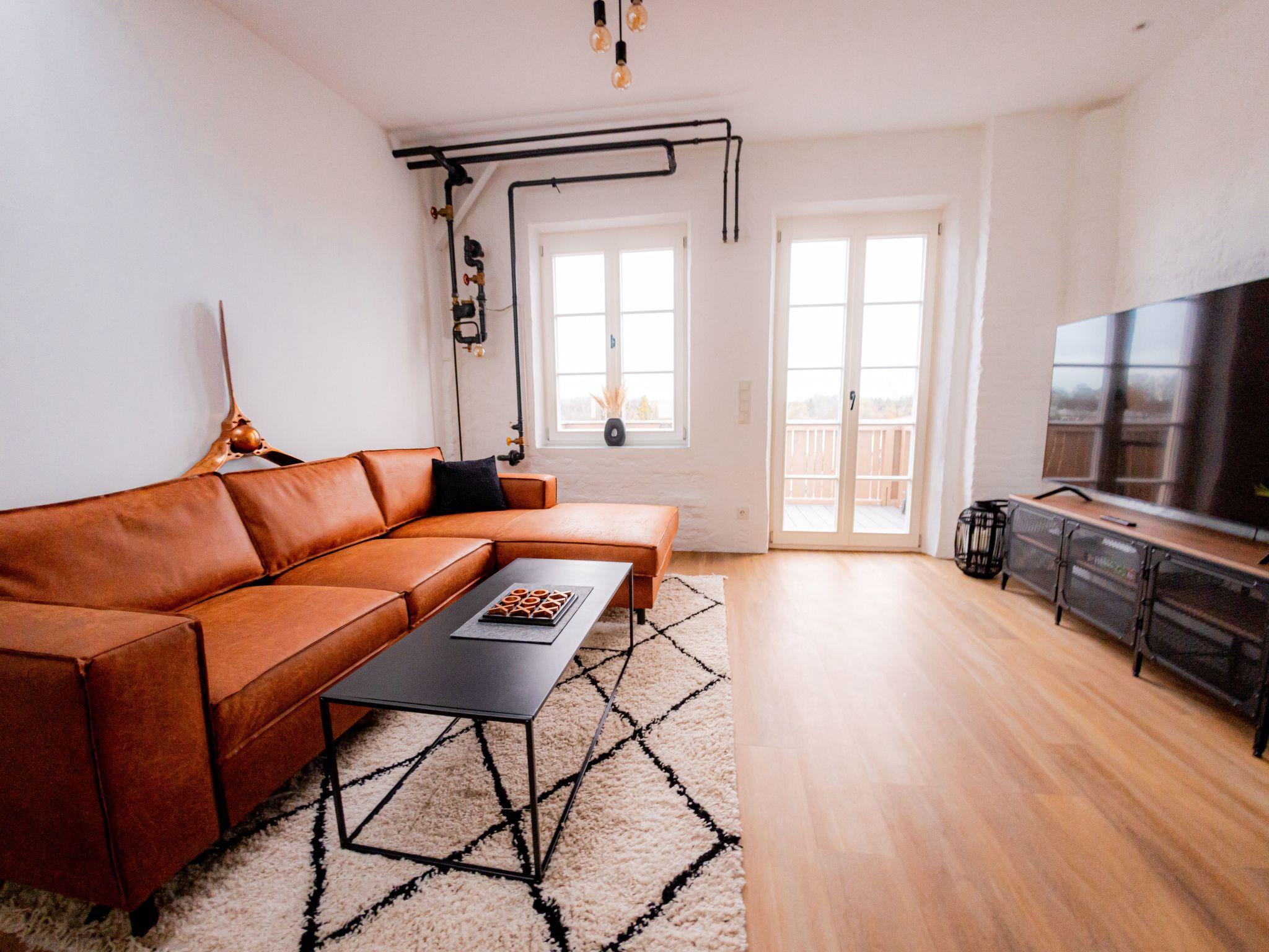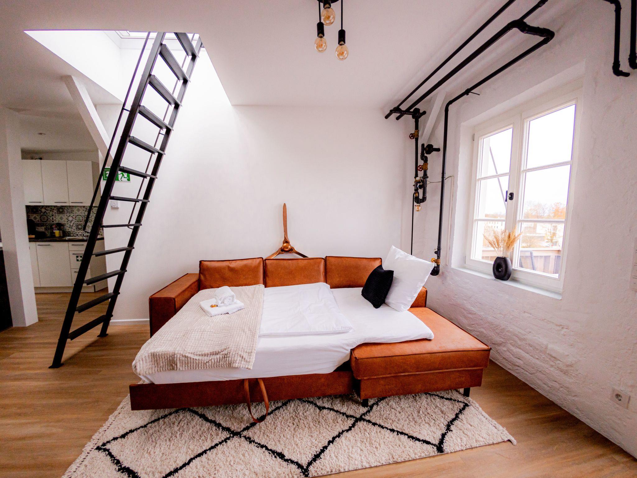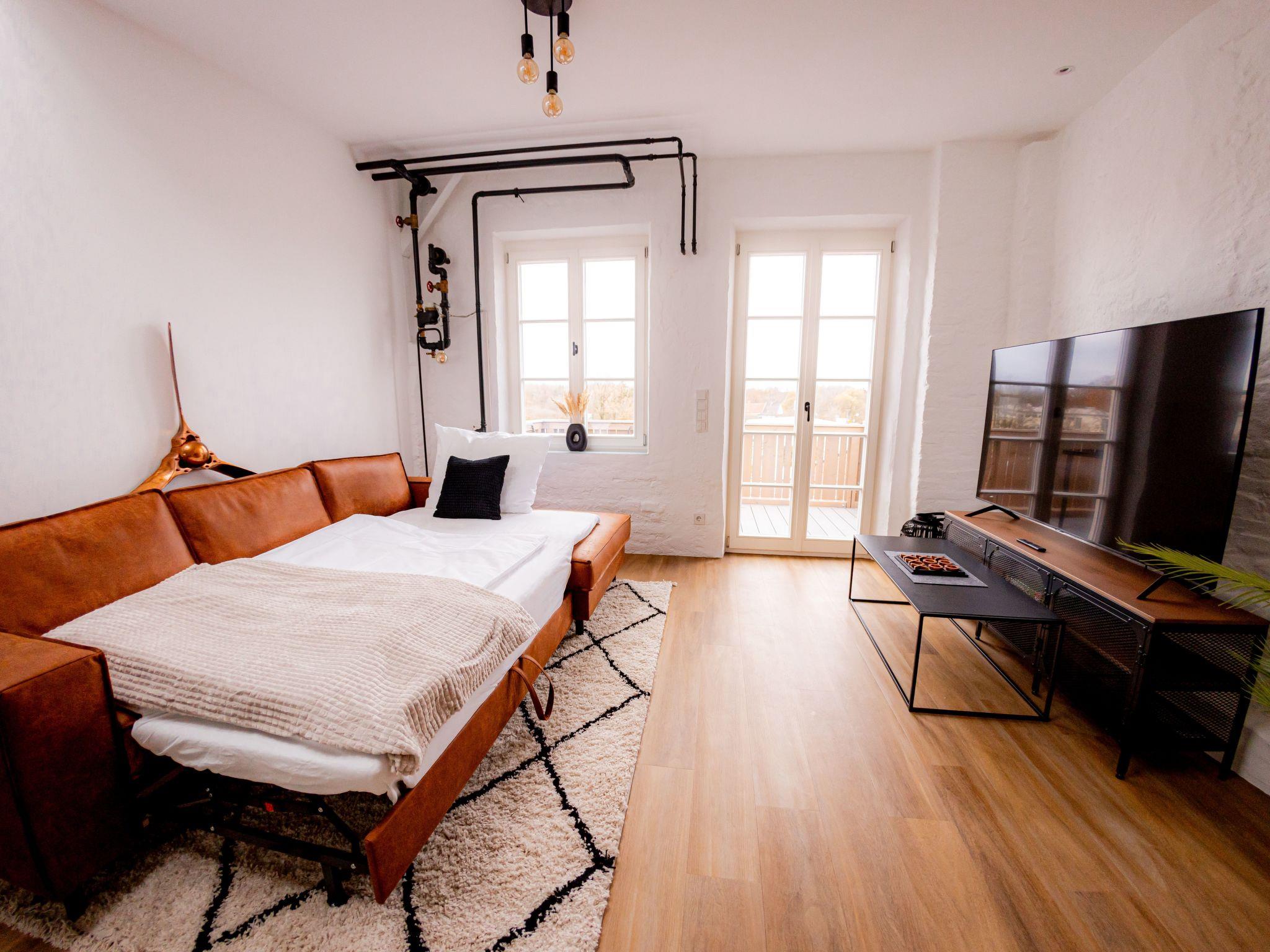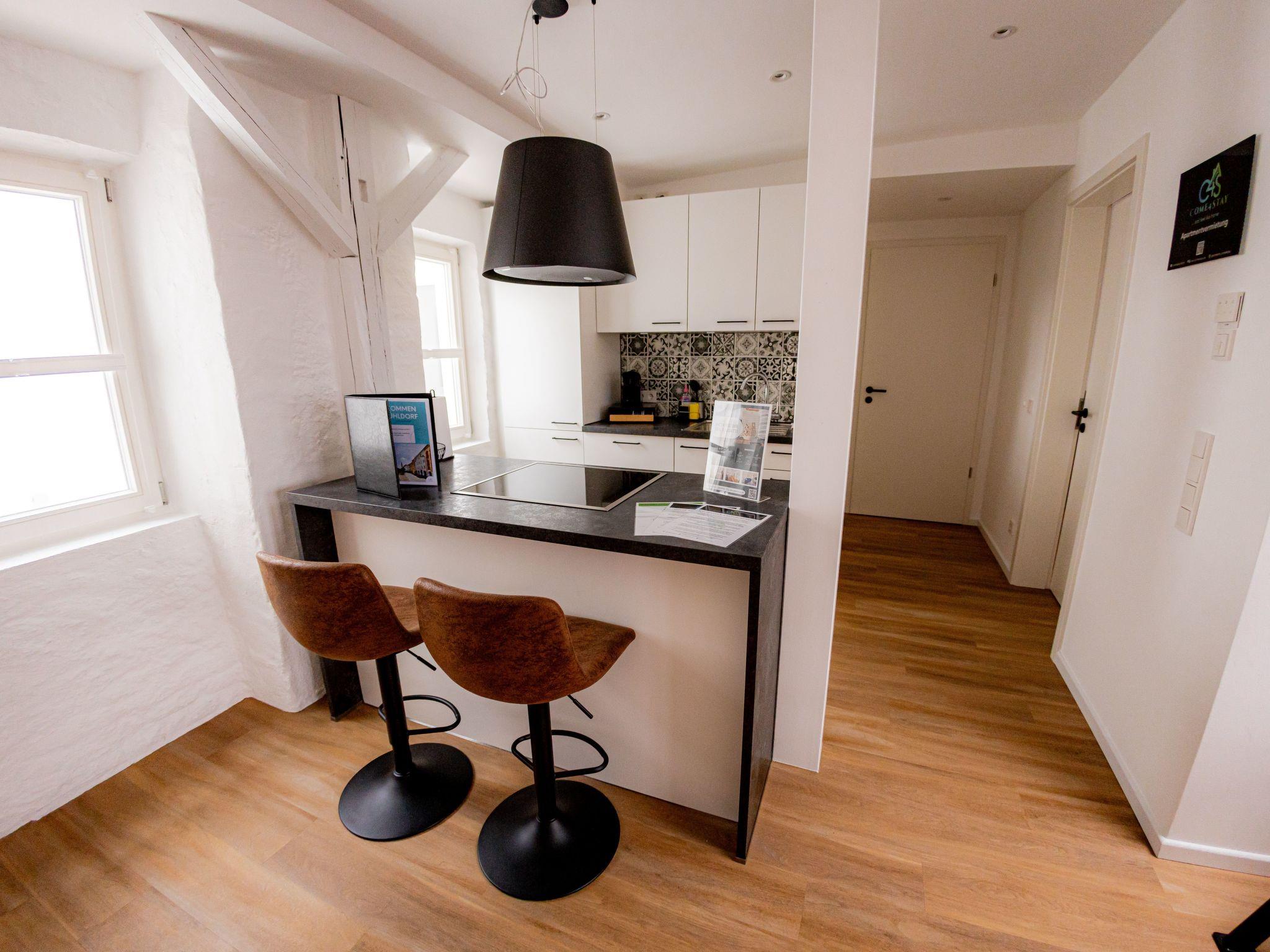 Welcome to our spacious 65 m² holiday flat, perfect for private and business trips. This renovated 2-room flat in an old building offers space for up to 4 people and combines historical charm with modern comfort. The bedroom entices with a luxurious king-size bed, while the living room with open-plan kitchen, balcony and a spacious TV area creates an inviting atmosphere. The sofa bed offers additional space for overnight guests. In the stylish bathroom you will not only find a spacious shower, but also a practical washing machine for your convenience. The flat has been redesigned with modern furniture and stylish details. The flat is located on the 3rd floor right in the centre of Mühldorf. The historic surroundings are complemented by the presence of medical practices in the building, creating a particularly practical location. A free parking space in the garage is also available to ensure your mobility. Enjoy comfort, style and convenience in this charming old building gem.