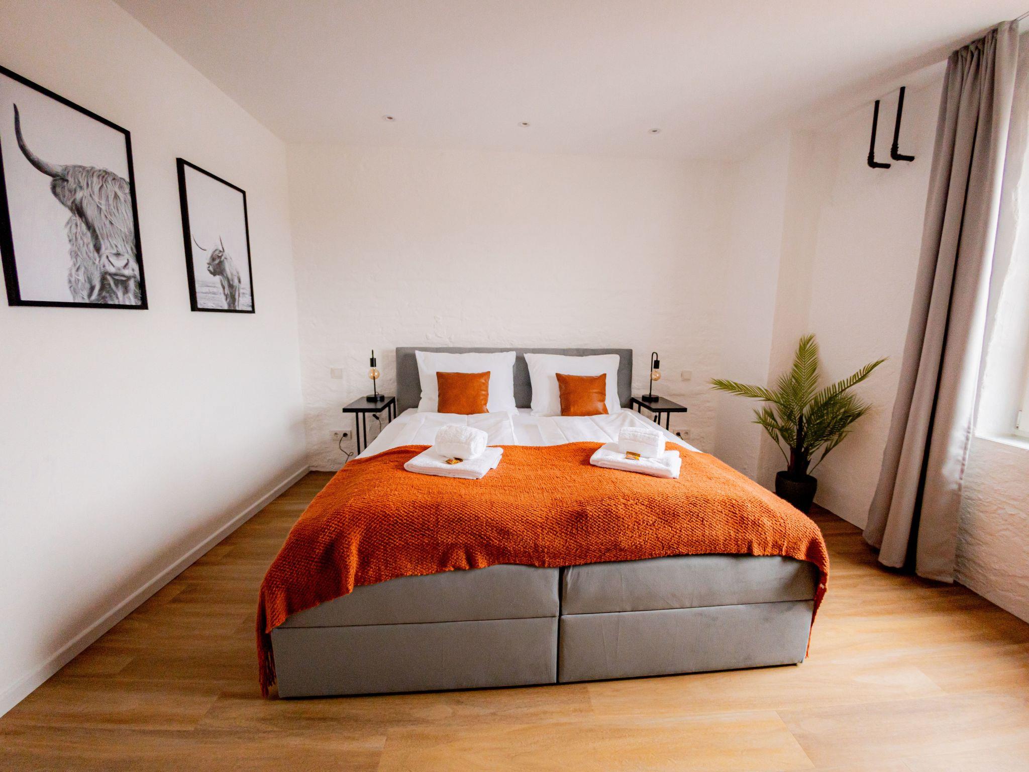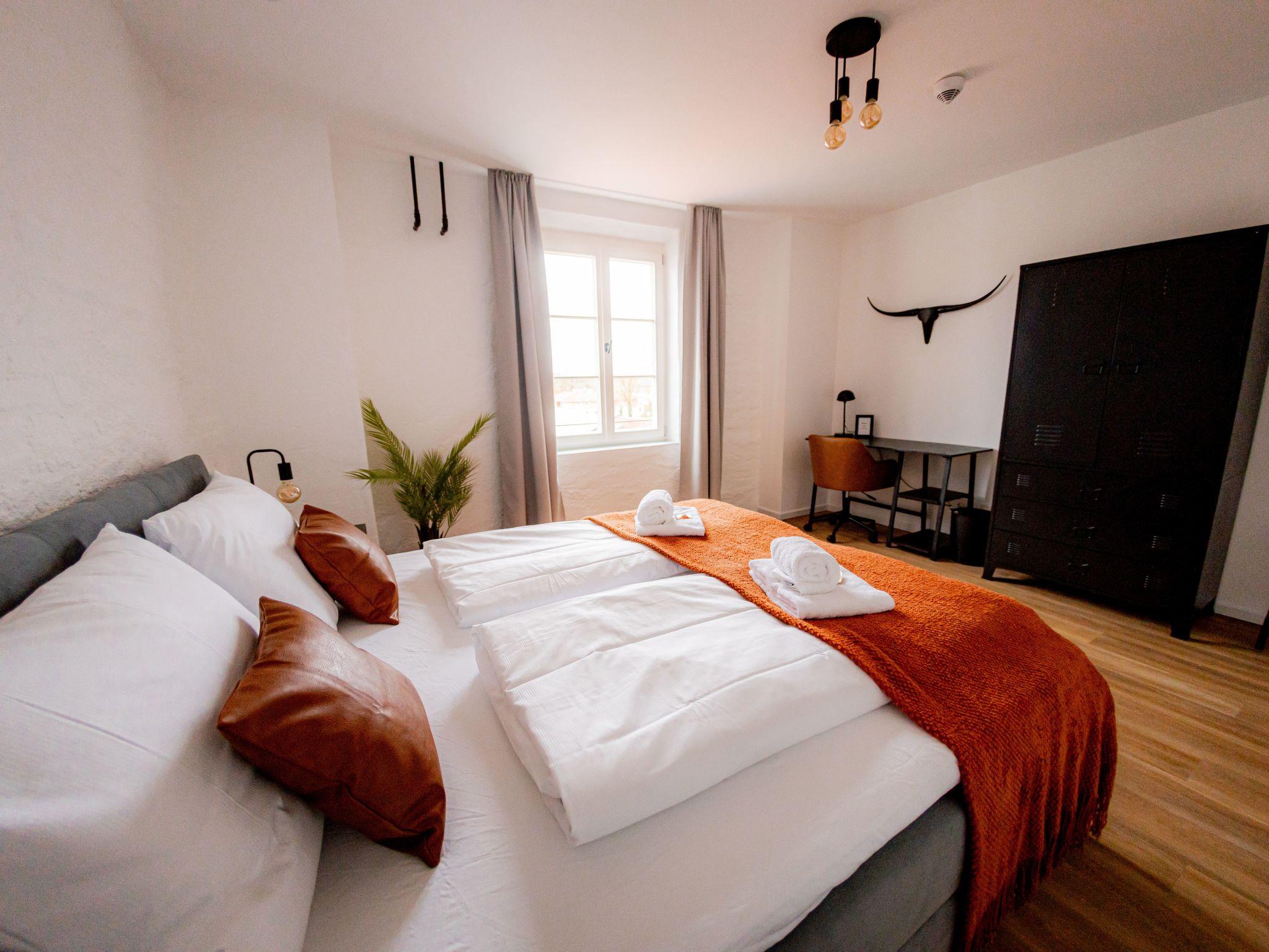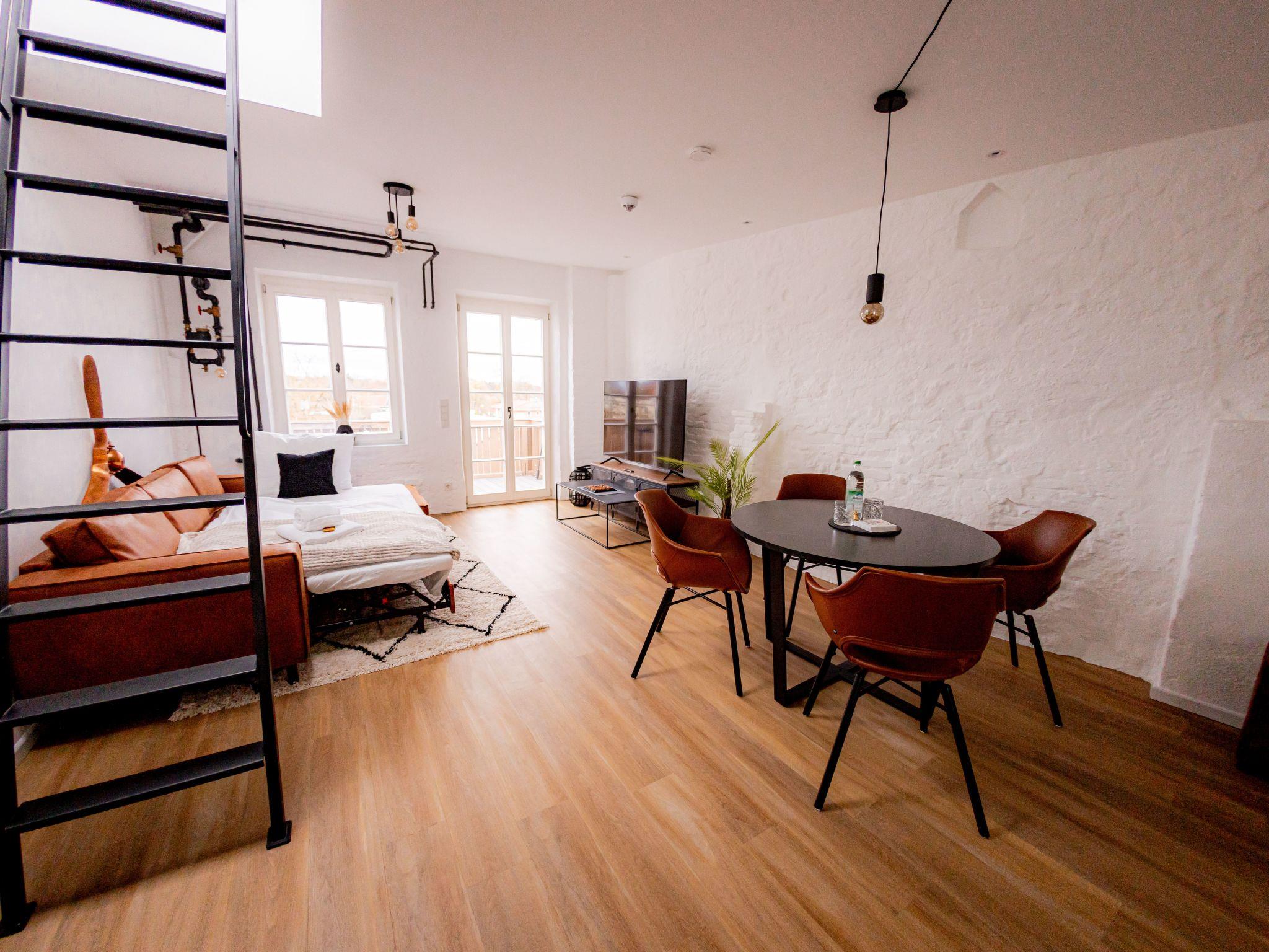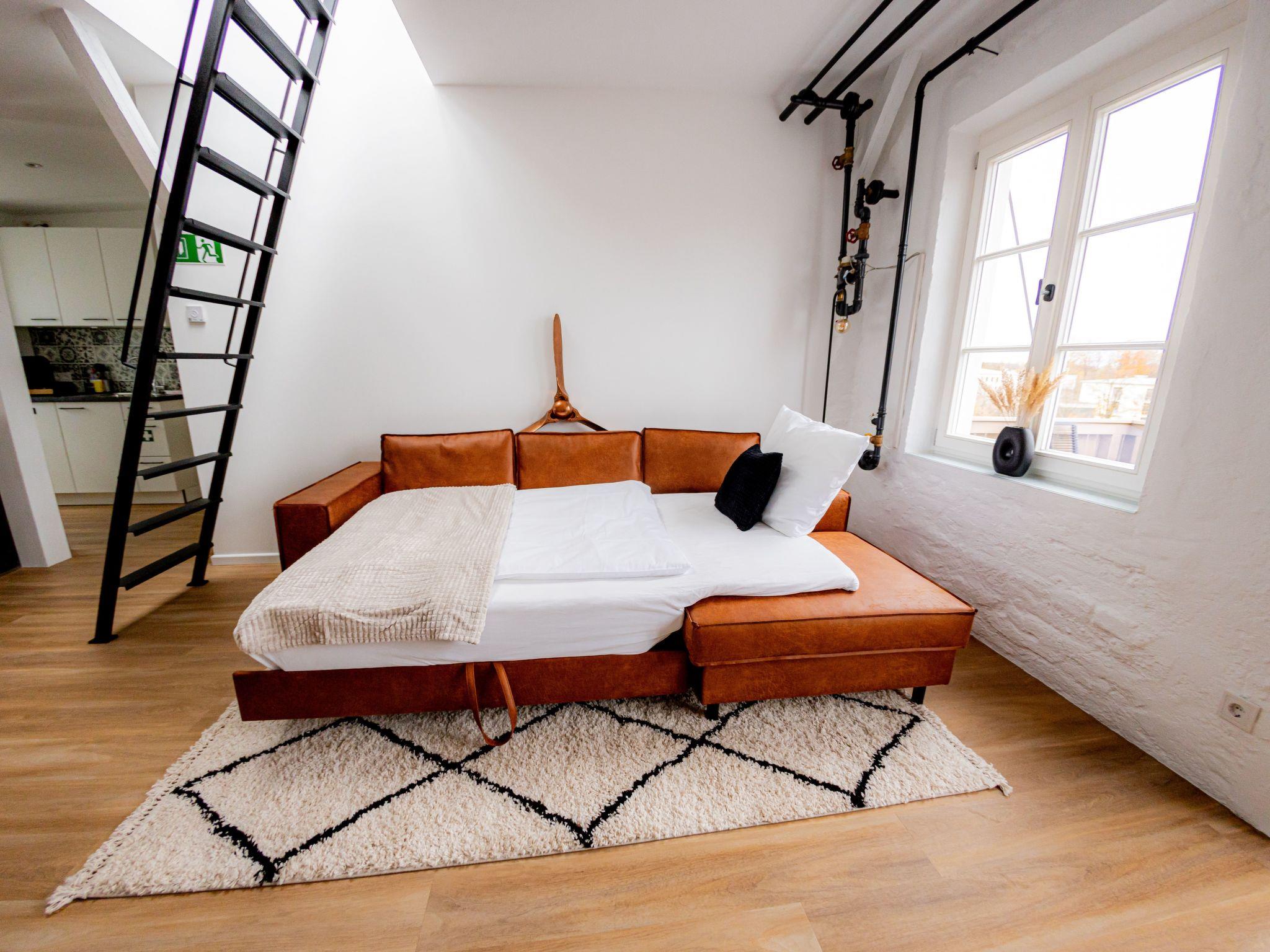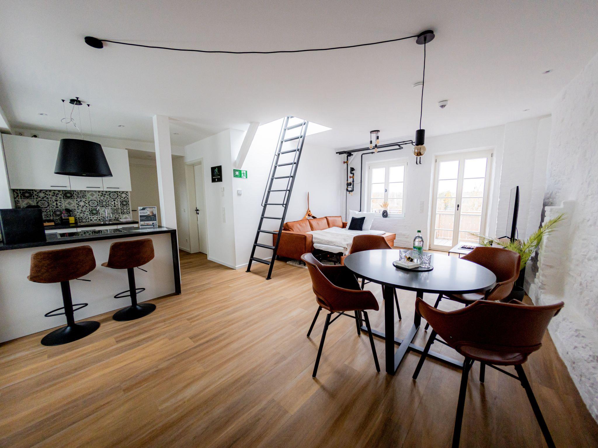 Welcome to our spacious 65 m² holiday flat, perfect for private and business trips. This renovated 2-room flat in an old building offers space for up to 4 people and combines historical charm with modern comfort. The bedroom entices with a luxurious king-size bed, while the living room with open-plan kitchen, balcony and a spacious TV area creates an inviting atmosphere. The sofa bed offers additional space for overnight guests. In the stylish bathroom you will not only find a spacious shower, but also a practical washing machine for your convenience. The flat has been redesigned with modern furniture and stylish details. The flat is located on the 3rd floor right in the centre of Mühldorf. The historic surroundings are complemented by the presence of medical practices in the building, creating a particularly practical location. A free parking space in the garage is also available to ensure your mobility. Enjoy comfort, style and convenience in this charming old building gem.