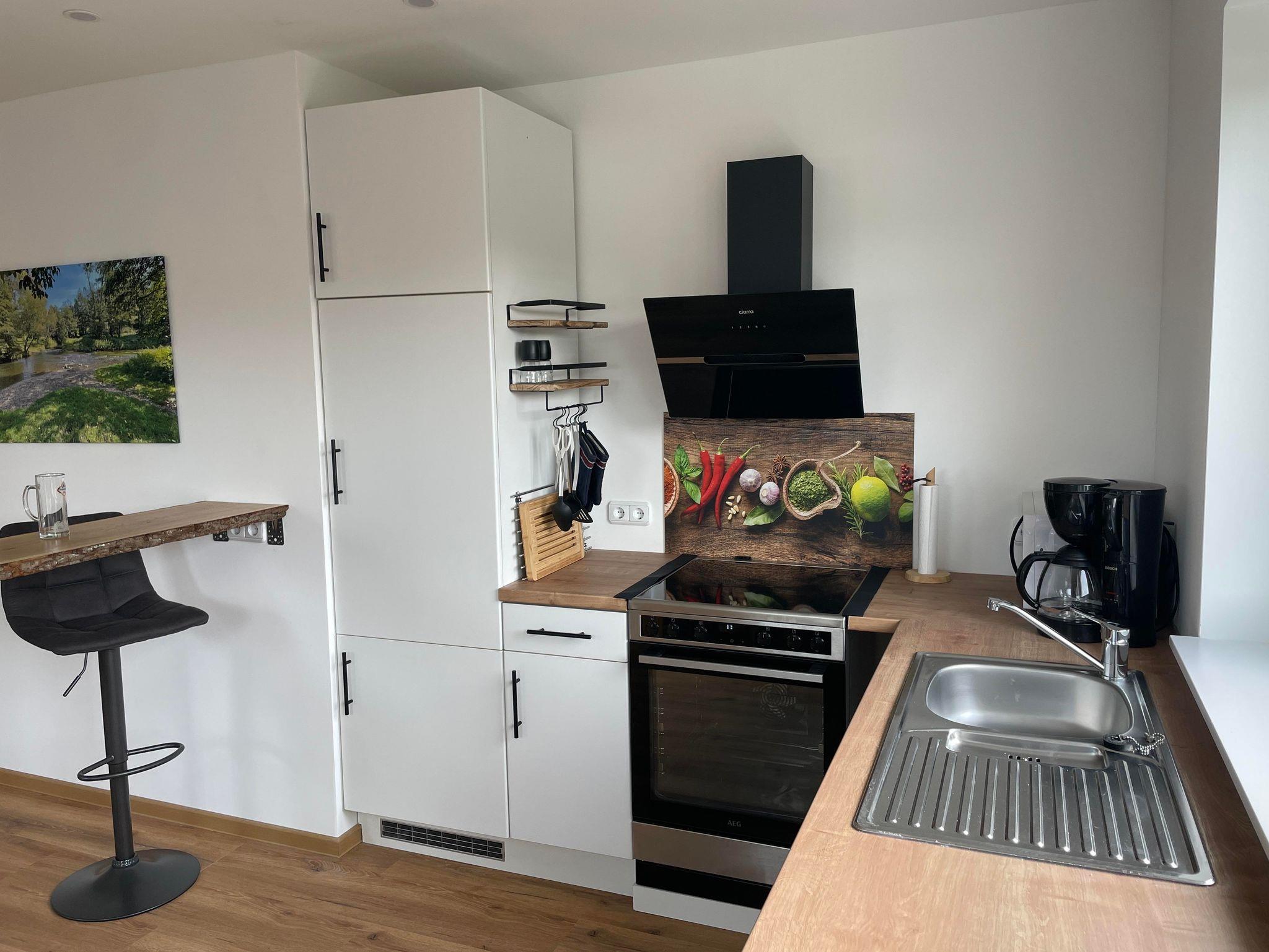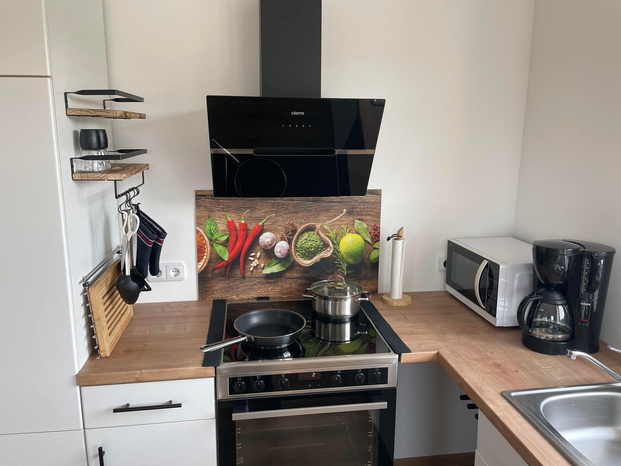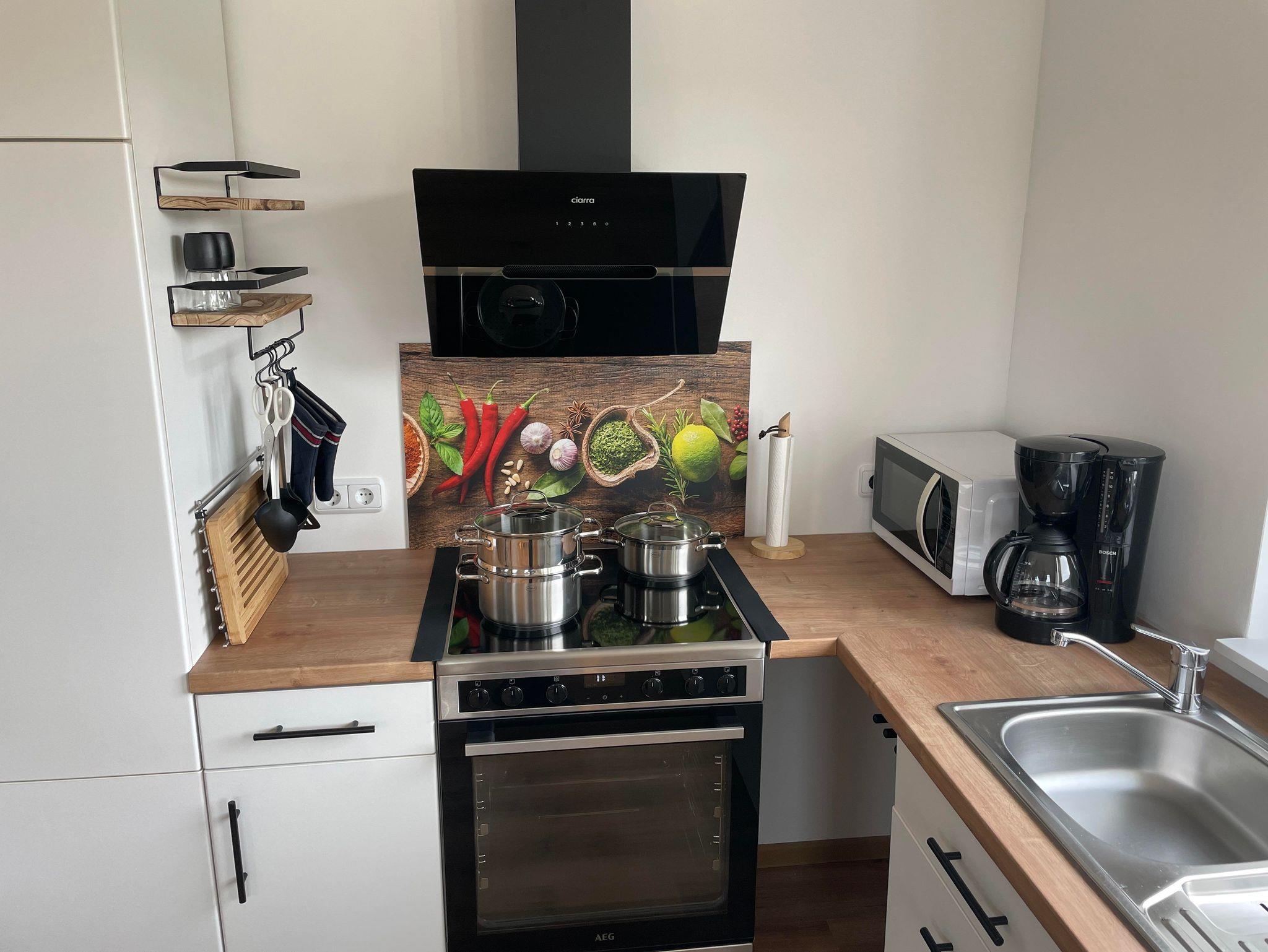 - Vollausgestattete Küche mit Backofen, Herd, Kühlschrank, Gefrierfach, Toaster, Wasserkocher, Kaffemaschine, Spültücher, Spülmittel, Gewürze zum Kochen, Kaffeefilter, Pfannen, Töpfe, Geshirr, Besteck, verschiedene Gläser, Kinder