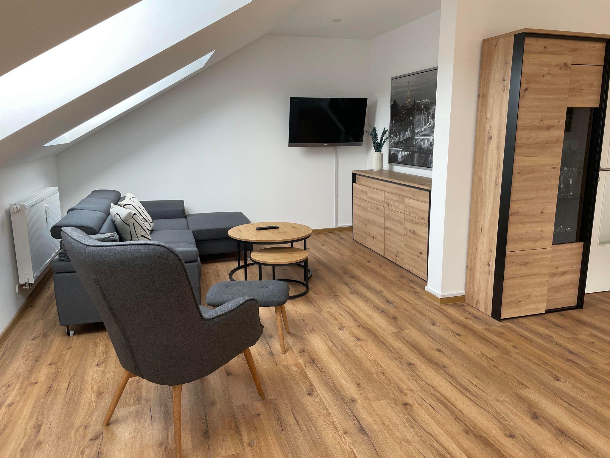 Der Höhepunkt unserer Ferienwohnung ist der offen und modern gestaltete Wohn- und Essbereich mit offener Wohnküchenzeile. Hier bleiben keine Wünsche offen. Die weiße Küche mit integrierter Bar ist ein absoluter Blickfang. Sie läd zum Verweilen und Wohlfühlen ein. Genießen Sie eine Tasse Kaffee oder Tee an der Bar mit Blick auf den Müschenbacher Wald oder lassen Sie den Abend bei einem Glas Wein oder Bier ausklingen. Hier kommt jeder auf seine Kosten. In der Küche, welche wir mit Markengeräten – Backofen, Spülmaschine, Mikrowelle, Kaffeemaschine, etc. - ausgestattet haben, wird jedes Essen zum Genuss. Da wir für Ihren Aufenthalt Gewürze, Spülmittel, Klarspülmittel, Mülltüten, Kaffeefilter, Spül- und Abtrockentücher bereitstellen, können Sie Ihren Urlaub direkt beginnen lassen. Der massive Holztisch strahlt absolute Gemütlichkeit aus. Hier kann man das Leben genießen. Die drei großen Dachfenster schaffen einen lichtdurchfluteten Wohnbereich, an dem man sich erholen kann und die Seele frei atmen kann. Der gemütliche Wohnzimmerbereich rundet das Raumkonzept ab. Ein komfortables Sofa und ein gemütlicher Sessel laden zum Verweilen ein. In den beleuchteten Schränken und Kommoden finden Sie alles was Sie brauchen... ein paar Klassiker zum Lesen, ein paar Spiele, Spielsachen für Kinder und vieles mehr. Natürlich darf auch ein Fernseher mit HD-Empfang nicht fehlen. Das Sofa kann bei Bedarf zu einem Doppelbett ausgezogen werden. Für die kleinsten Gäste können zwei Kinderhochstühle bereit gestellt werden. In der gesamten Wohnung haben Sie W-LAN Empfang. Weiterhin nutzen Sie gerne die Möglichkeit Ihre Endgeräte mit den vorhandenen LAN-Anschlüssen zu verbinden (max. Download 100 Mbit/s, max. Upload 6 Mbit/s).