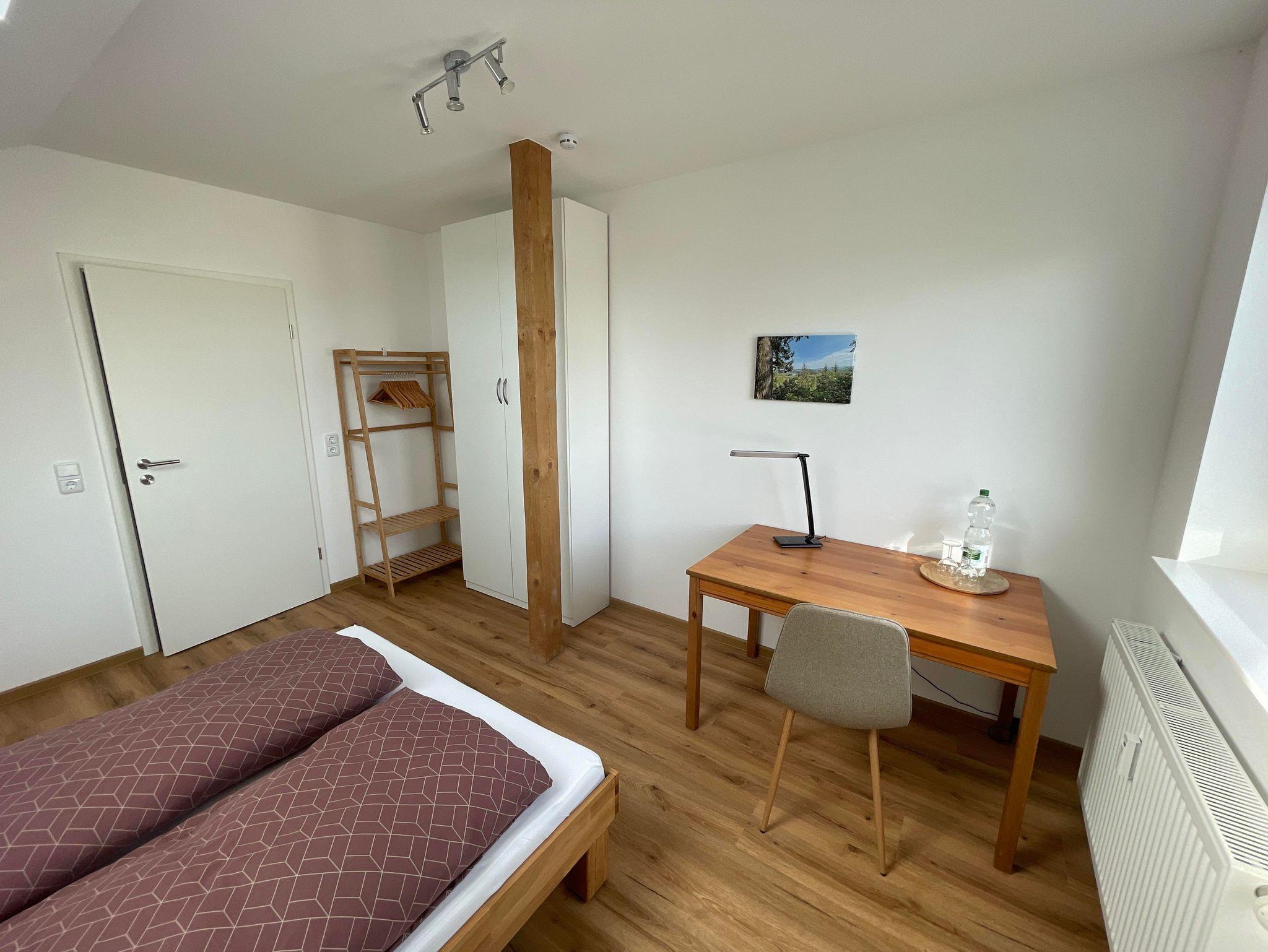 Die Ferienwohnung verfügt über zwei wunderschöne, lichtdurchflutete Schlafzimmer. Das erste Schlafzimmer besticht neben seiner Gemütlichkeit mit dem Doppelbett unter dem Dachfenster. Der Blick auf den Sternenhimmel ist bei einem wolkenfreien Himmel garantiert. Aus dem Fenster blicken Sie über Müschenbach, den Müschenbacher Gemeindewald sowie über die gesamte Kroppacher Schweiz. Das zweite Schlafzimmer verfügt neben einem Doppelbett über ein Stockbett. Somit finden Sie in diesem Raum vier Schlafplätze. Neben den beschriebenen Schlafplätzen verfügt die Ferienwohnung optional über zwei Kinder-Reisebetten, sodass auch die Kleinsten sicher und gemütlich schlafen.