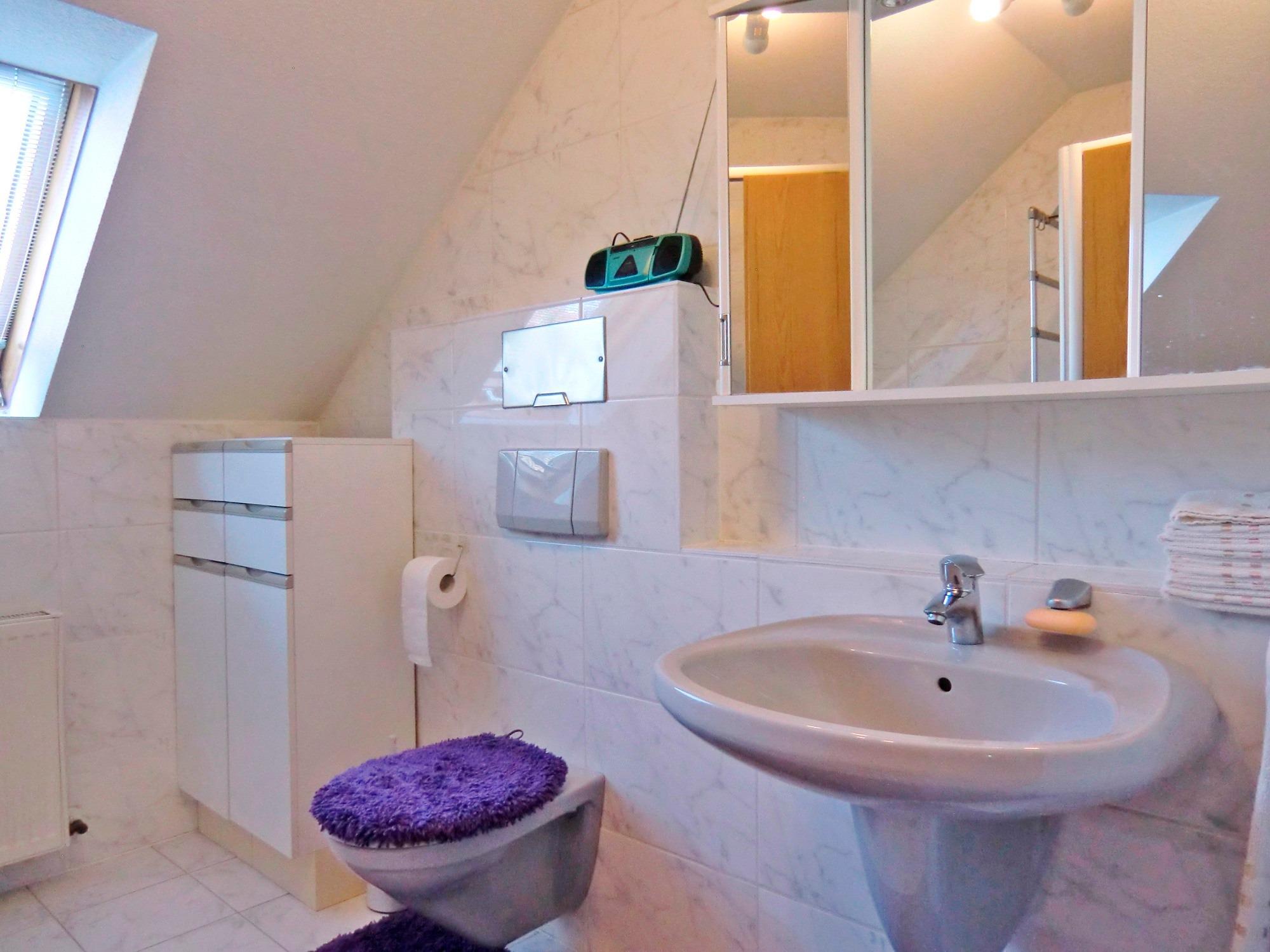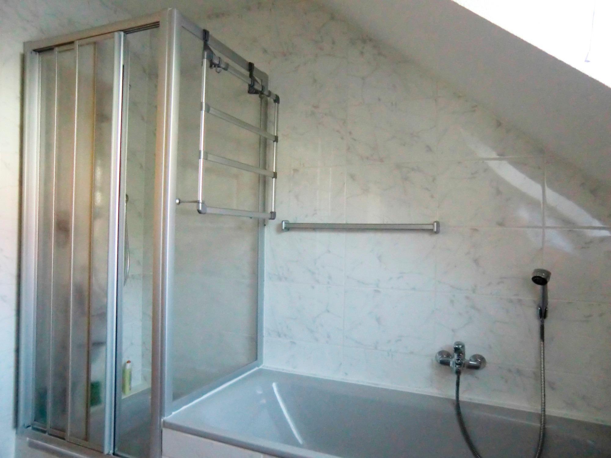 Außerdem erwartet Sie ein modernes, geräumiges Badezimmer mit Duschkabine und Badewanne sowie einem Dachfenster, das für ein helles Ambiente im Bad sorgt.