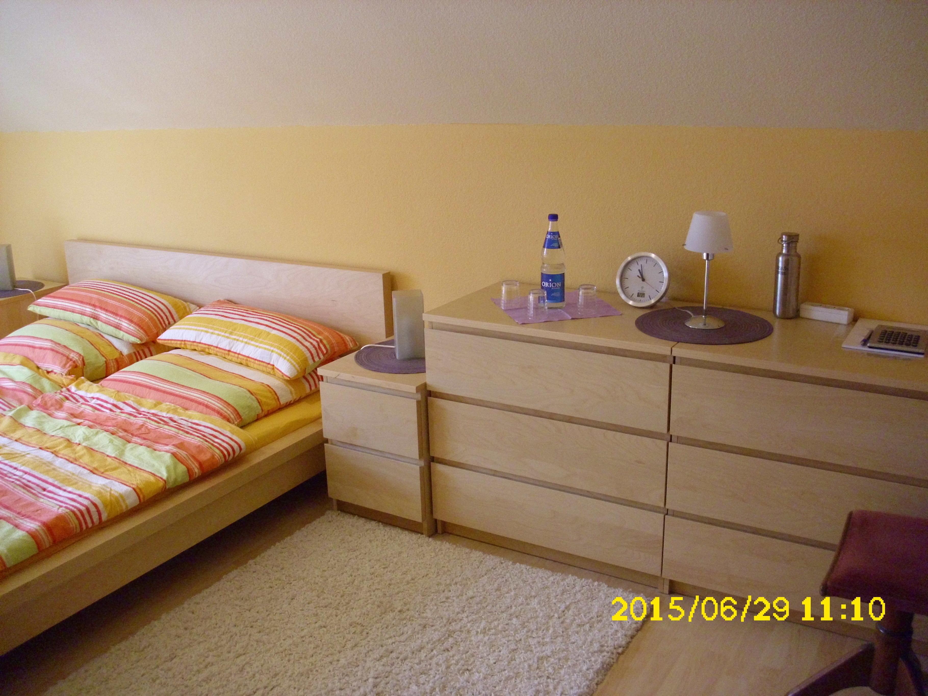 Im Schlafzimmer wartet ein neuwertiges Doppelbett (1,80 m x 2,00 m) auf Sie. Neben Nachttischen, Kommoden und Kleiderschränken finden Sie im Zimmer auch einen Standventilator vor.
