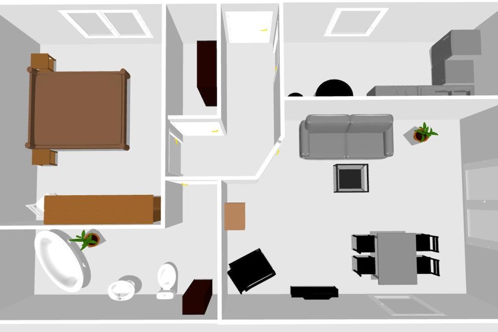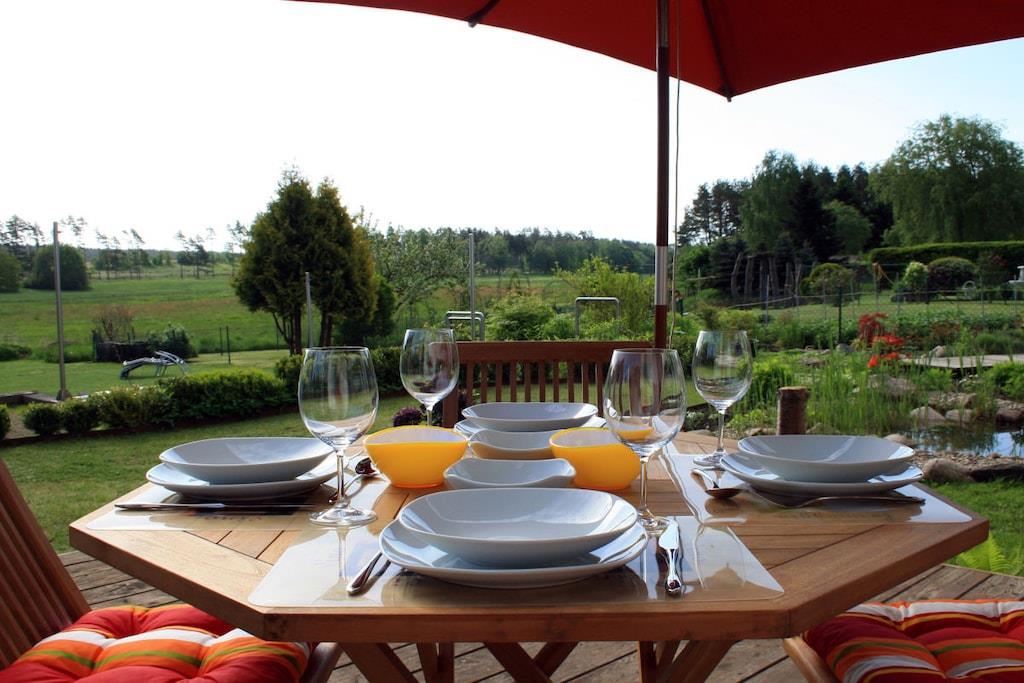 Stueetage: (entre, Køkken(kogeplade, elkedel, brødrister, kaffemaskine, mikrobølgeovn, køleskab, fryser), stue / spisestue(enkeltsovesofa, Fjernsyn, spisebord, radio), soveværelse(dobbeltseng), badeværelse(badekar, håndvask, toilet, føntørrer, Håndklæder inkl.), pulterkammer) terrasse, havemøbler, parkering, dam, Parasol, strygebræt, strygejern