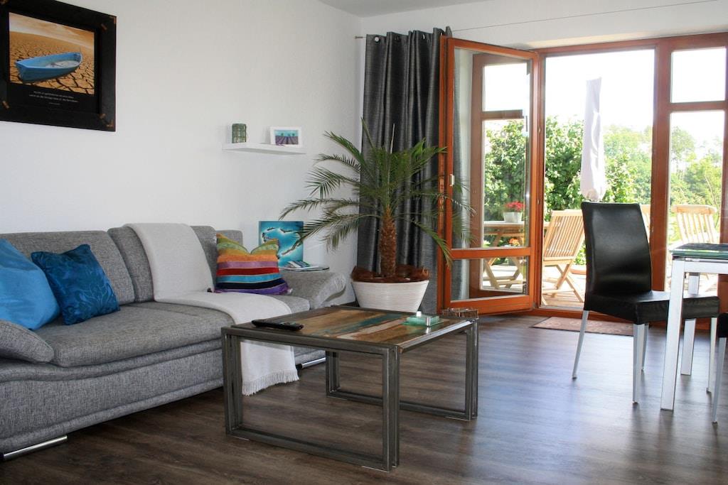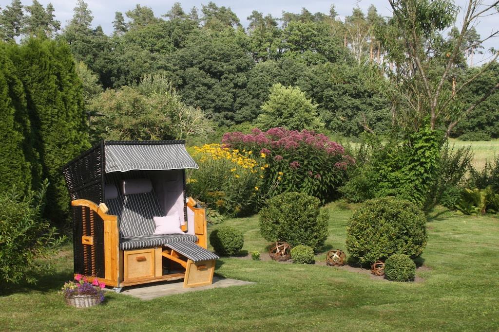Moderne design, beroligende farver og specialfremstillede billeder skaber en feel-good atmosfære, hvor du straks føler dig ankommet og hjemme. Lejligheden i den rolige udkant af Malchow har egen parkeringsplads, terrasse og indgang. Med den store terrasse vender den ud mod haven og enge. Møbler af høj kvalitet med attraktive funktioner tilbyder alle bekvemmeligheder ved en moderne livsstil for 2 voksne. Haveområdet med liggestole og dam inviterer dig til at blive hængende. Bagerst i haven er der en strandstol, hvor du kan slappe af og lade blikket vandre. En Ruf-seng af høj kvalitet sikrer en fredelig søvn.
