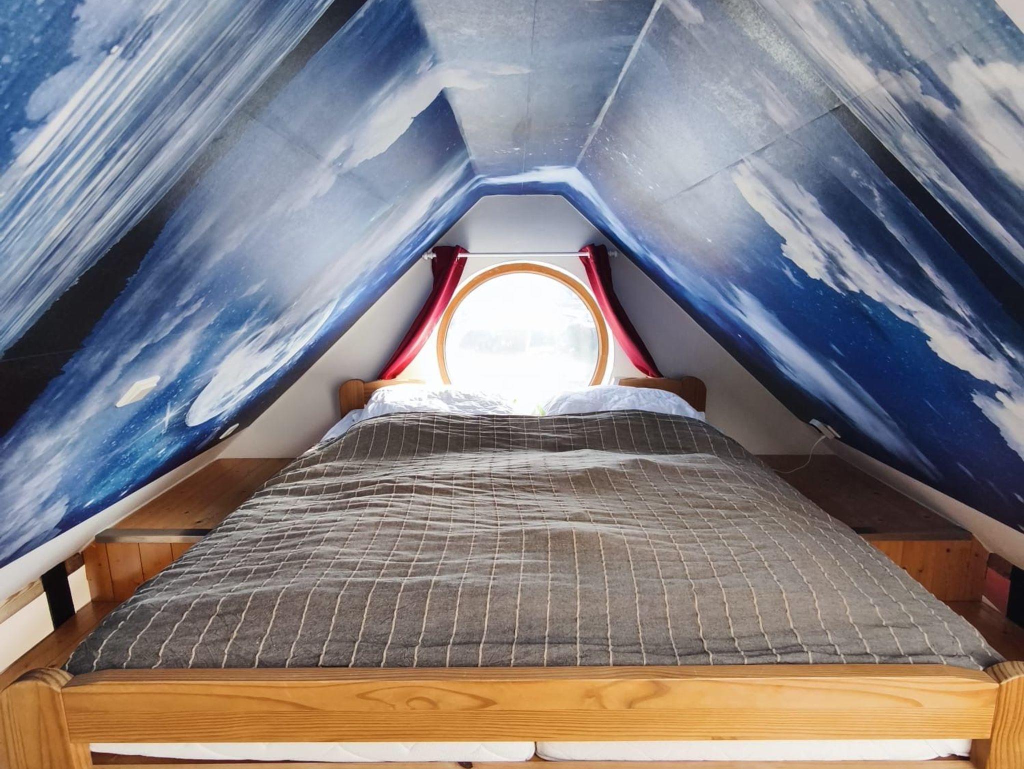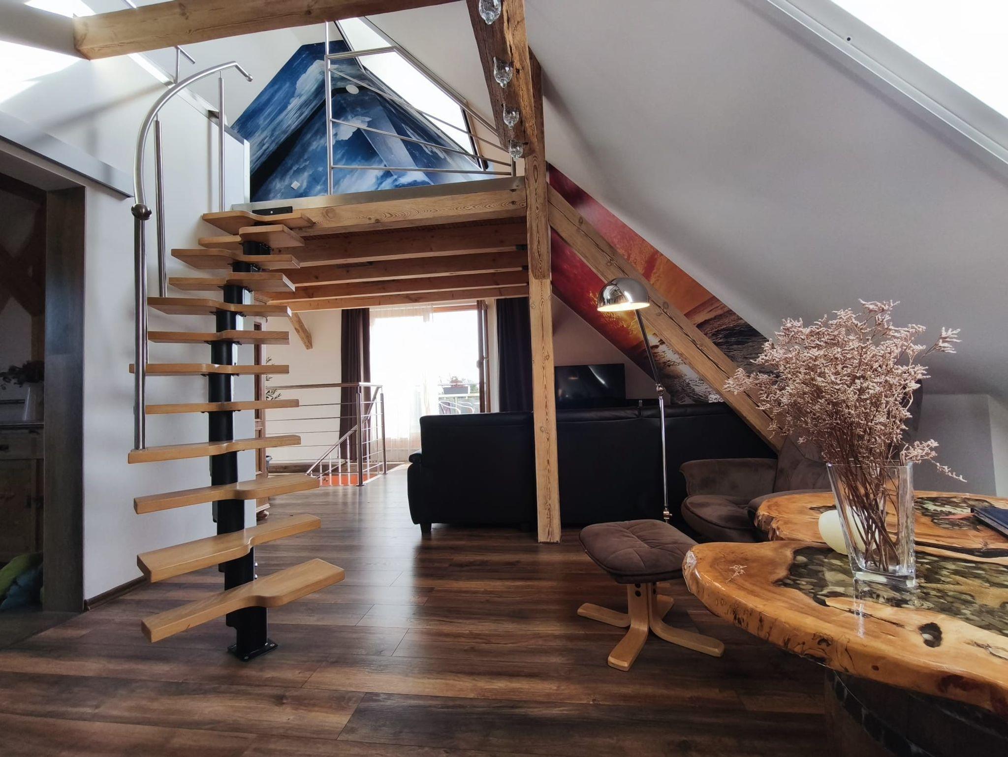 Zum Schlafraum unter dem Dach, mit einem bequemen 1,80m x 2,00m großem Bett, führt eine Wendeltreppe.