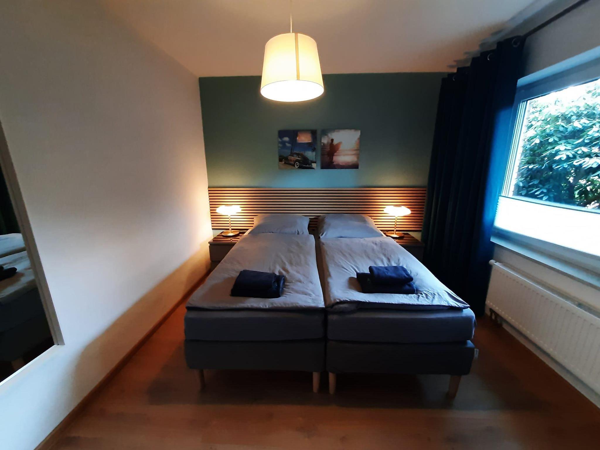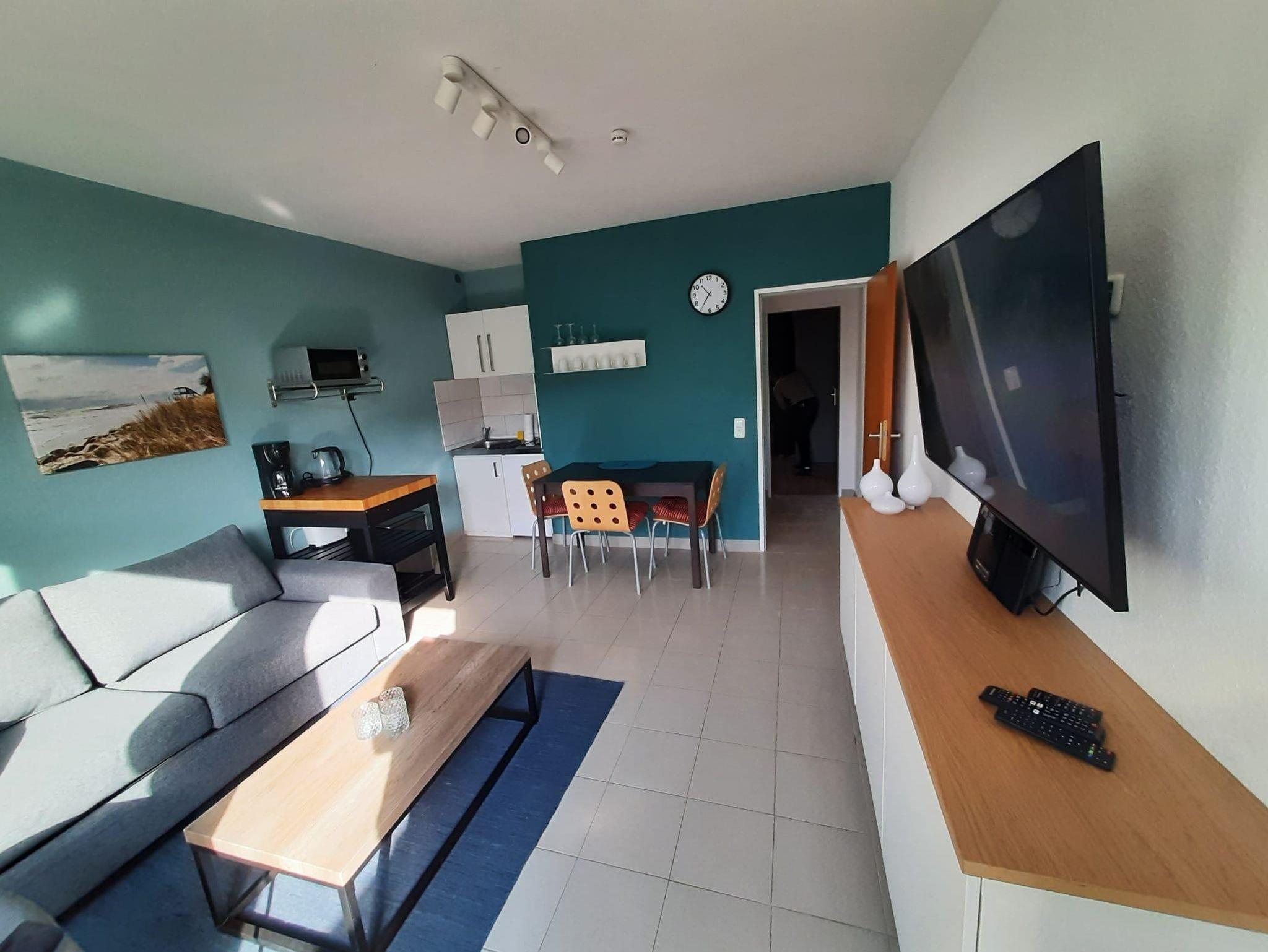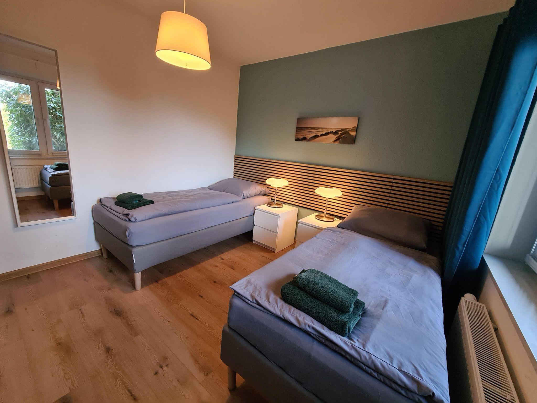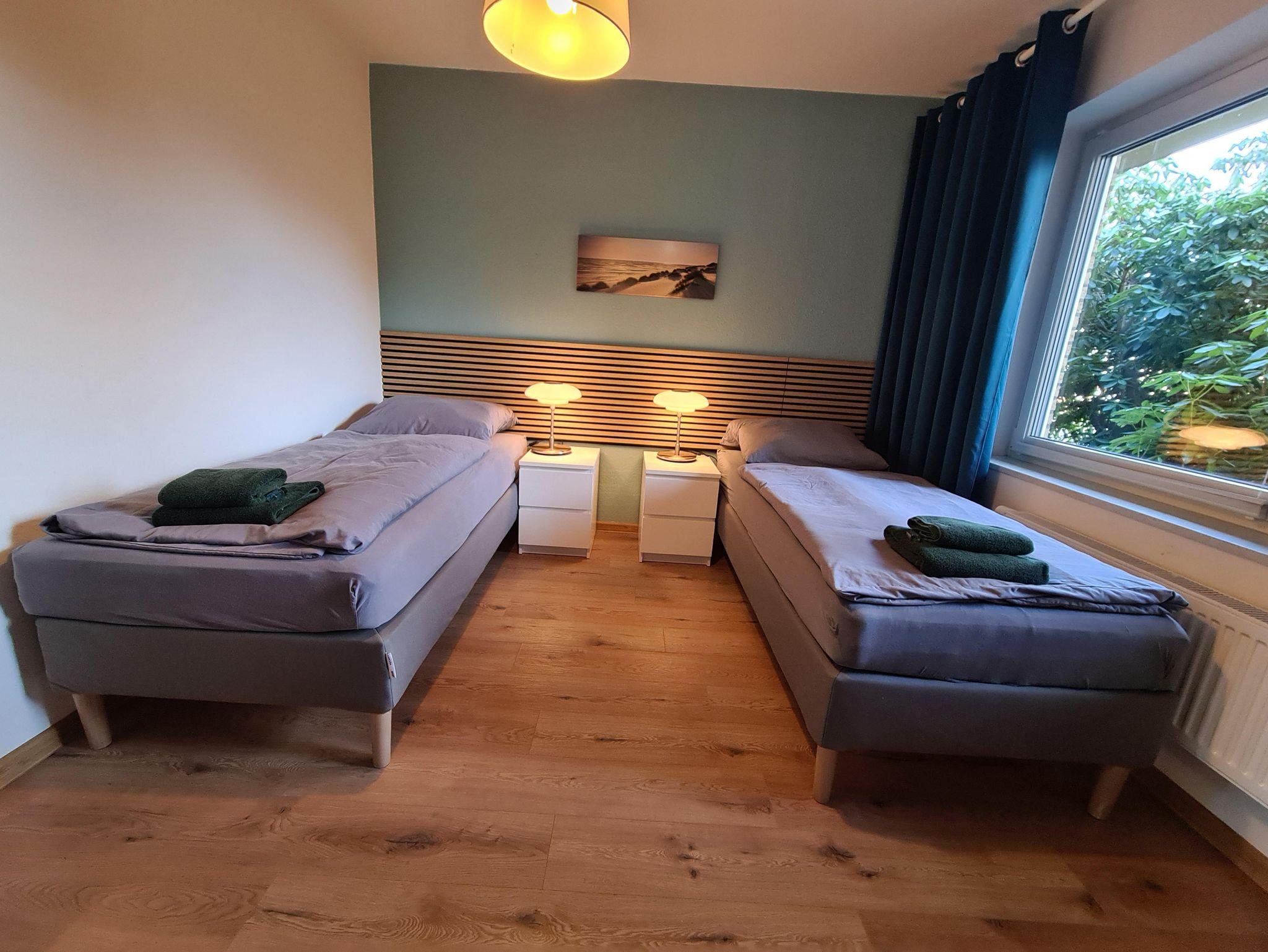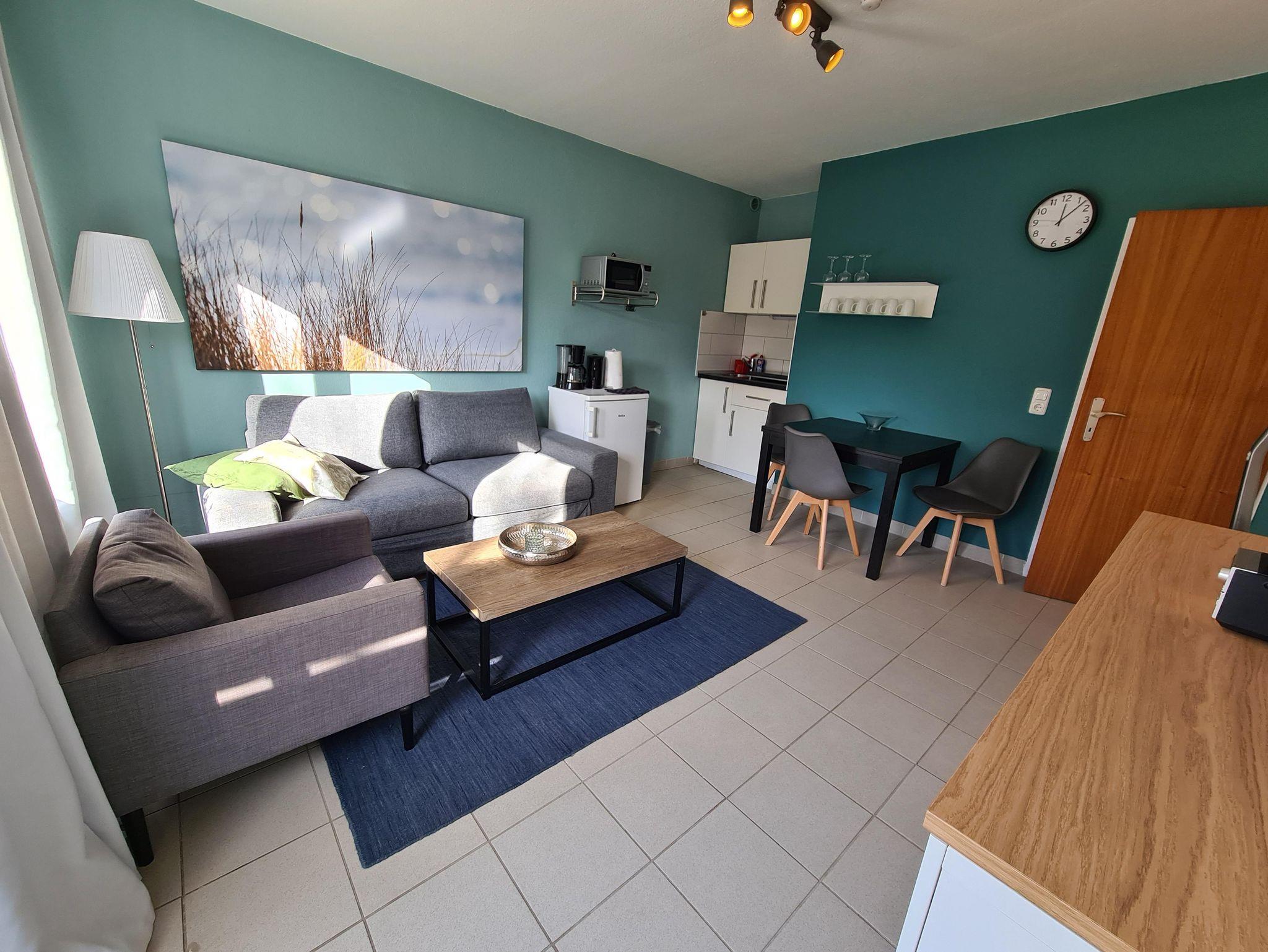 Diese 2-Zimmer-Wohnung (40m²) im Erdgeschoss verfügt über ein Wohn- und Esszimmer inkl. Pantryküche sowie ein separates Schlafzimmer mit Doppelbett (1,80 x 2,00 m.). Im Wohnbereich befindet sich ein Schlafsofa für weitere zwei Personen. Zusätzlich steht eine eigene Terrasse zur Verfügung. Haustiere können nach Absprache gegen eine zusätzliche Gebühr von 8,- € pro Nacht und Tier mitgebracht werden.