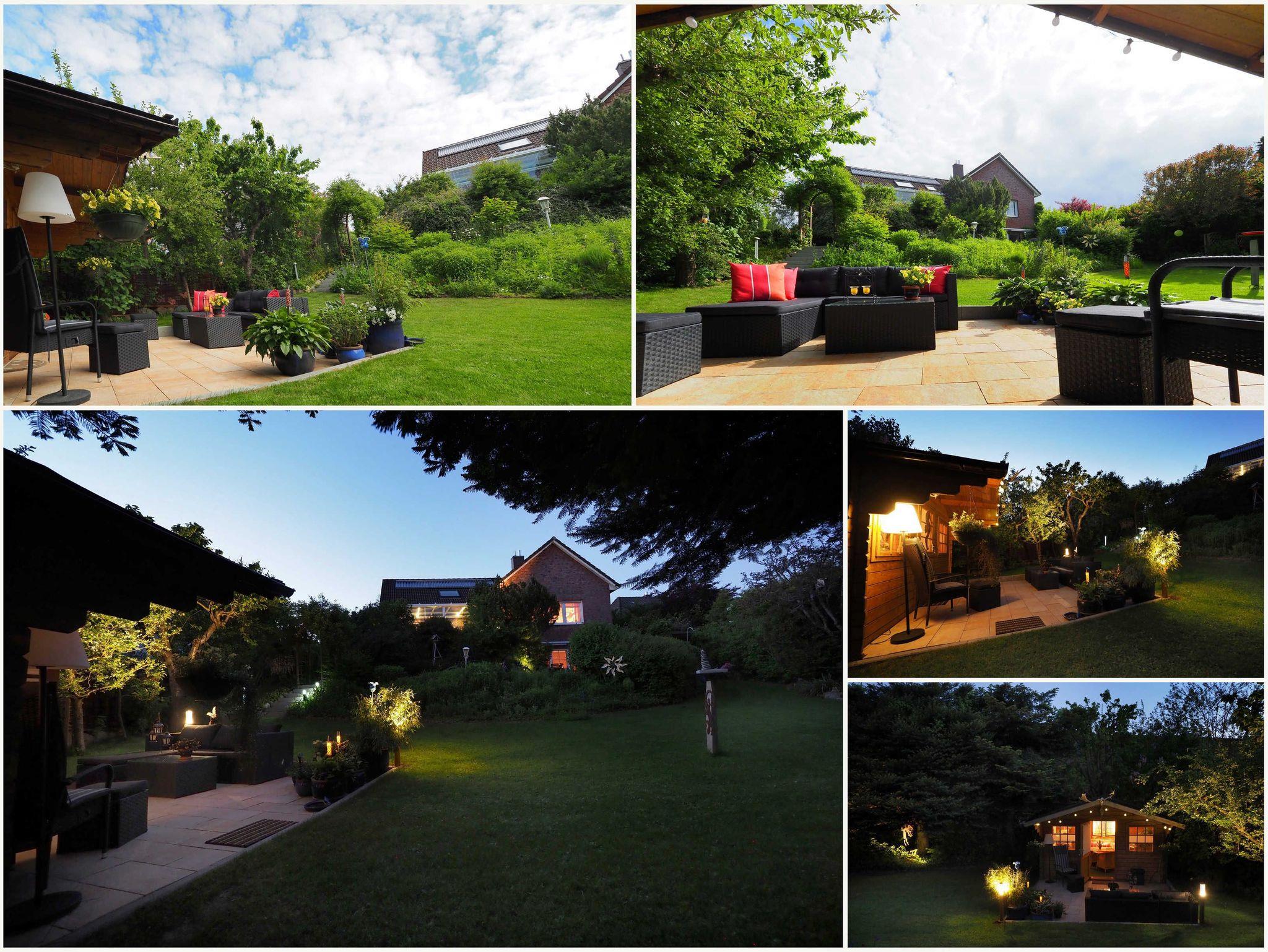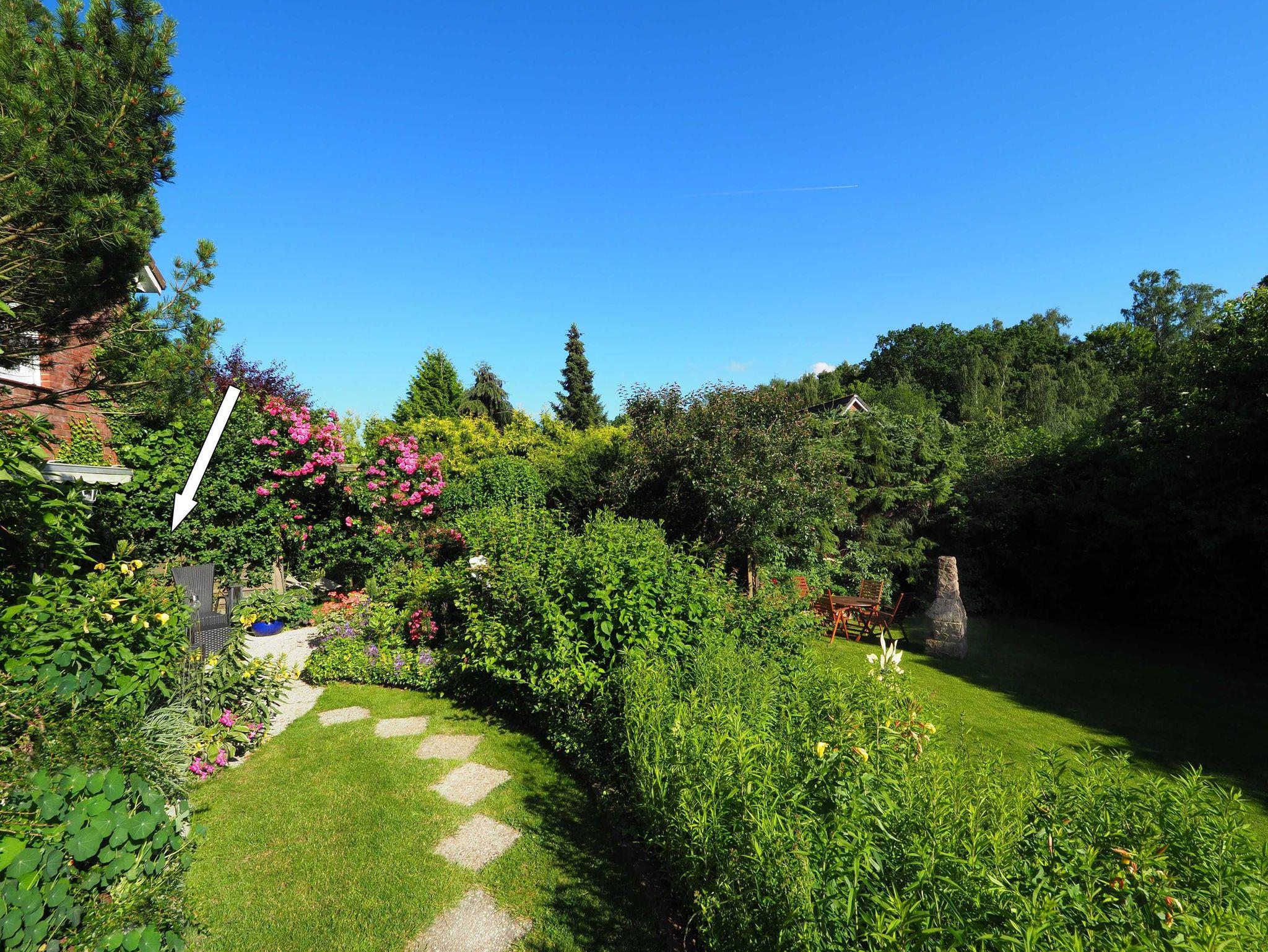 Zur Wohnung gehört ebenso eine große, eigene Südterrasse (Markise, bequeme Gartenmöbel / Liegestühle) und eine schattige Laube sowie eine Liegewiese in gepflegter Gartenanlage (1000 m²), Webergrill und Außenkamin.