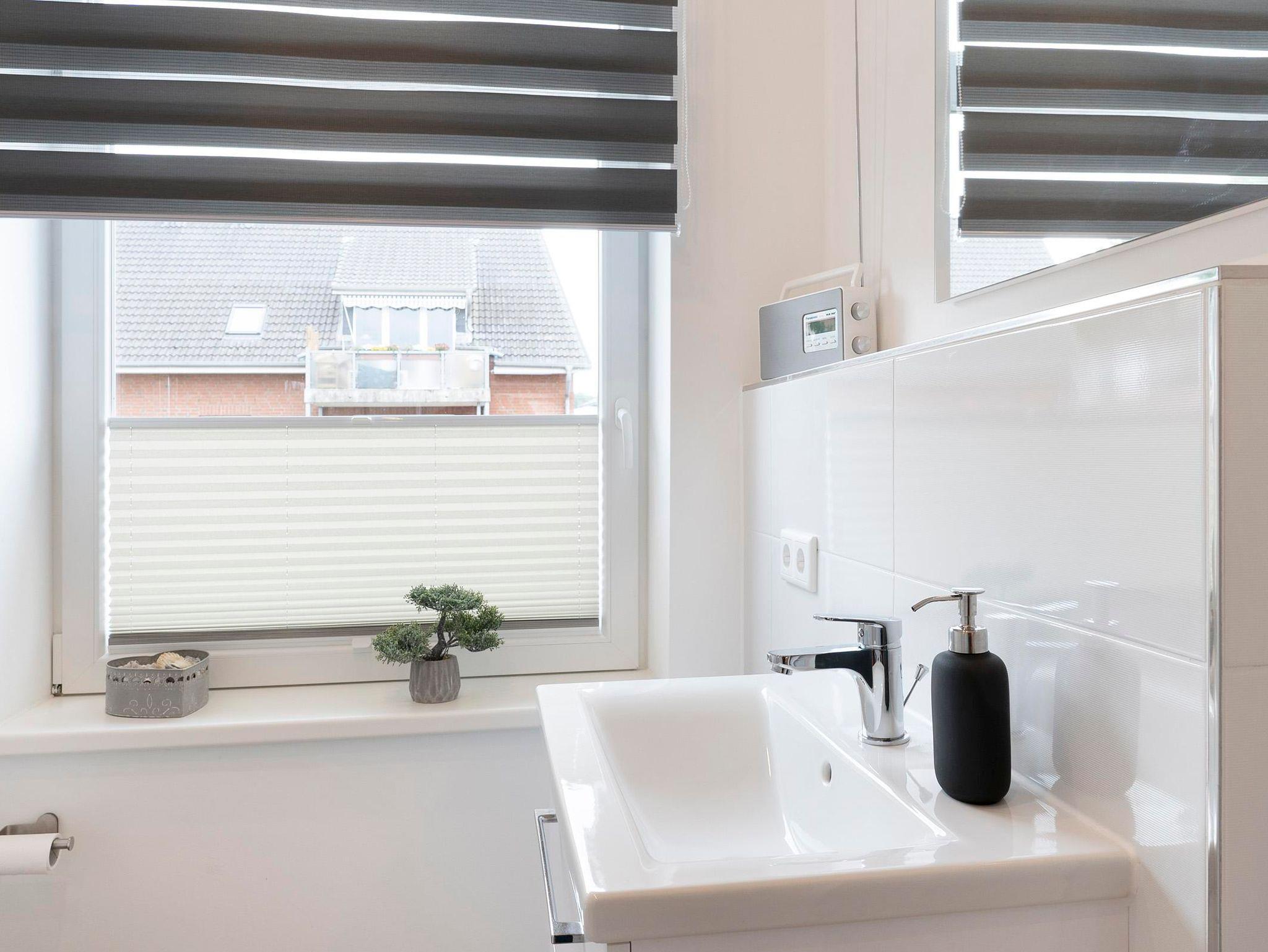 Die Küche ist modern ausgestattet und verfügt über einen Induktionsherd sowie einen Essplatz. Neben einer Filterkaffeemaschine steht auch ein Kaffeevollautomat zur Verfügung. Das helle Duschbad verfügt über ein Waschbecken, WC und Dusche.