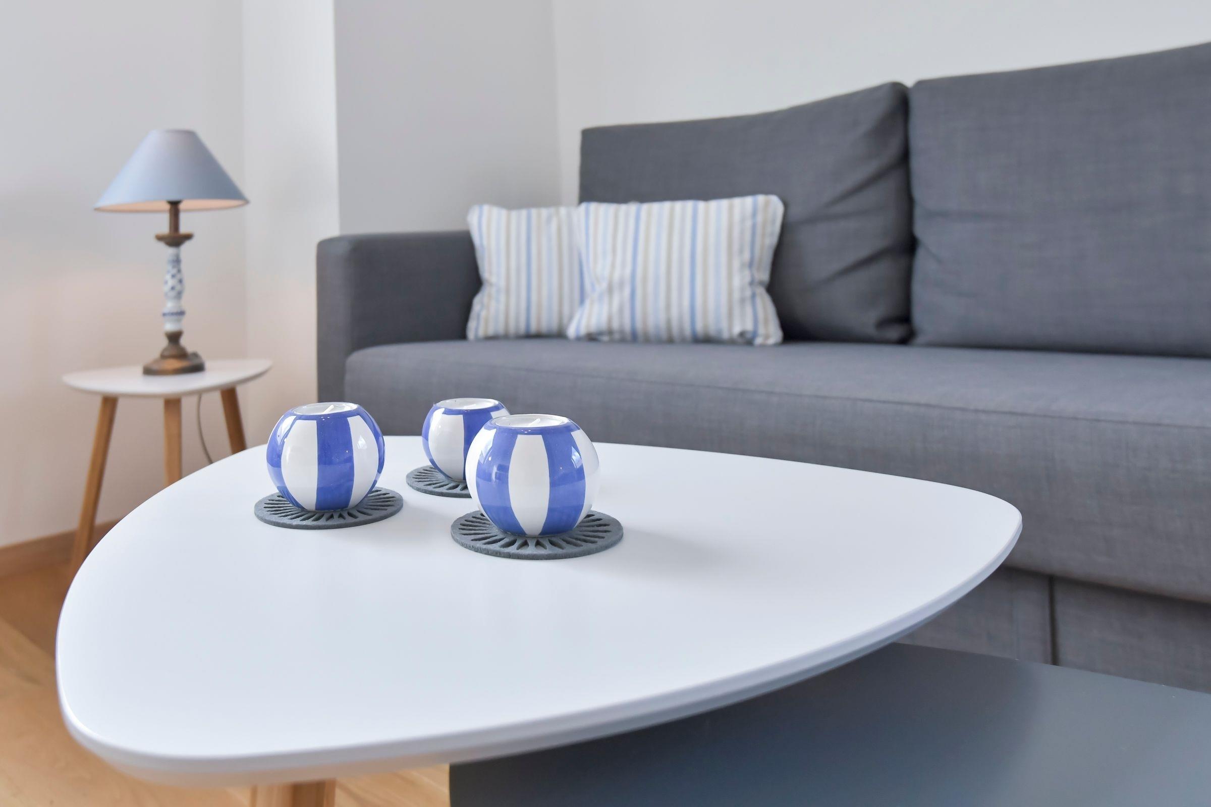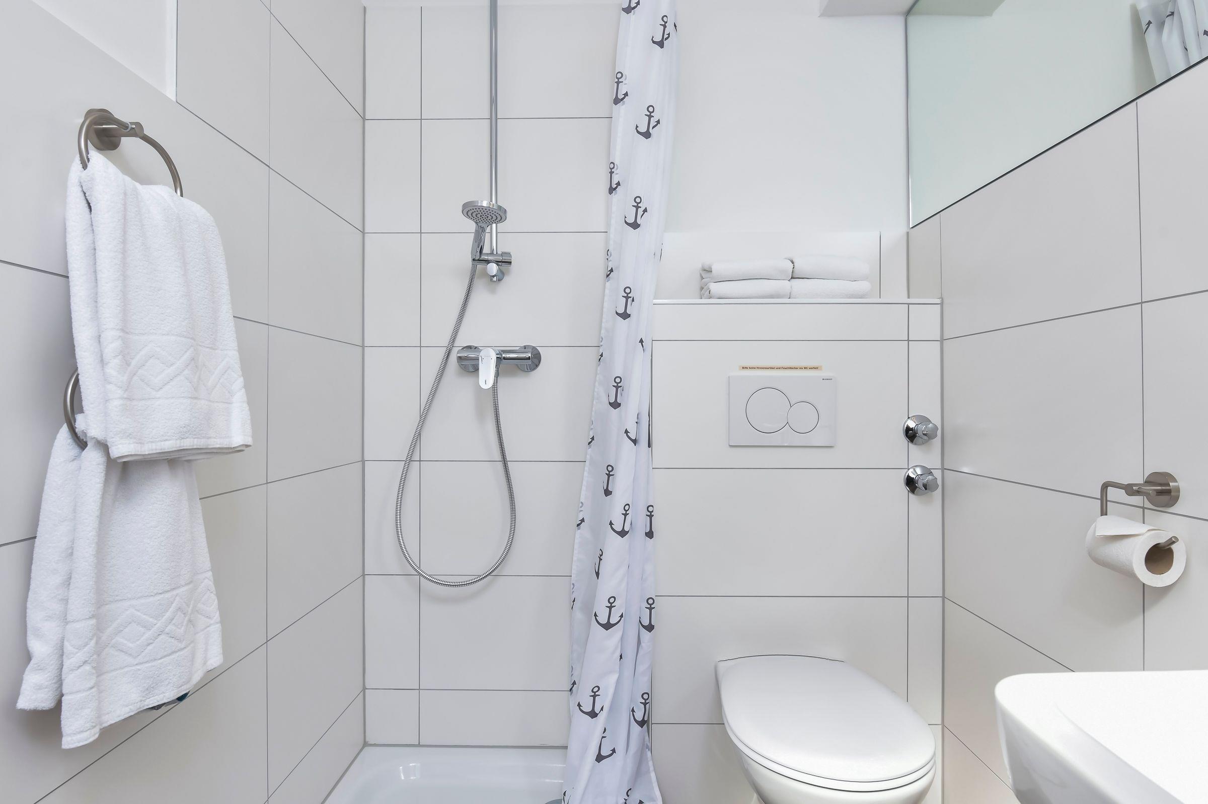 Das Schlafzimmer ist mit einem bequemen Doppelbett (2x 90x200cm) und einem geräumigen Kleiderschrank ausgestattet, im Wohnzimmer befindet sich ein gemütliches Schlafsofa (Liegefläche ca. 140x200 cm), Rollos und Plissees dienen als Verdunklung. Hier ist auch Platz für ein Kinderreisebettchen. Für die kleinen Gäste ist sowohl ein Kinderreisebettchen als auch ein Hochstuhl vorhanden. In der modernen, separaten Küche lassen sich mit Induktionsherd mit 2 Kochfeldern und Backofen leckere Urlaubsgerichte zaubern, die Spülmaschine kümmert sich um den Abwasch. Das elegante Tageslichtbad ist hell gefliest und mit Dusche, Hänge-WC, Waschbecken und Spiegel komfortabel ausgestattet.