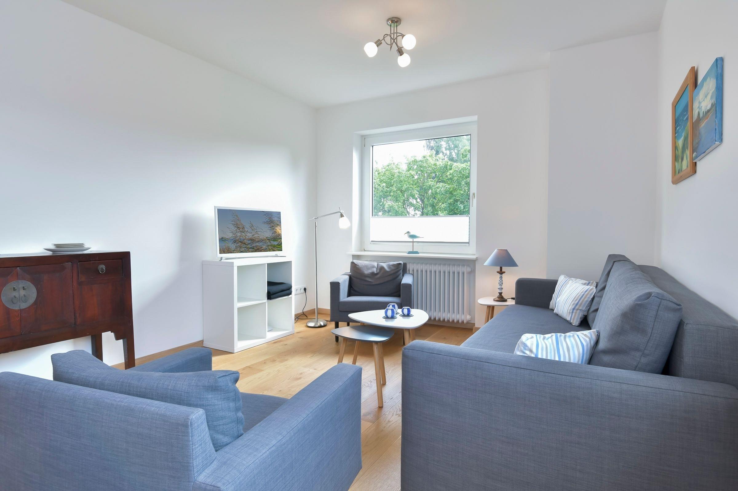 Das Wohnzimmer ist geschmackvoll mit Schlafsofa (Liegefläche ca. 160x200cm) und zwei Sesseln sowie Flatscreen-TV möbliert, Plissees sorgen für angenehmen Licht- und Sichtschutz. Ein Essplatz für drei mit Blick ins Grüne ist in den Wohnbereich integriert. Ein WLAN-Anschluss ist inklusive.