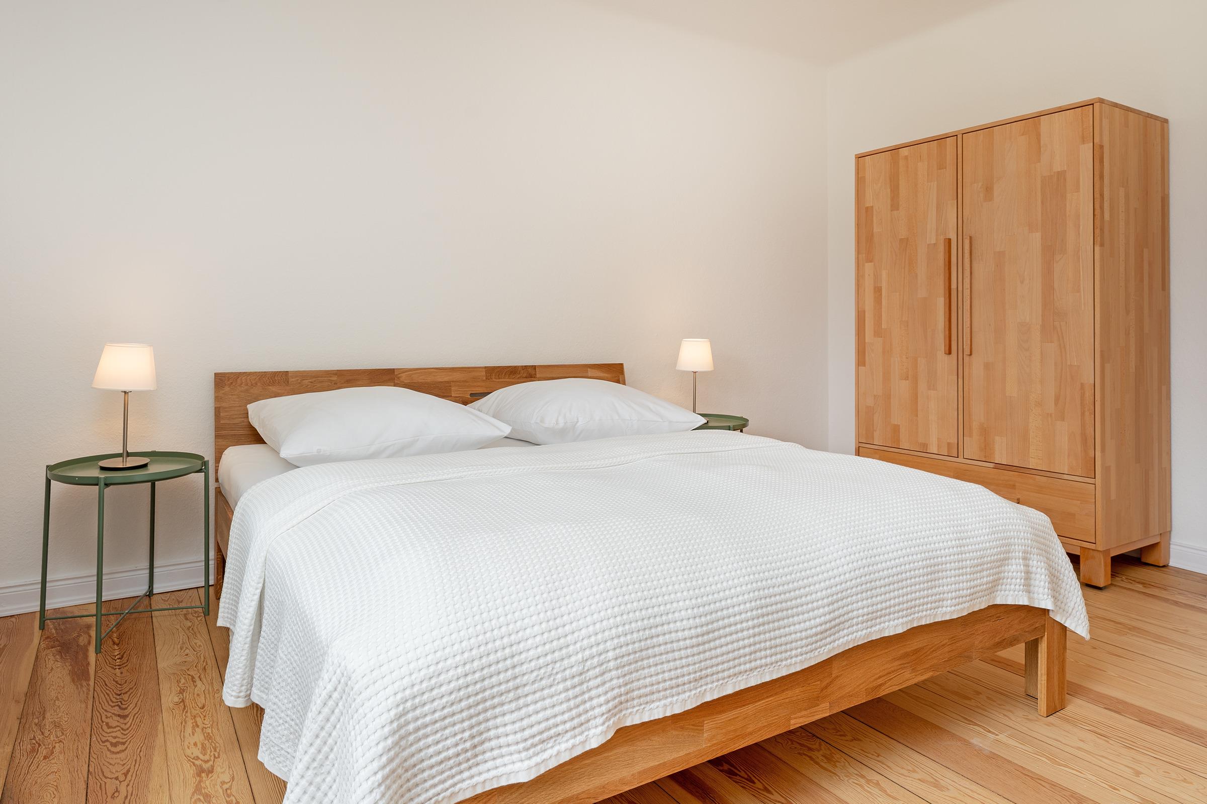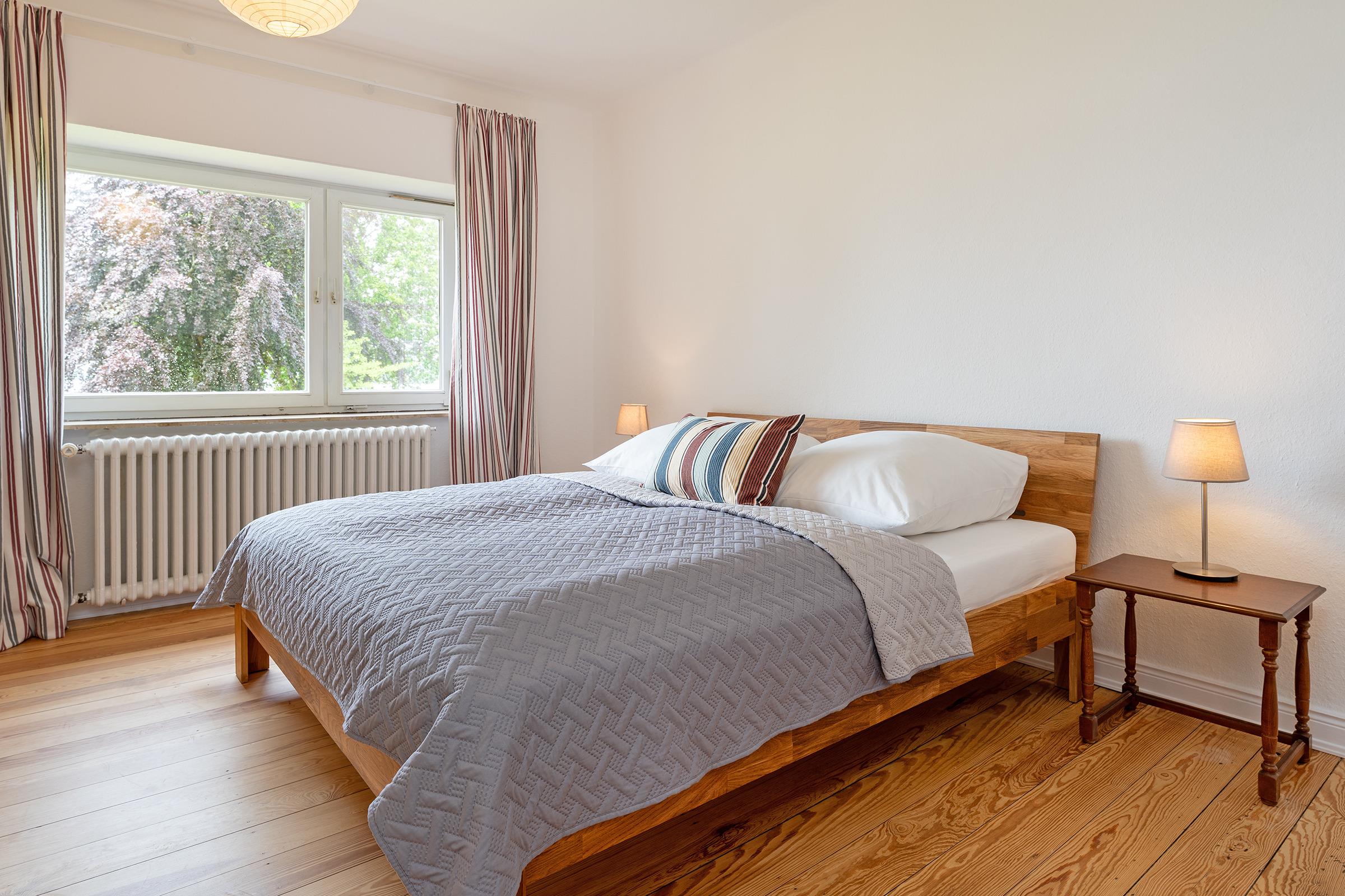 Schlafzimmer 1: Doppelbett (2x 90x200 cm), Kleiderschrank, Verdunklungsmöglichkeit: Vorhänge und Rollläden, Platz für Babybett vorhanden