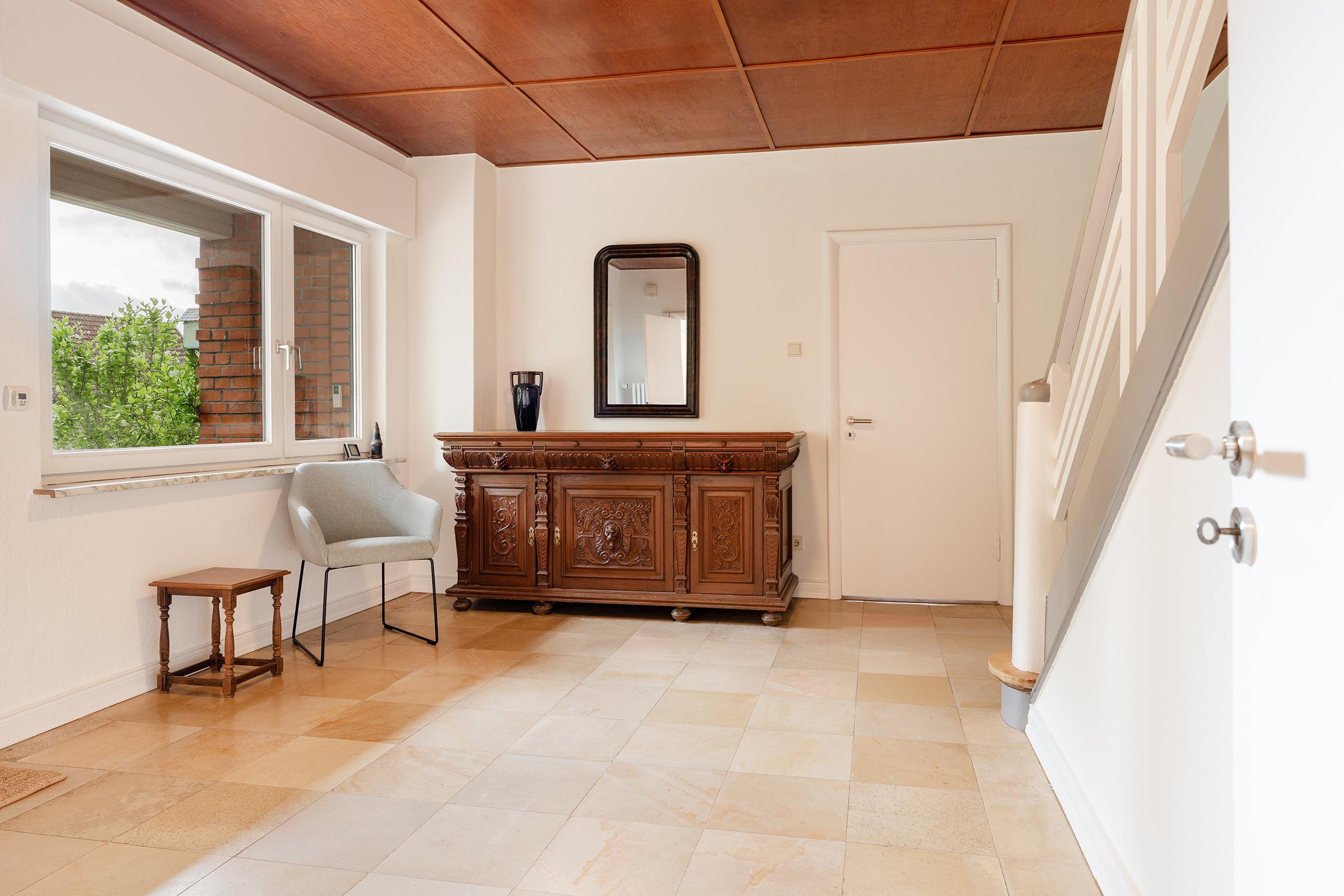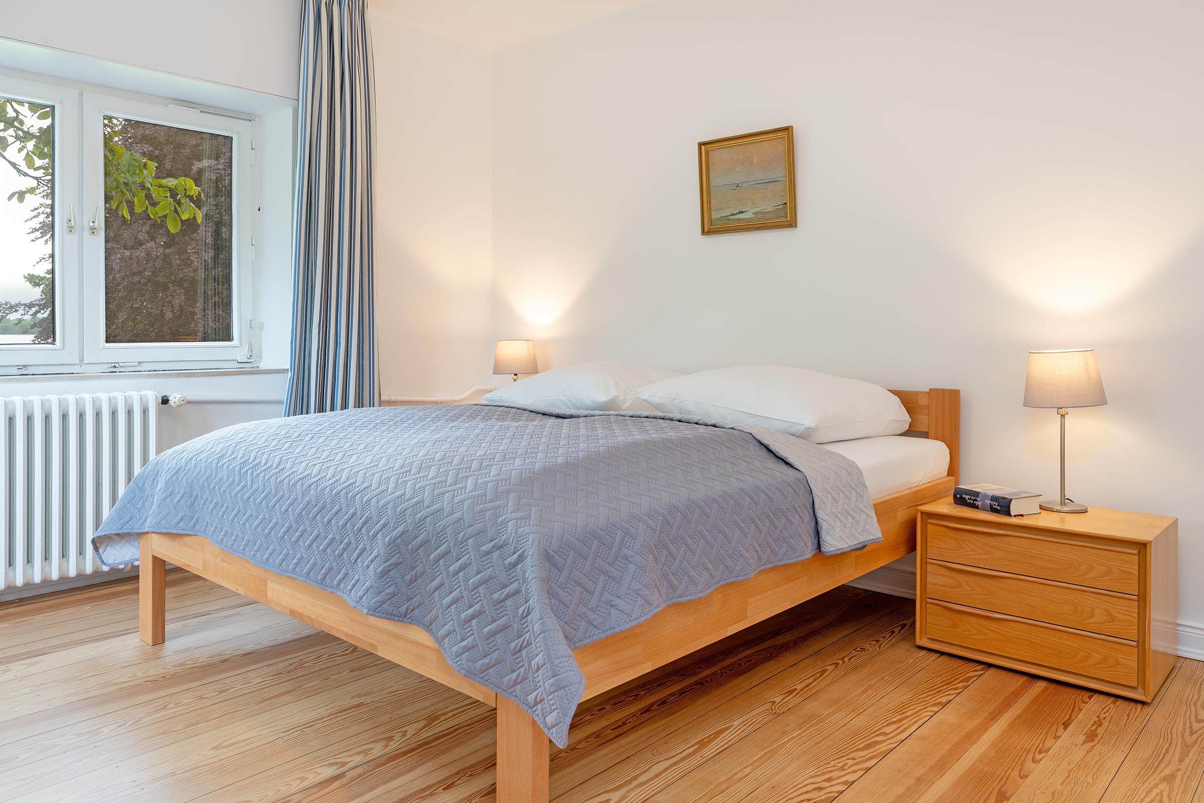 Der helle Wohnbereich mit Kaminofen lädt zu entspannten Abenden ein. Großzügige Fensterfronten eröffnen den Blick ins Grüne und auf den nahegelegenen See. Direkt angrenzend genießen Sie auf der nach Westen ausgerichteten Terrasse sonnige Nachmittage oder lauschige Abende. Gartenmöbel, ein Sonnenschirm und ein Strandkorb stehen Ihnen zur Verfügung. Die separate Küche ist hochwertig ausgestattet: Ceranfeld, Backofen, Mikrowelle, extra Gefrierschrank, Kühlschrank, Kaffeemaschine, Toaster und Wasserkocher lassen keine Wünsche offen. Gemeinsam speisen Sie in einem separaten Essbereich mit Ausblick auf das Seegeschehen. Fünf Schlafzimmer bieten Platz für bis zu acht Personen und sind gemütlich und stilvoll eingerichtet. Zwei Bäder im Obergeschoss sorgen für Komfort: eines ist mit einer Dusche, das andere mit einer Badewanne ausgestattet. Zwei Gäste-WCs im Erdgeschoss runden das Angebot ab.