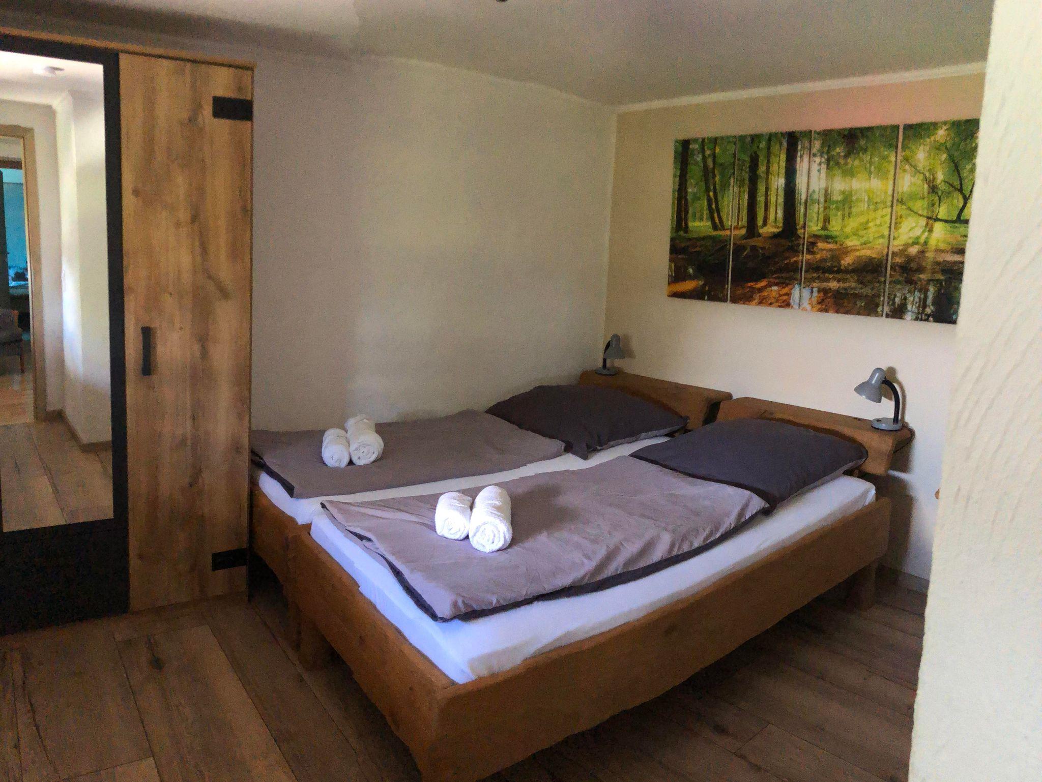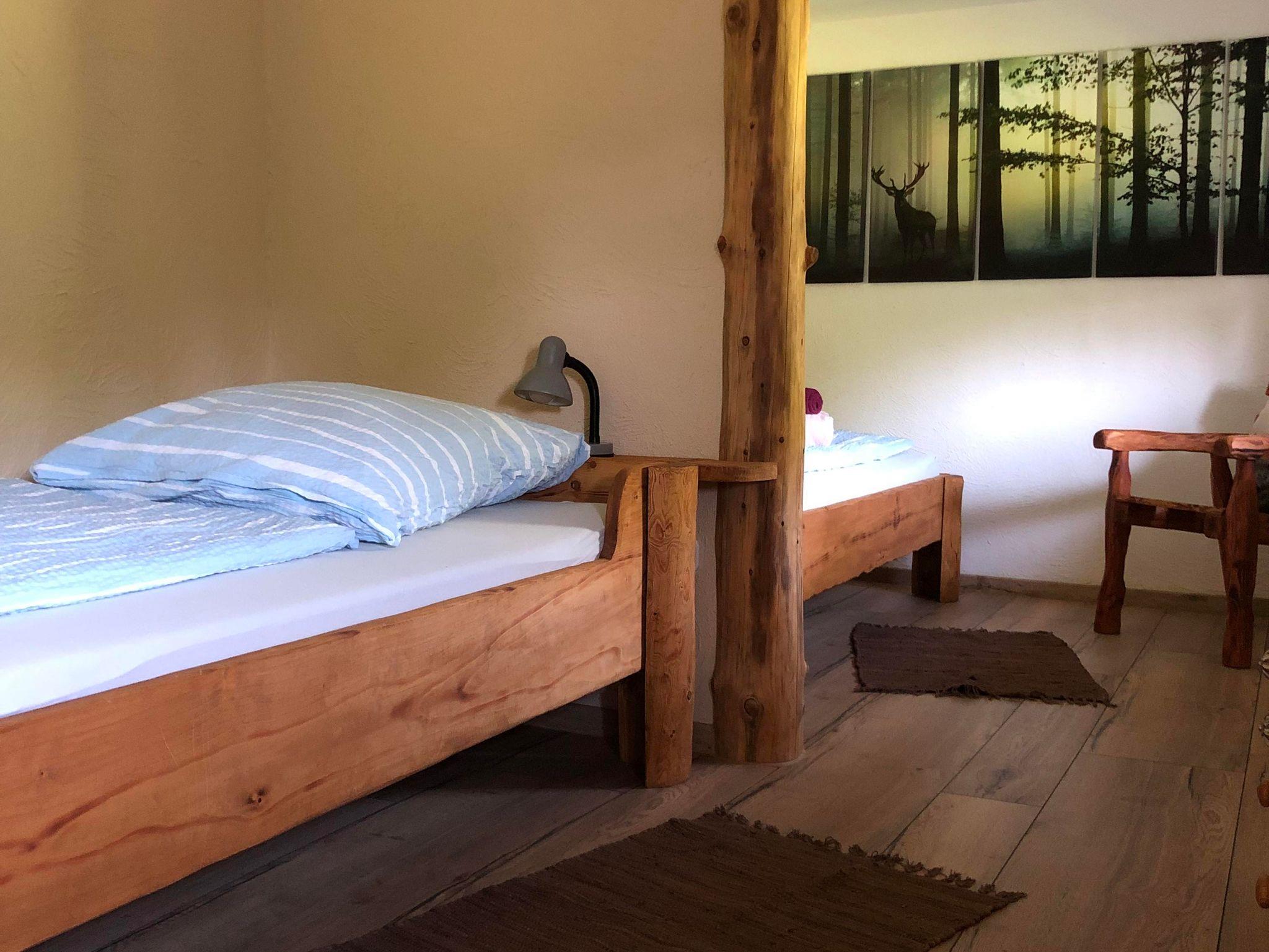 Über eine Buchentreppe mit 12 Stufen geht's zu den drei Schlafräumen (1 Doppelbettzimmer und zwei 2-Bett-Zimmer) und dem zweiten Bad mit Dusche/WC. Die absolut ruhige Alleinlage gibt Raum zum Erholen und Natur genießen.