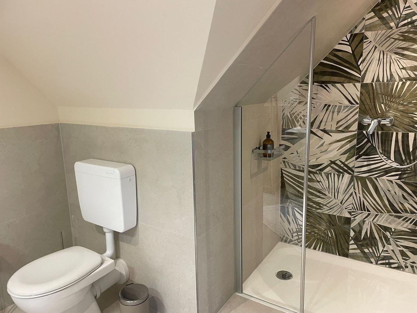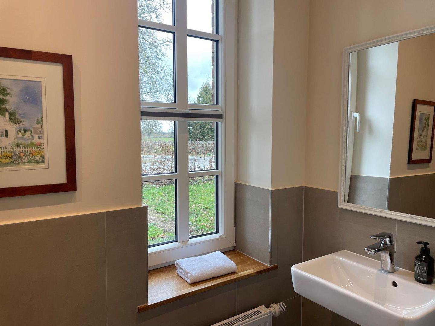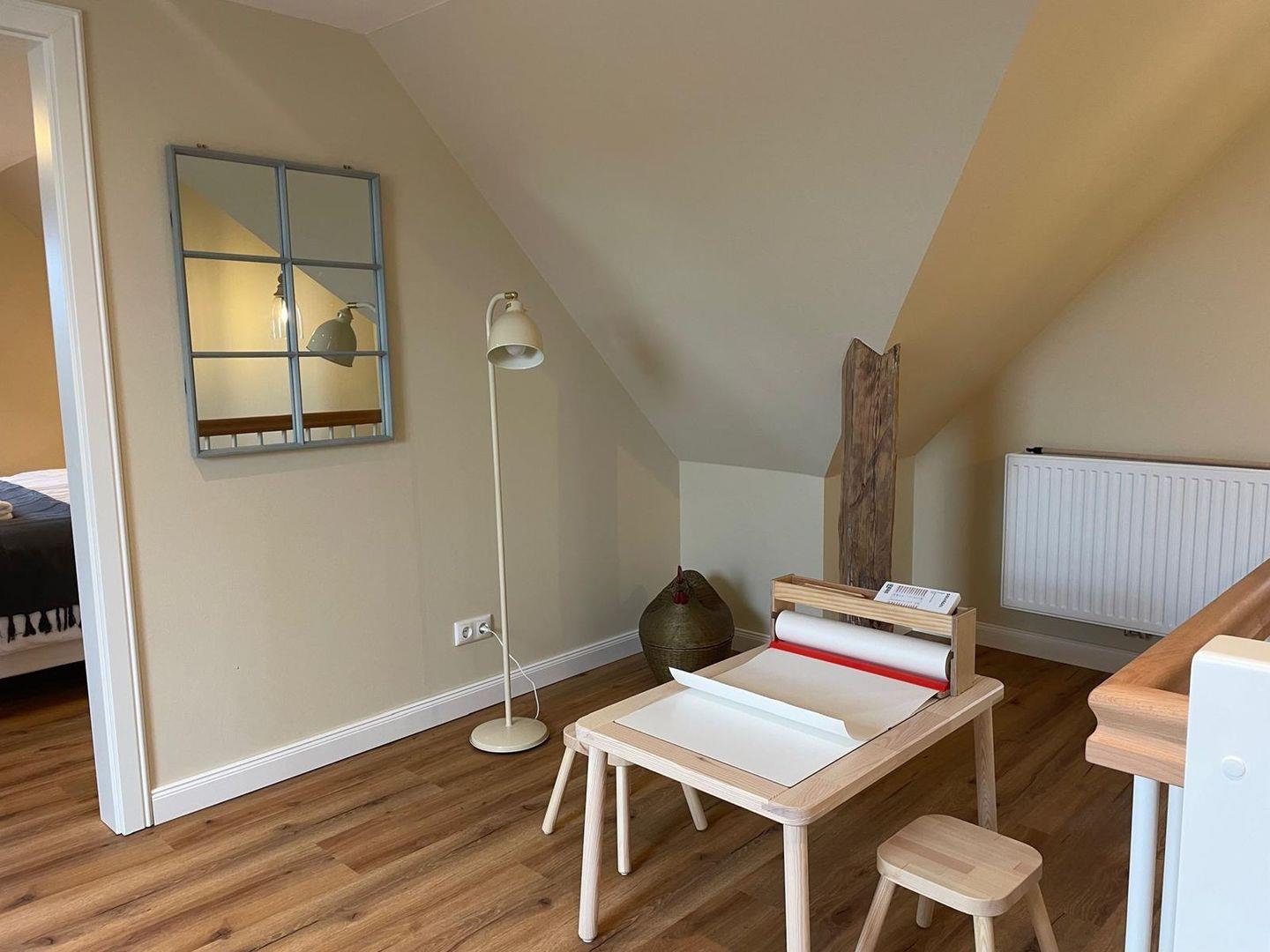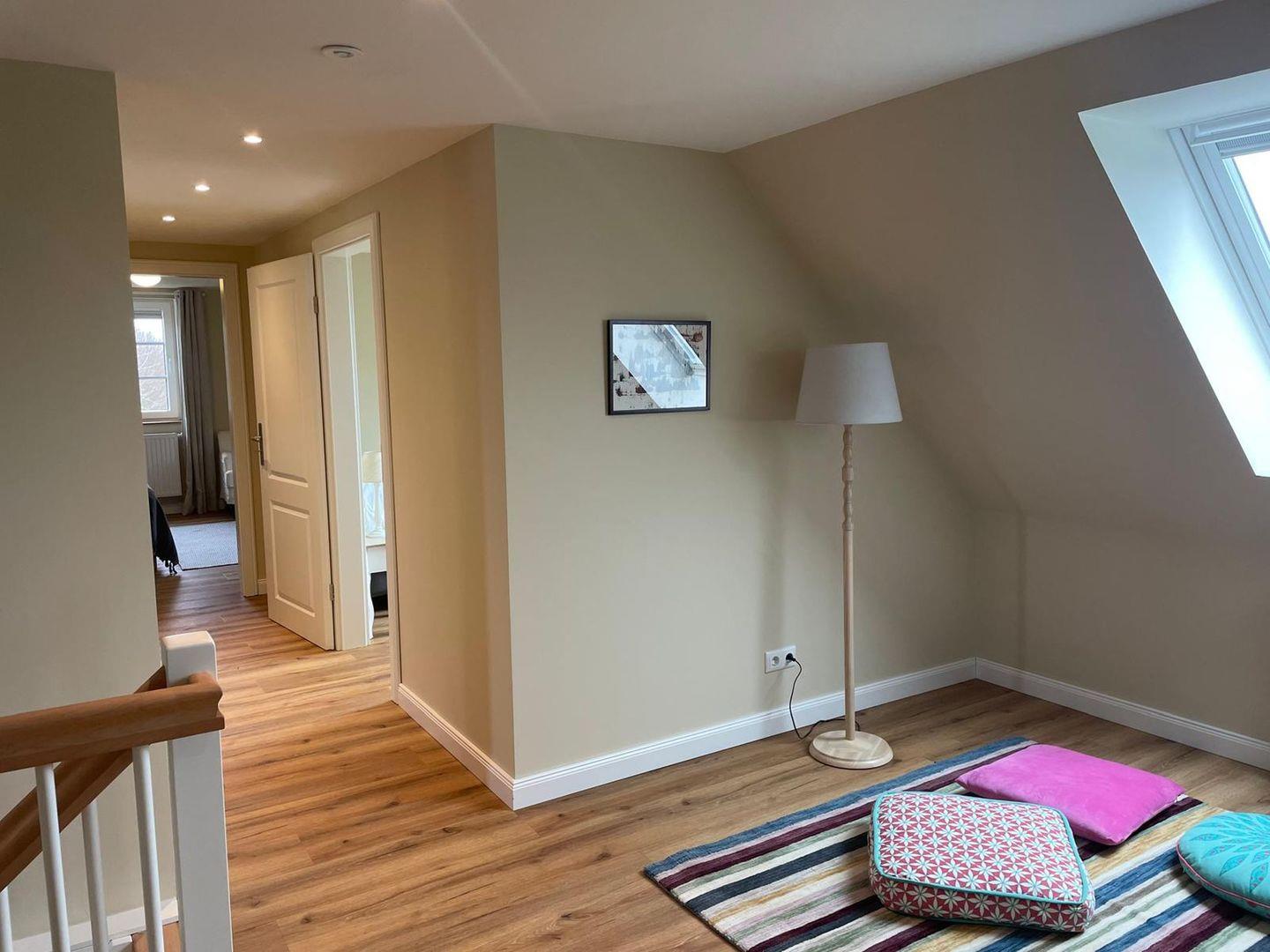 Im Obergeschoss bietet das großzügige Landing Platz zum Spielen für Kinder oder zum Zurückziehen mit einem guten Buch. Das Schlafzimmer ist als ruhiger Rückzugsort gestaltet und verfügt über einen Schreibtisch – ideal für alle, die Arbeit und Erholung verbinden möchten.