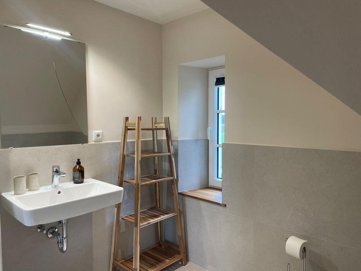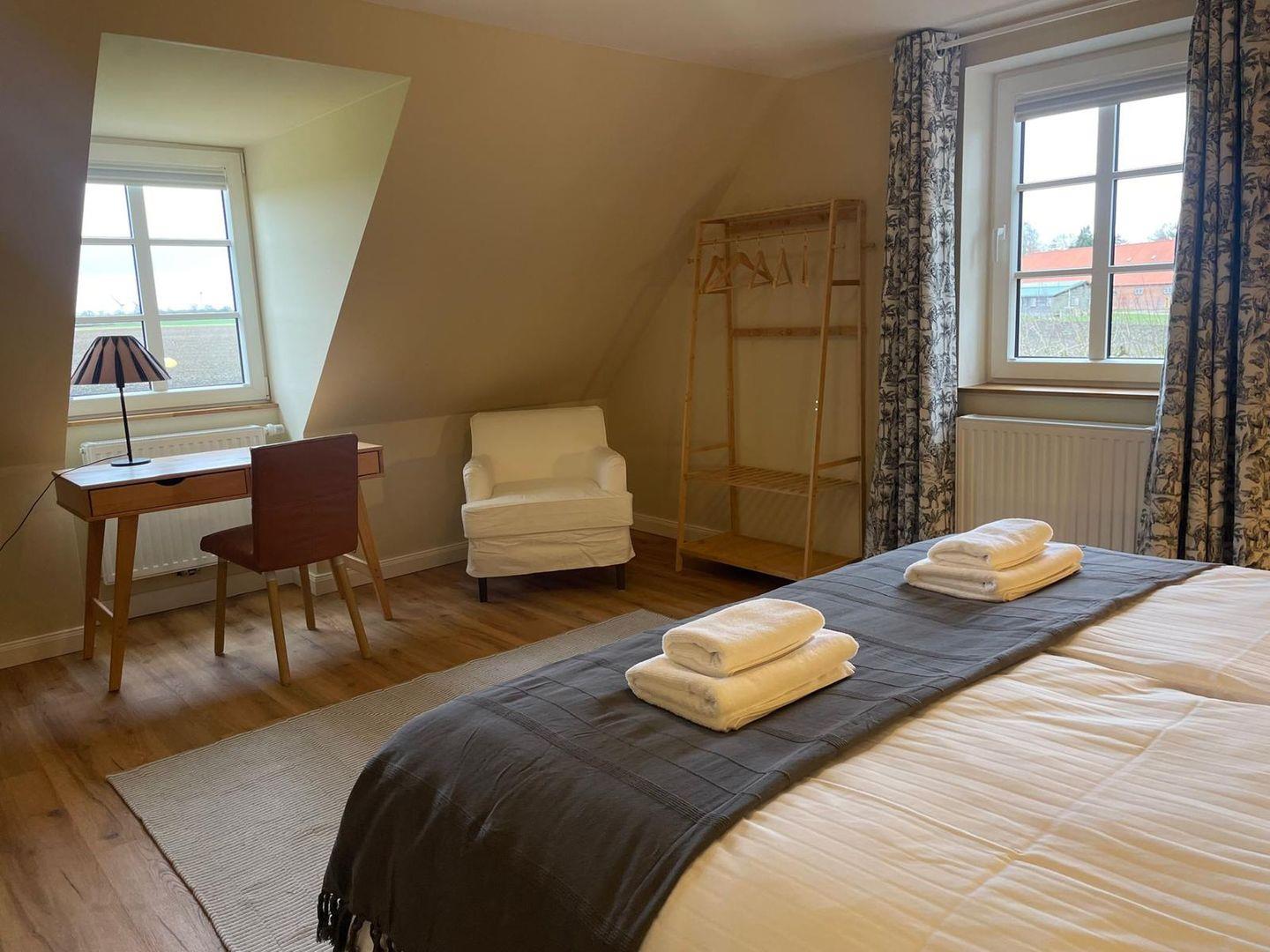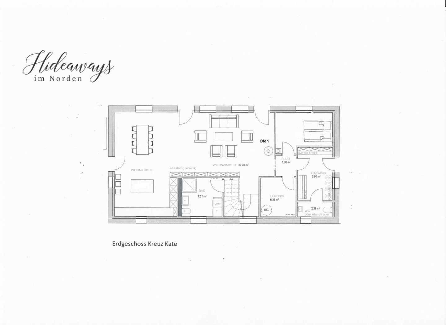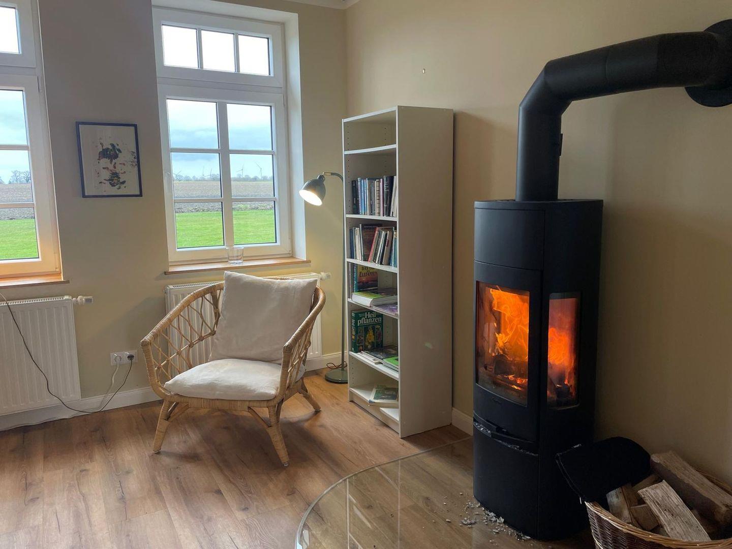 Das frisch renovierte Haus überzeugt durch warme Farben und eine hochwertige Ausstattung. Der Wohnbereich mit Kaminofen bildet das Herzstück der Kreuzkate und lädt zu entspannten Abenden ein. Große Fenster öffnen den Blick in die Landschaft und holen die Natur ins Haus.
