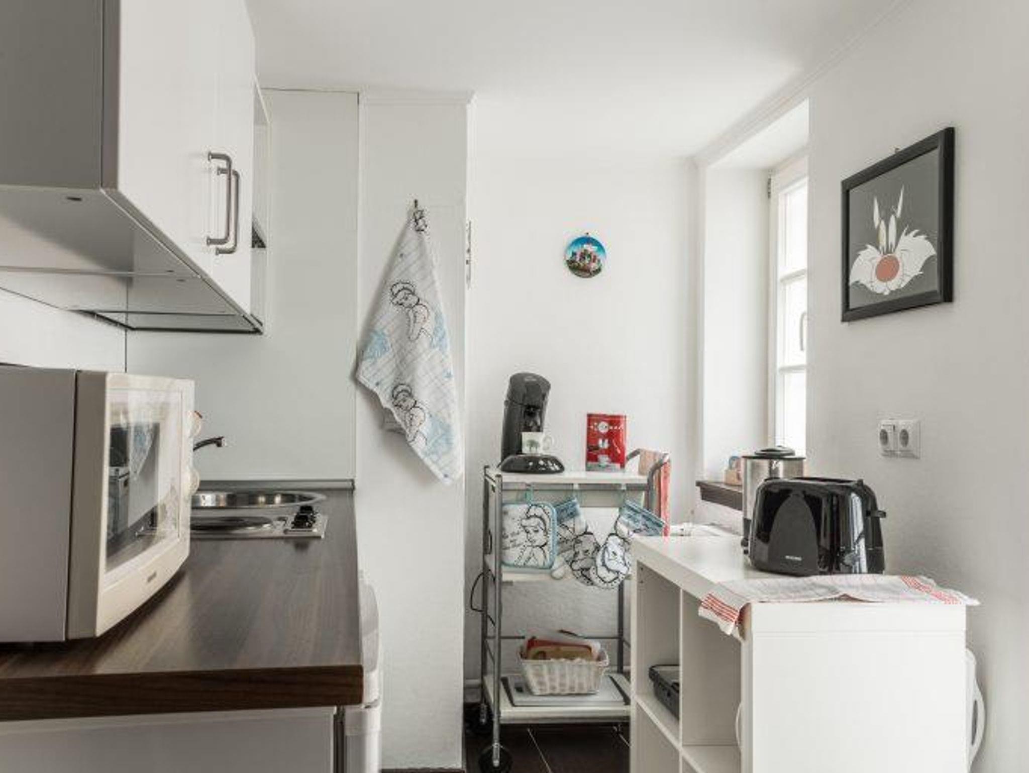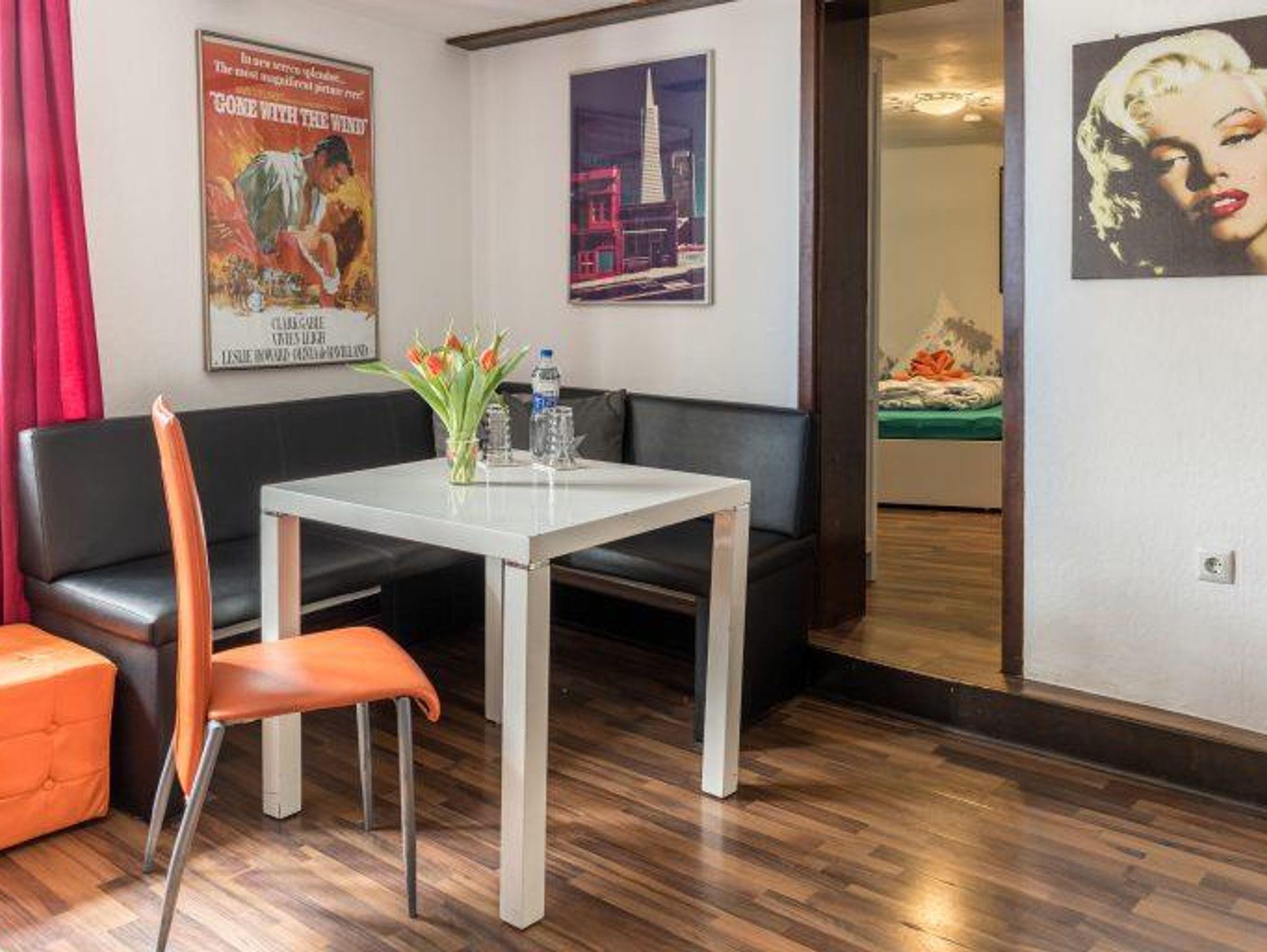 Alle Küchen sind vollausgestattet: Senseo-Kaffeemaschine, Wasserkocher, Herd mit zwei Platten, Besteck, Gläser, Teller, Töpfe, Pfannen, Geschirrtücher, Spülmittel, Kühlschrank mit Gefrierfach. Kaffee, verschiedene Teesorten, Milch und Zucker sowie Gewürze und Salz zum Kochen stehen in allen Suiten zur Verfügung. Der Essbereich bietet Ihnen einen Esstisch mit ausreichend Sitzgelegenheiten.