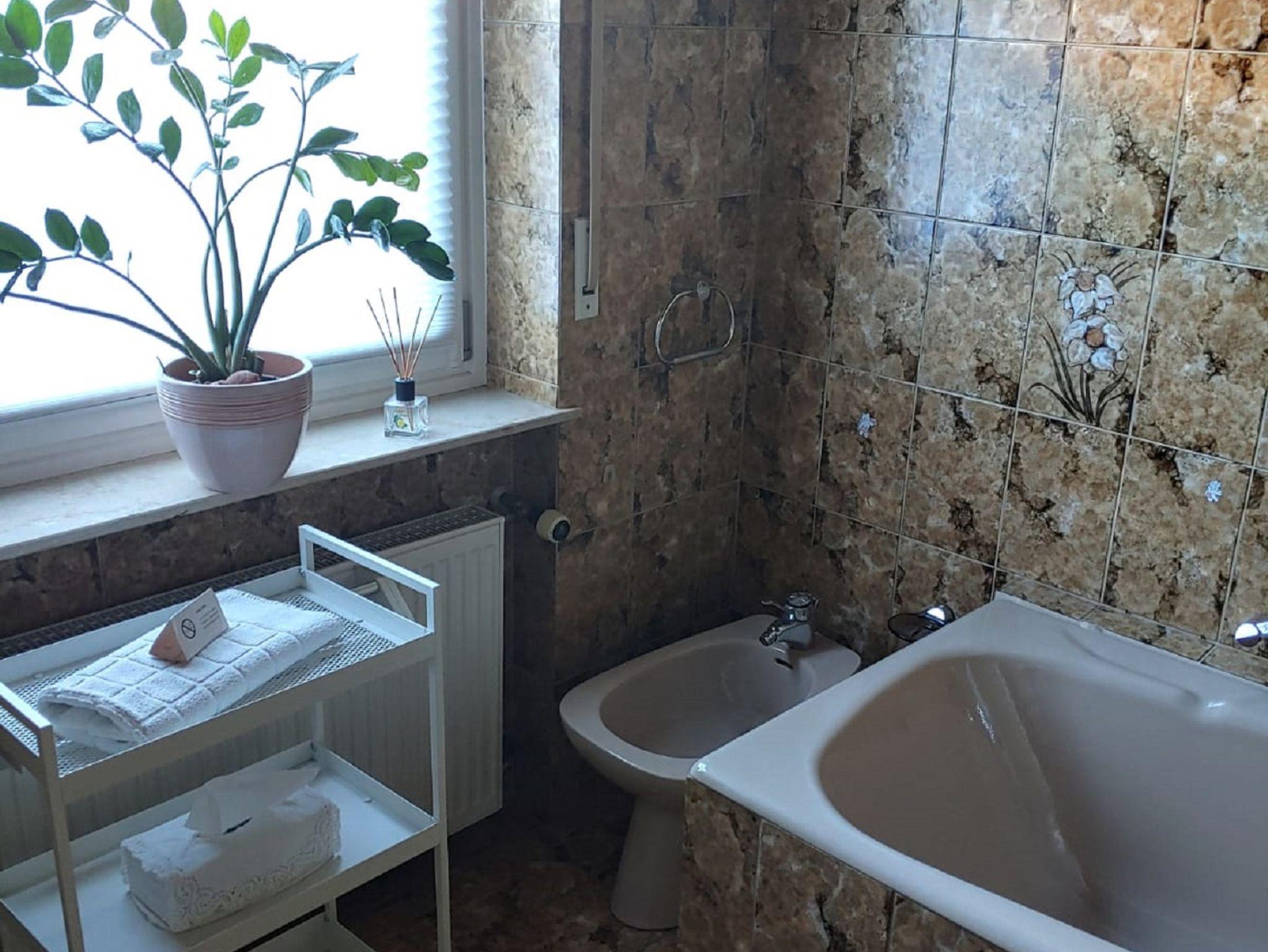(2 Personen) und einen Schreibtisch. Im 2. Zimmer ist ein Bockspringbett mit offenem Fußteil, mit großem Kleiderschrank, 1 Tisch mit 2 Stühlen. Im 3. Zimmer ist ein Doppelbett mit einem passenden Kleiderschrank. Daneben liegt das große Badezimmer mit 2 Einzel-Waschbecken und 2 runde Spiegel, 1 Toilette, 1 Dusche, 1 Badewanne und ein Bidet. Im Eingangsbereich finden Sie ein separates Gäste-WC.