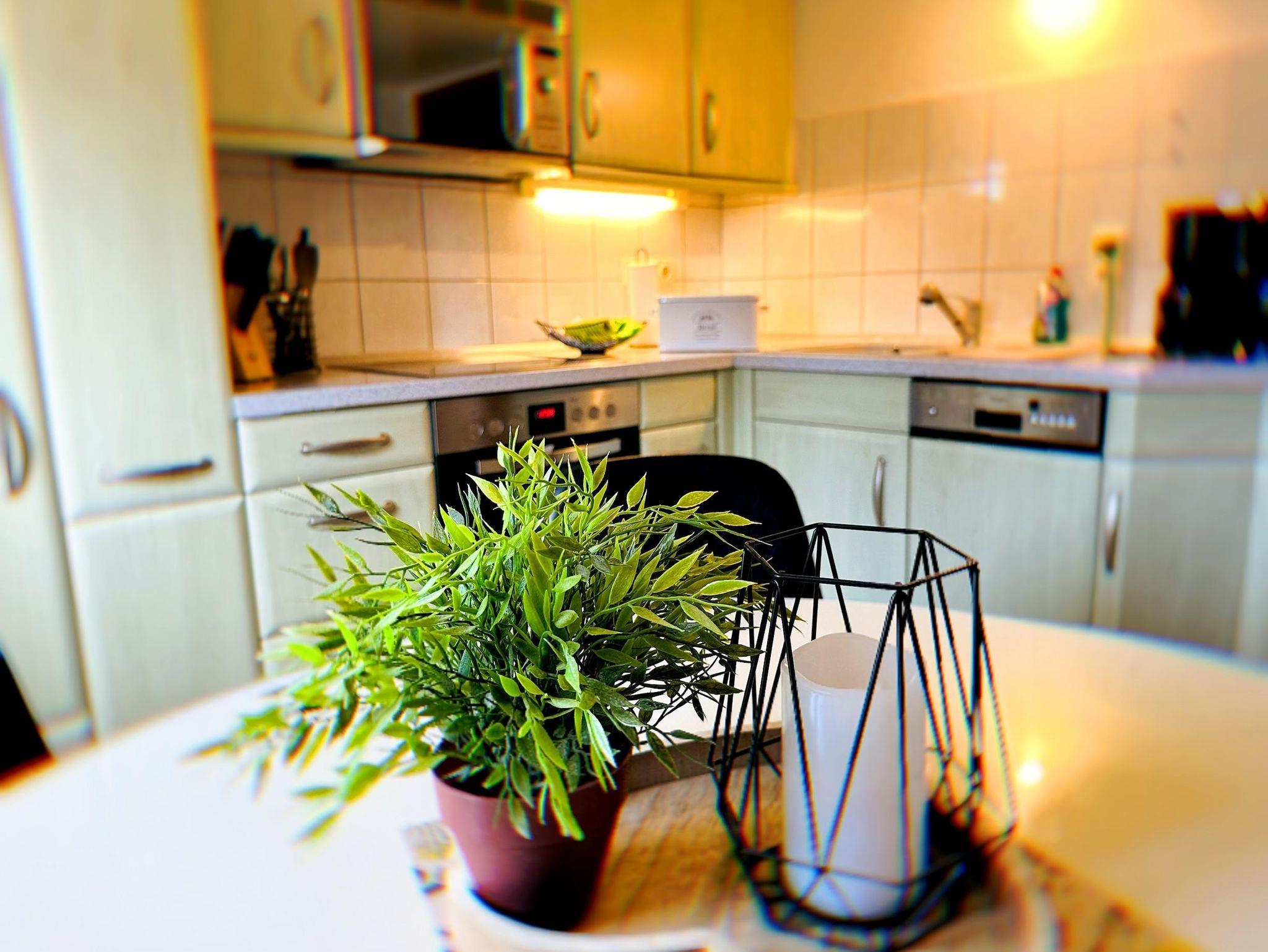 Küche mit Ceranfeld, Backofen, Mikrowelle, Geschirrspüler, Toaster, Wasserkocher, Kaffeemaschine, Mixer