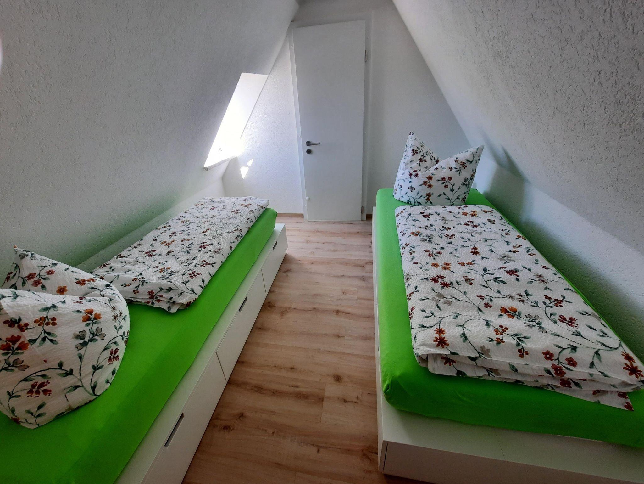 Eine steile Treppe führt ins zweite OG. Dort befindet sich ein Doppelzimmer und ein kleines Zimmer mit zwei