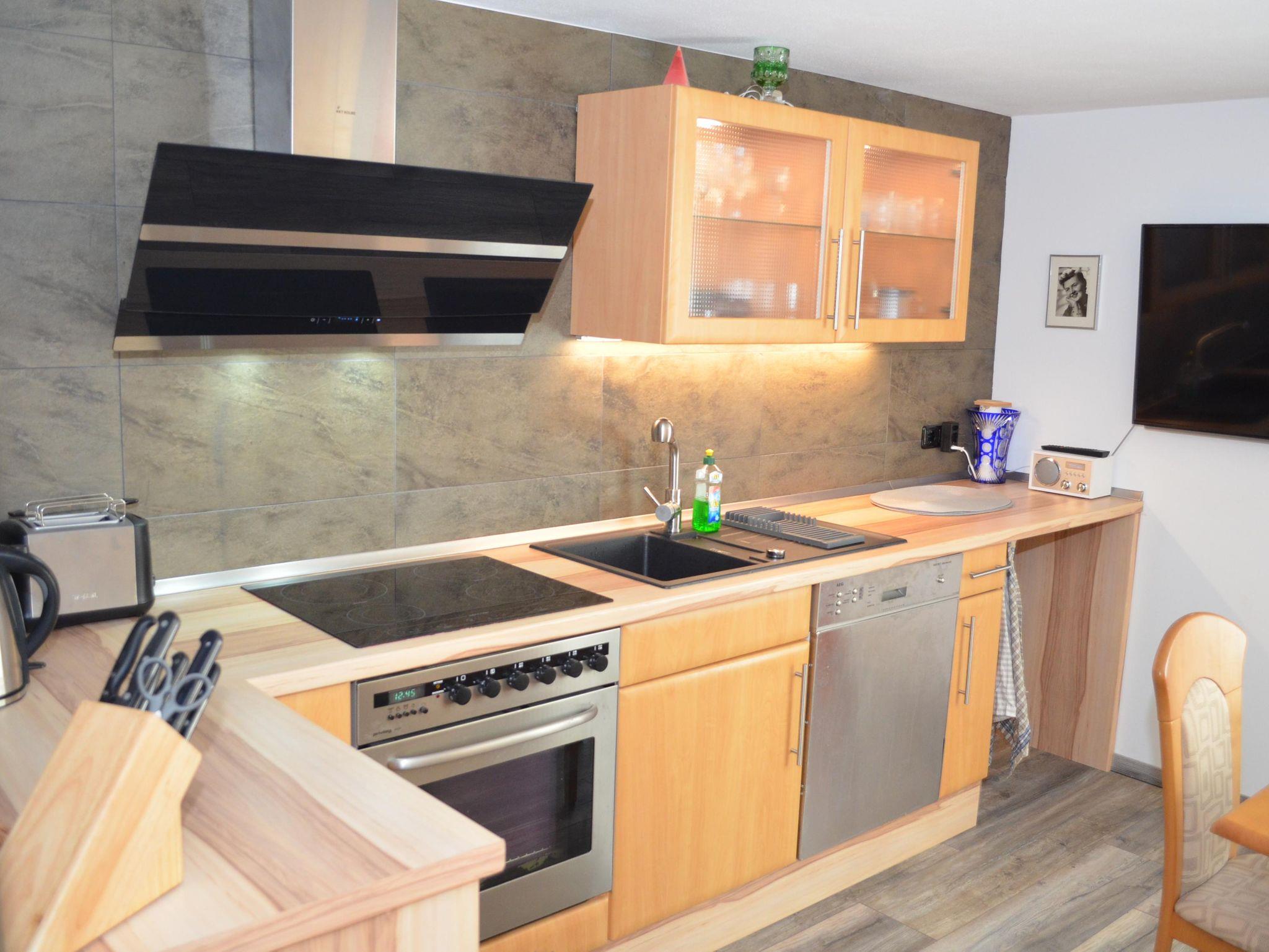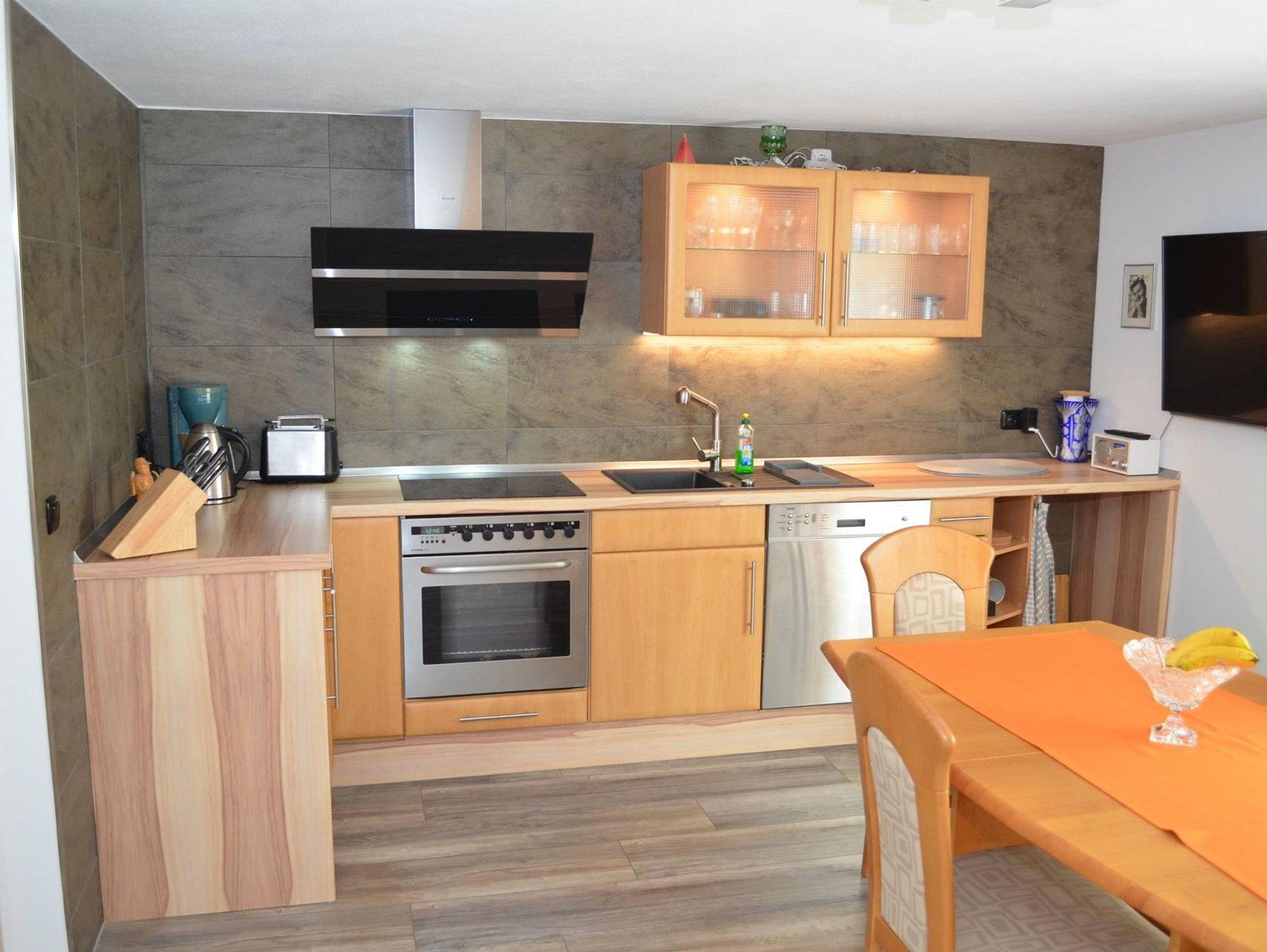 Die moderne Wohnküche ist mit Kühlschrank, Geschirrspüler, Induktionsherd, Mikrowelle, Geschirr, Toaster, TV, Kaffemaschine und Wasserkocher voll ausgestattet.