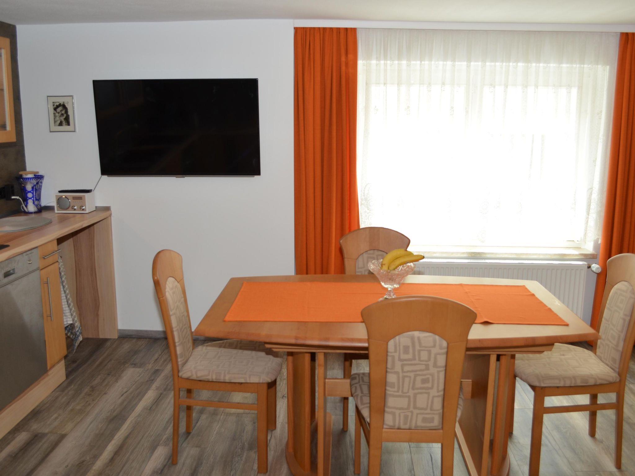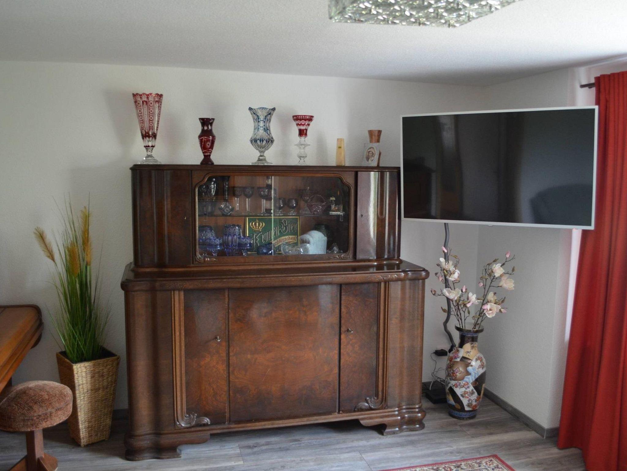 Im Wohnzimmer befindet sich eine gemütliche Sitzecke, TV und ein Klavier.