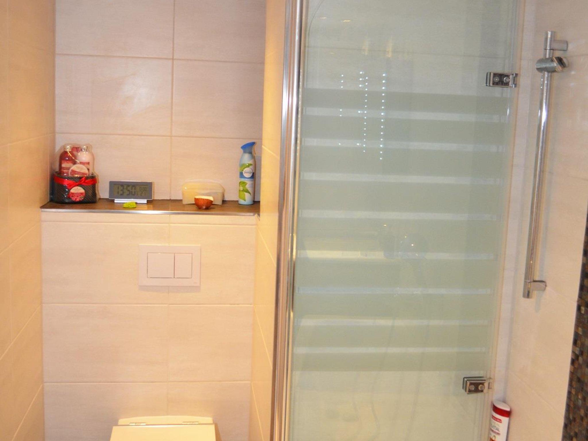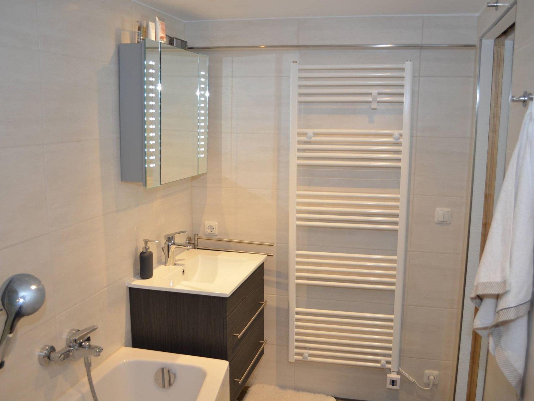 Bad I verfügt über Waschbecken, WC und eine Badewanne mit Duschwand.