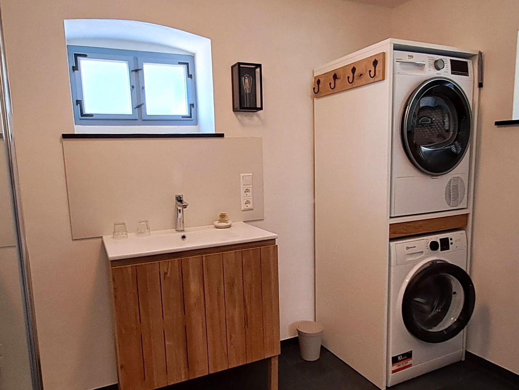 Unser Badezimmer mit bodengleicher Dusche, Waschbecken, Toilette, großem Spiegelschrank, Waschmaschine und Trockner lässt keine Wünsche offen. Damit es nie eng wird, steht ein zweites, separates WC zur Verfügung.