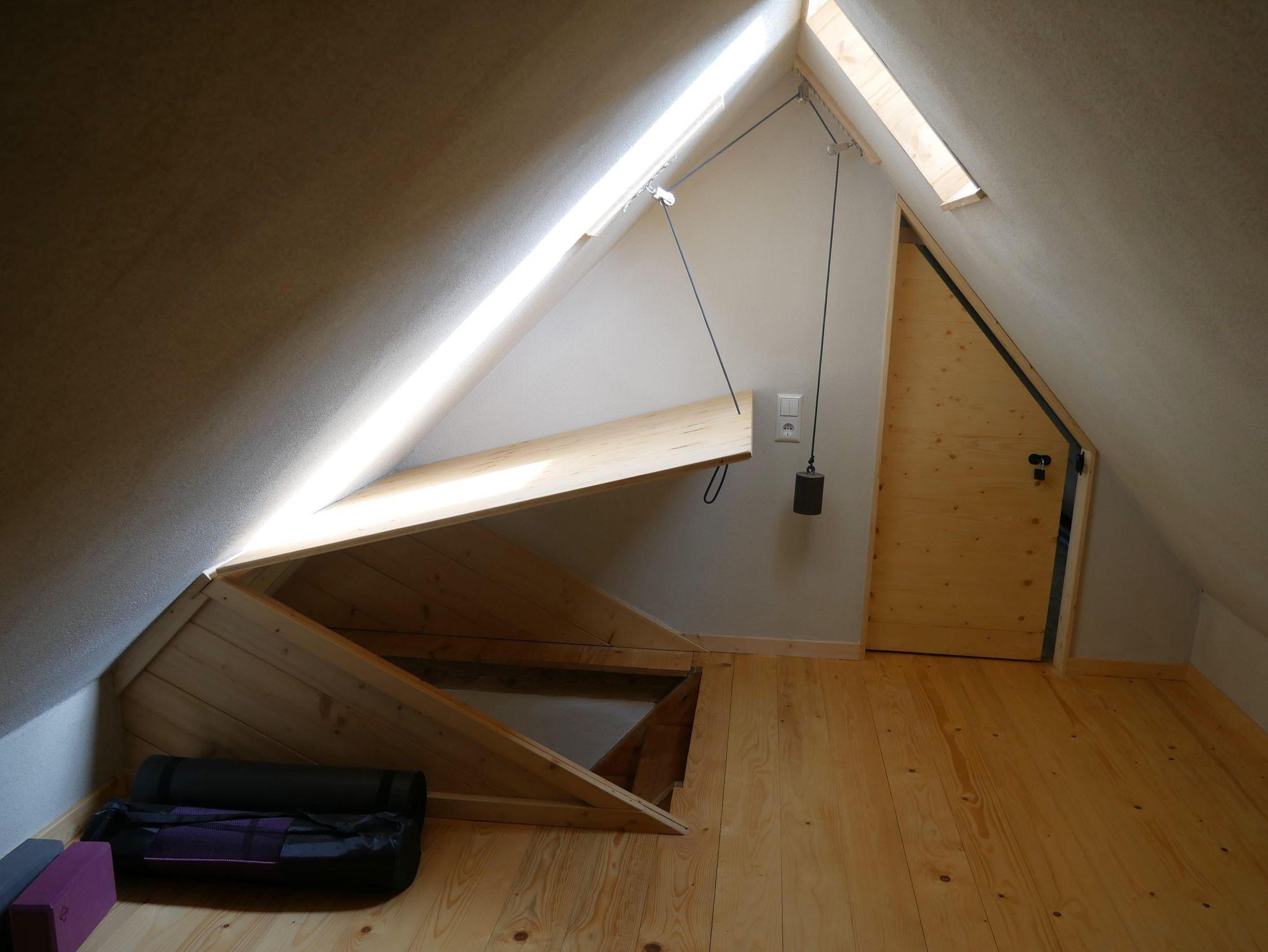 Zusätzlich gibt es einen Rückzugsort im Spitzboden (Höhe 178 cm) mit drei Sitzsäcken, kleinem Tisch und 2x Yogaausstattung.