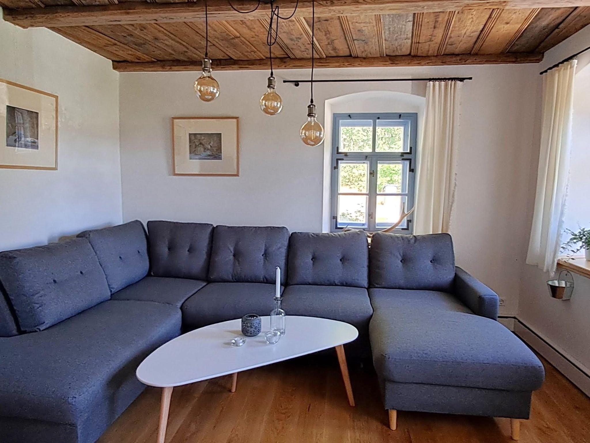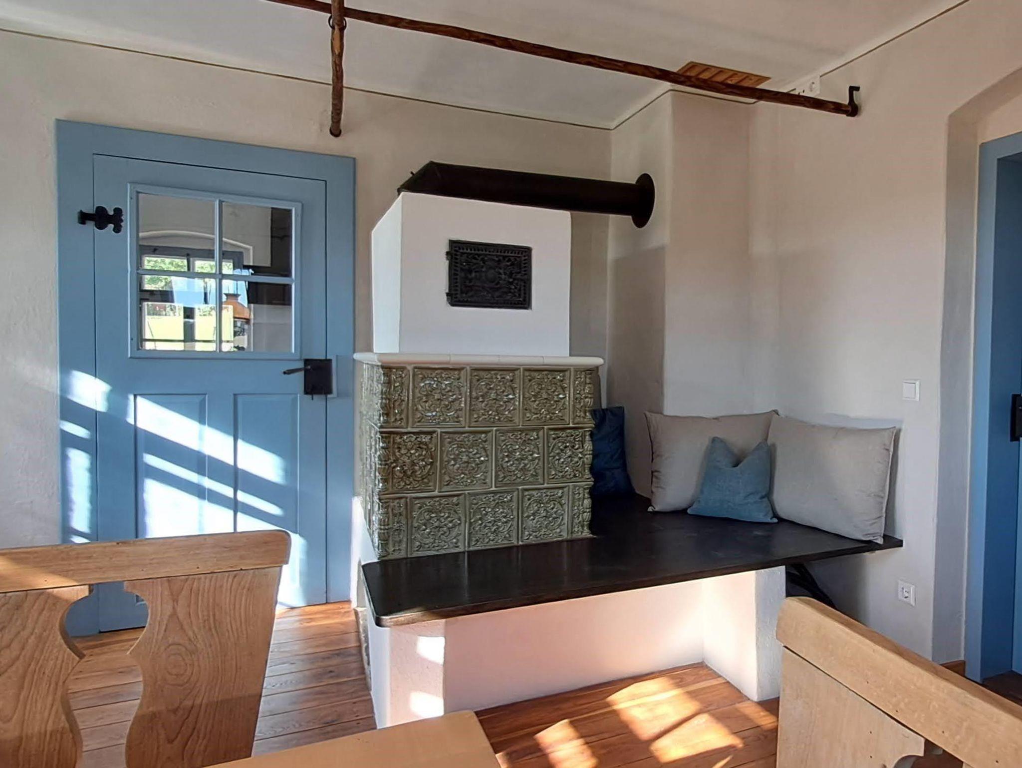 Gleich neben der hellen, modernen und voll ausgestatteten Küche mit wunderschönem, historischem Kachelofen, befindet sich das Esszimmer mit zweitem Ofen und urgemütlichen Sitzgelegenheiten. Außerdem gibt es hier einen Lesesessel neben dem Bücherregal.