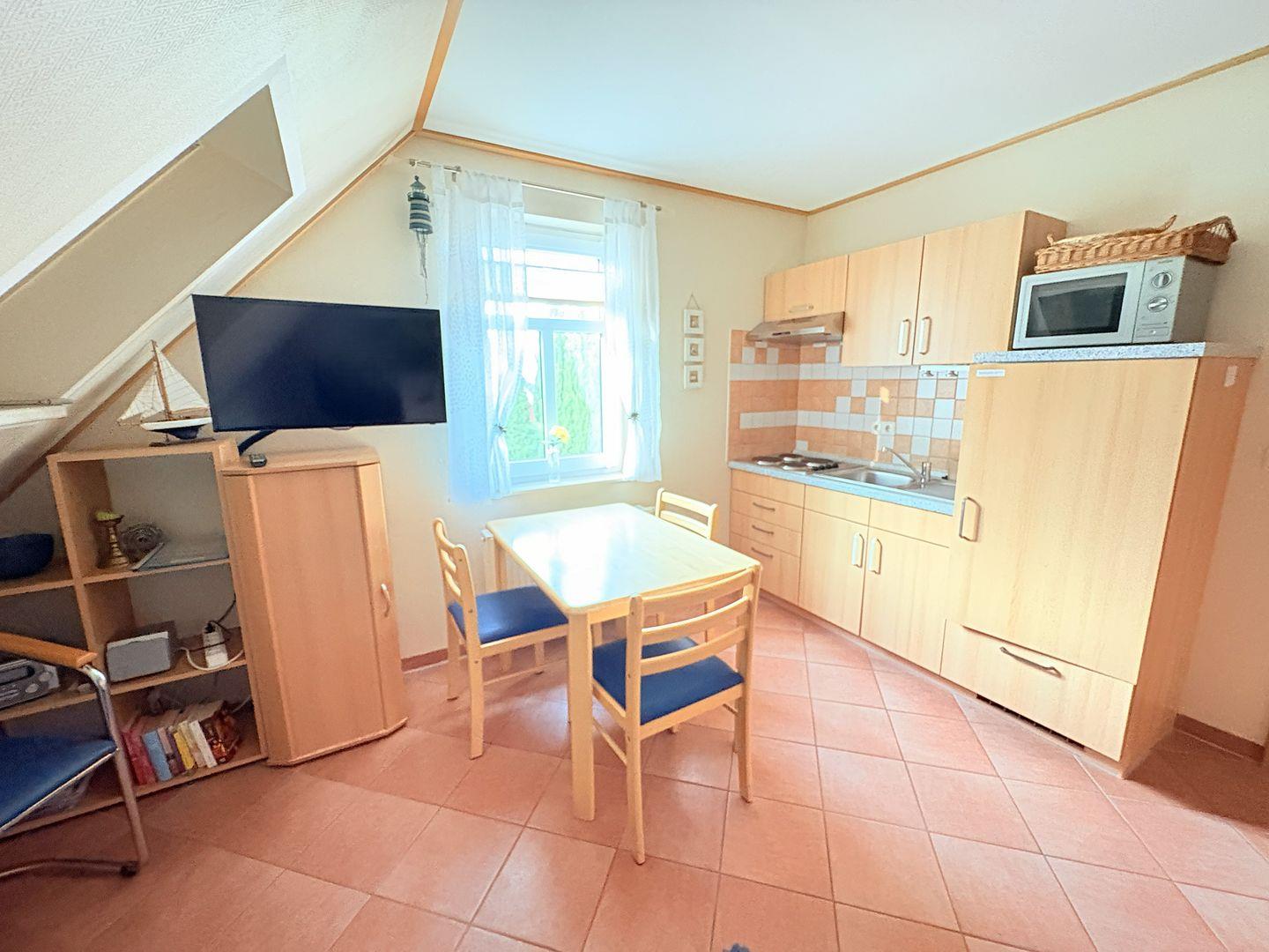 Wohnung 1 für 2 Personen, im ersten Obergeschoss gelegen, bietet auf 32 m² ein offenes, lichtdurchflutetes Wohnzimmer mit integrierter Küchenzeile und Essecke. Das gemütliche Schlafzimmer ist mit einem Doppelbett ausgestattet.
