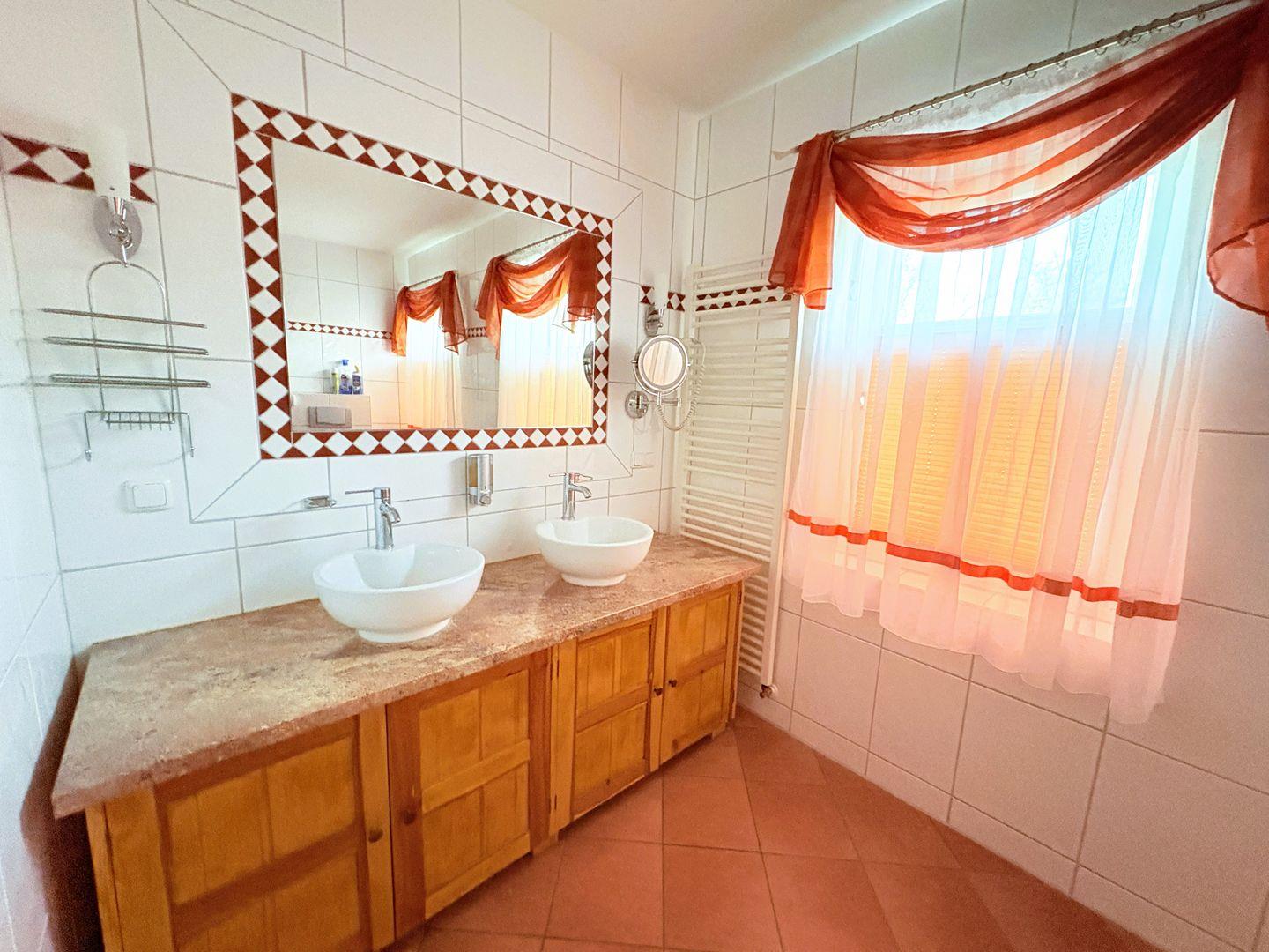 Großes Badezimmer mit Eckbadewanne, Doppelwaschbecken, Dusche und WC