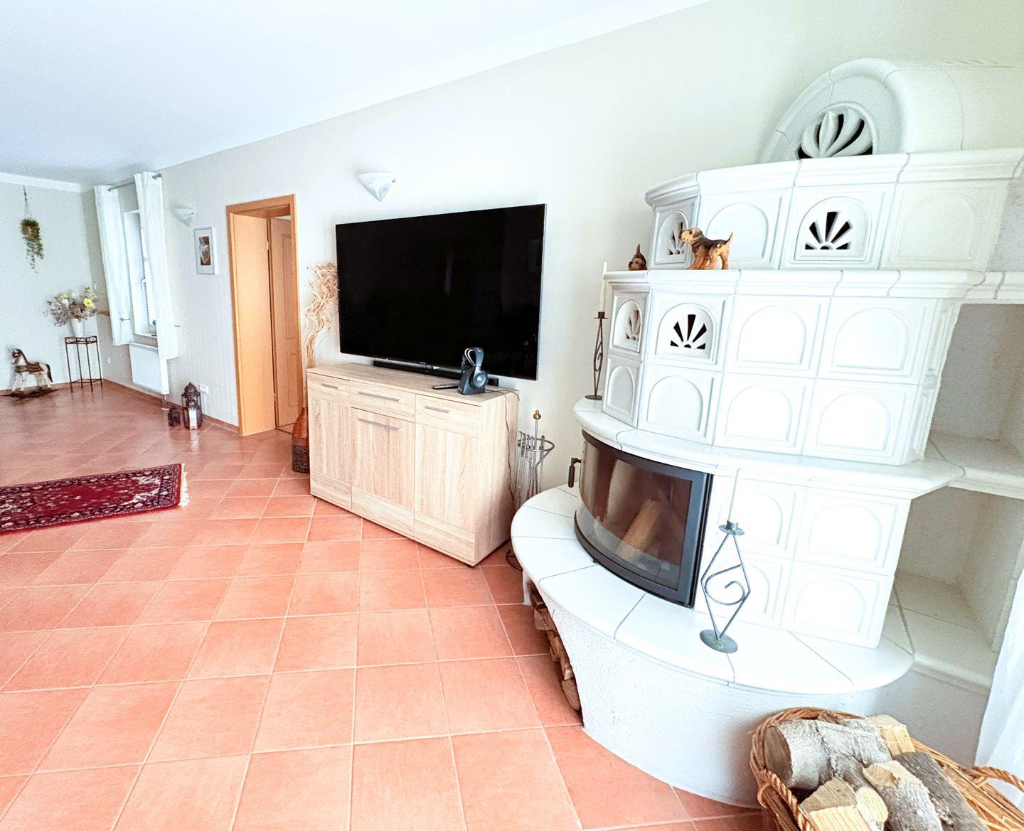 Großer Wohnbereich mit gemütlichem Kamin, TV, Radio sowie einer stilvollen Sitz- und Essecke
