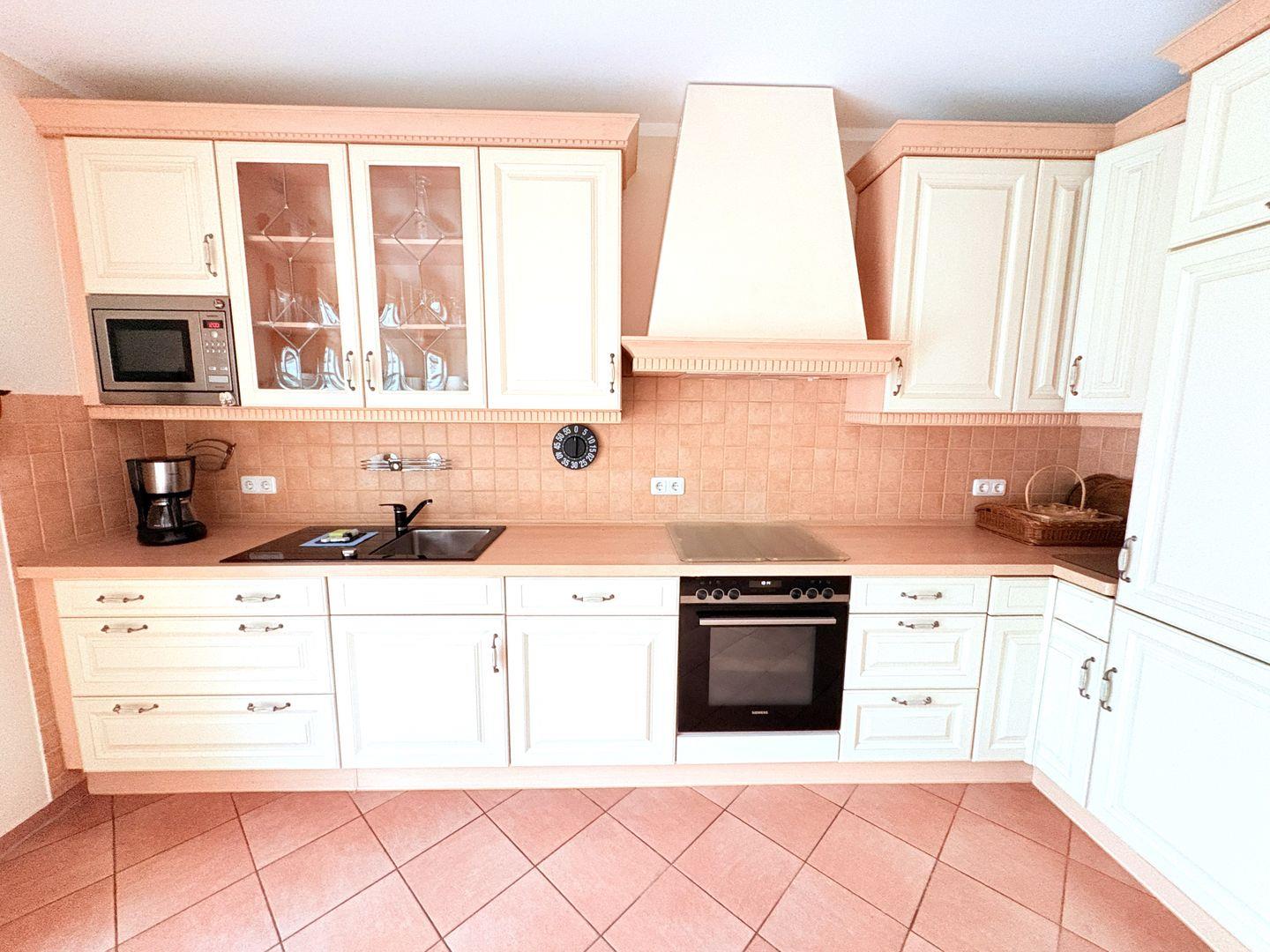 Moderne Landhausküche mit Esstresen, Geschirrspüler, Backofen, Mikrowelle, Kühl-Gefrierschrank u.v.m.