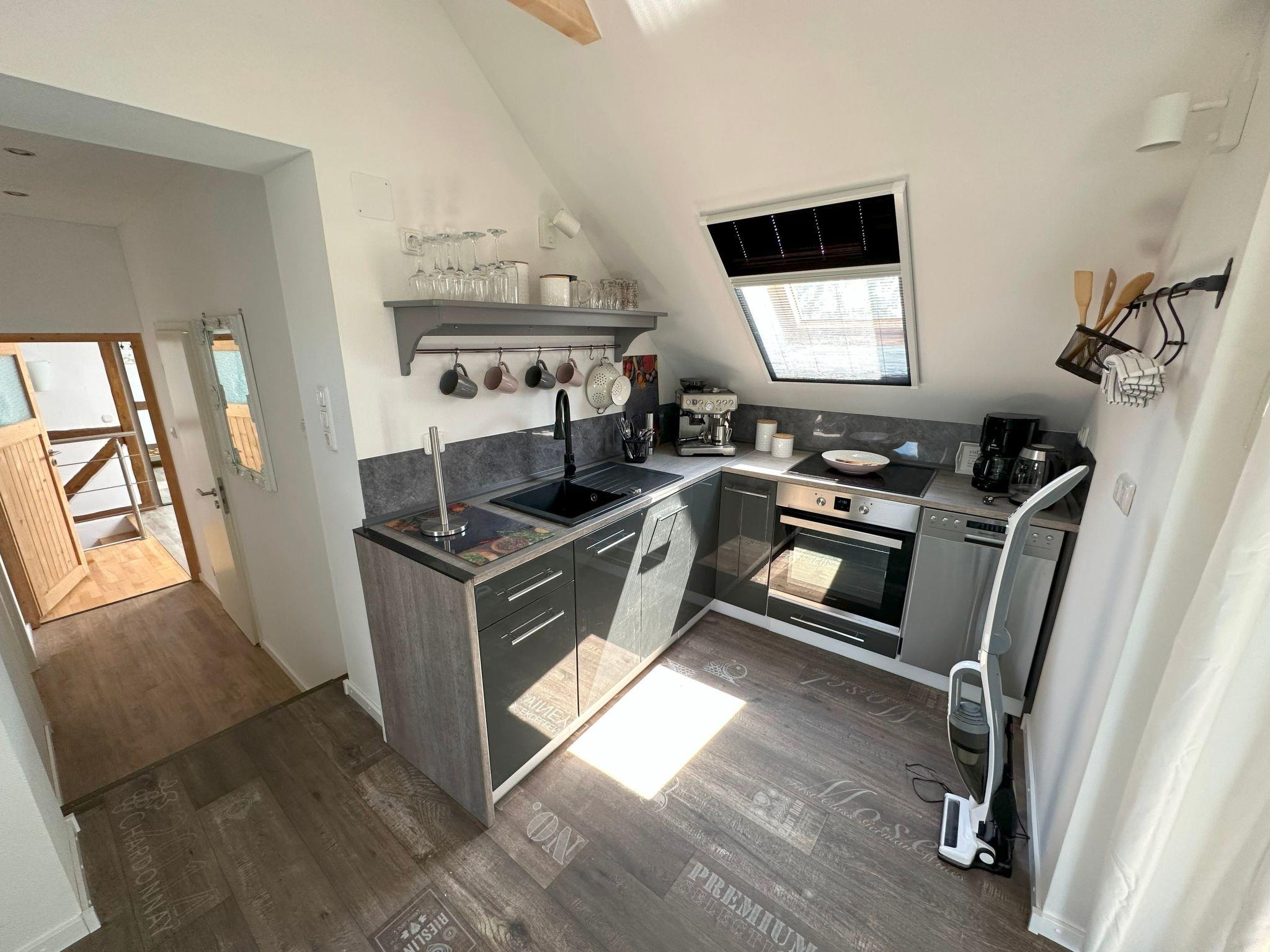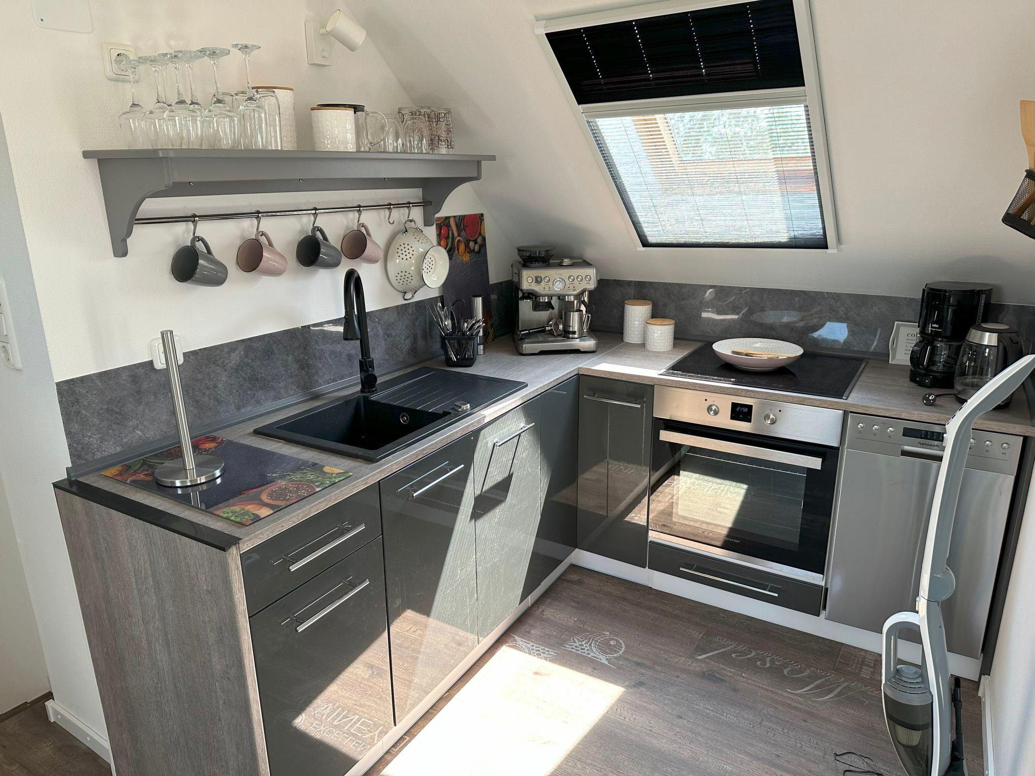 Inside the flat, modern furnishings are a top priority. A cosy 160 cm wide bed in the bedroom invites you to dream, while the fully equipped kitchen with large fridge, freezer compartment, filter coffee machine and dishwasher leaves nothing to be desired. The bathroom has a shower, WC and wash hand basin. A large flat-screen TV provides entertainment. In addition, all roof windows have pleated blackout blinds and fly screens for your comfort.