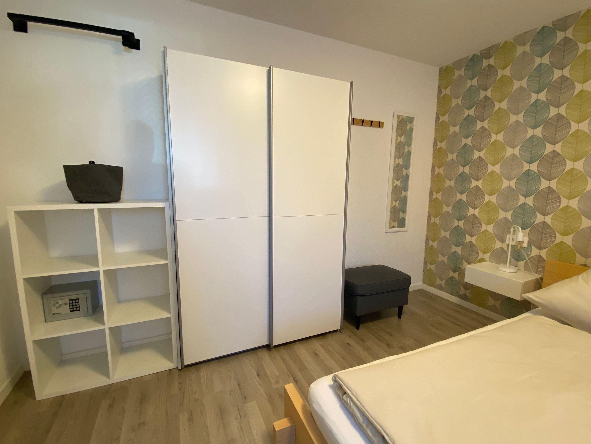 Das Schlafzimmer: Futon Bett 1,60 m x 2,00 m / Bettwäsche pro Person inkl. / Kleiderschrank / verschiedene Ablagemöglichkeiten / Ein kleiner TV ist vorhanden.